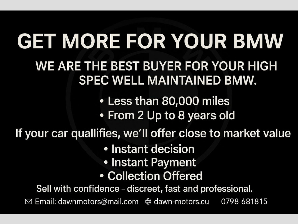 SOLD- GET MORE FOR YOUR BMW. WE ARE THE BEST BUYER FOR YOUR HIGH SPEC WELL MAINTAINED BMW. •Less than 80,000 miles•From 2 Up to 8 years oldIf your car qualifies, we'll offer close to market value with:•Instant decision•Instant Payment • 7 Days a Week • Collection OfferedSell with confidence discreet, fast, and professional . Email: dawnmotorsmail.com Website: dawn-motors.co.uk Text/WhatsApp: 07983 681815 m sport plus package, loudspeaker system - harman kardon, 19in alloy wheels - m double spoke style - 442m, M Sport braking system, enhanced bluetooth telephone preparation with usb audio interface and voice control, door mirrors - folding - automatically dimming, lumbar support - driver and front passenger, Sun protection glazing, air breather - body colour, interior trim - brushed aluminium trim finishers with pearl chrome highlight, dakota leather - black with black interior, 12v power socket in front centre console and passenger footwell, 18in alloy wheels - m double spoke - 400m, 3.5mm auxiliary input point in centre console for auxiliary playing devices, 6.5in colour display screen, air breather - black high gloss, air conditioning - automatic - dual zone, Air conditioning and radio control panel in high gloss black, airbags, alarm system - thatcham 1 with remote control and engine immobiliser, ambient lighting - switchable bmw classic orange - cold white - led, armrest - front - folding with storage compartment, armrest - rear centre with two cupholders, Automatically dimming rear view mirror, BMW ConnectedDrive online services, BMW emergency call, bmw professional radio with single cd player - with mp3 playback compatibility, BMW Teleservices, battery safety cut off, bluetooth hands-free facility with usb audio interface and audio streaming, bottle holders integrated into door trim storage compartments - front - up to 1 litre, brake pad wear indicator - front and rear, bumper system - front and rear, central locking switch - doors - fuel filler cap - luggage compartment, check control warning system for monitoring of lights and door-luggage compartment open warning, child seat isofix attachment - rear with passenger airbag deactivation, Concierge service, Condition based service, Crash sensor, Cruise control with brake function, cup holders - two in front with sliding lid, DAB Digital radio, dsc - dynamic stability control plus, direction indicator - side repeaters - integrated in exterior mirrors, direction indicator lights - clear lenses, door mirrors - electric and heated, door sill finishers - m designation, drive performance control - eco pro - comfort - sport - sport plus, Dynamic brake lights, electric windows - front with open-close fingertip control - anti-trap facility and comfort closing function, exhaust tailpipes - dual left - with chrome finisher, extended lighting, Exterior parts in body colour, exterior trim - high-gloss shadowline, First aid kit and warning triangle, floor mats - velour, fog lights - front and rear, Full black panel display, Glove compartment, glove compartment - opener with chrome trim, handbrake lever - gear knob in leather, headlight wash, headlining - anthracite, heat protection glazing with green tint, High level third brake light, integrated rear seat headrests - two, interior lighting - front centre over interior mirror with soft-light and rear centre, interior trim - aluminium hexagon trim finishers with estoril blue matt highlight, kidney grille - chrome with extra wide black - high gloss vertical slats, led tailights, lights-on warning by audio warning signal when ignition is switched off, luggage compartment - lashing eyes, luggage compartment - light, M aerodynamic bodystyling, M Sport instrument cluster, m sport multi-function leather steering wheel - three-spoke, m sport package, M sport suspension, media package - bmw professional, mobility tyre sealing system, Model designation, Navigation system - BMW Professional multimedia, non smokers package, obc - on-board computer, oil sensor for level and grade - warning by check control system, pdc - park distance control - front and rear, Personal Profile, power steering - electric, Rain sensor with automatic headlight activation, Real time traffic information, rear suspension - five-link, remote control with integrated key with insert in blue, remote services, Run flat tyres, Seat belt security check for driver, seat heating for driver and front passenger, seatbelt handover for driver and front passenger, seats - 60-40 split folding rear, servotronic, shark fin, side armrests - front and rear integrated into door trim, side exterior m designation badges, Side impact protection, Sport automatic transmission, sport seats - front, start-stop button with comfort go keyless engine start and auto start-stop deactivation button, steering column with manual reach and rake adjustment, storage compartment - rear centre console, sun visors with vanity mirrors and ticket holder, suspension - front aluminium, three-point seat belts - all seats, Toolkit located in luggage compartment, Twin horns, tyre pressure monitor with a three-level warning strategy, tyres - reduced rolling resistance, visible vin, Welcome light, windscreen washer jets - heated, windscreen wipers - two-speed with adjustable intervals, windscreen with grey shade band, Xenon headlights, idrive controller - 8 favourite buttons