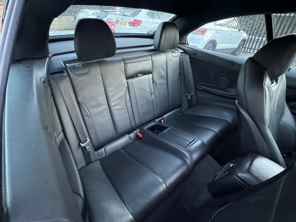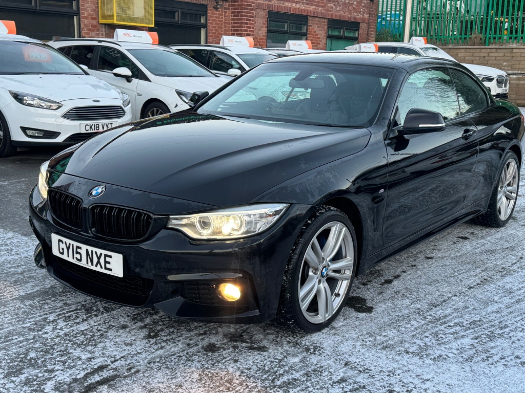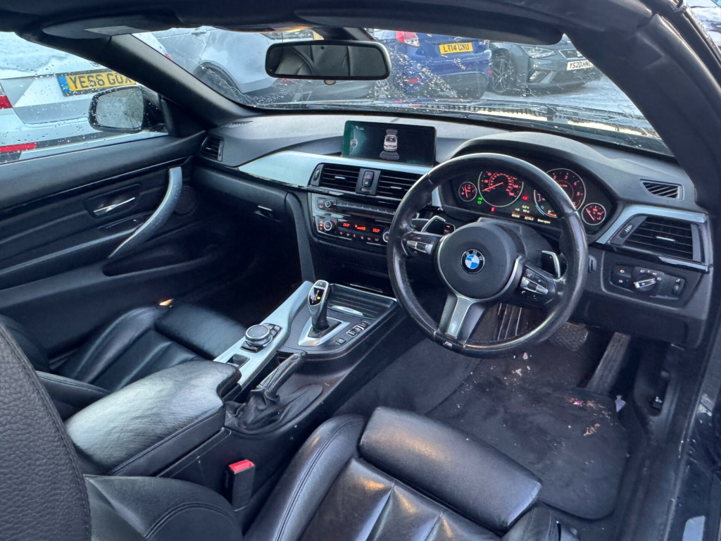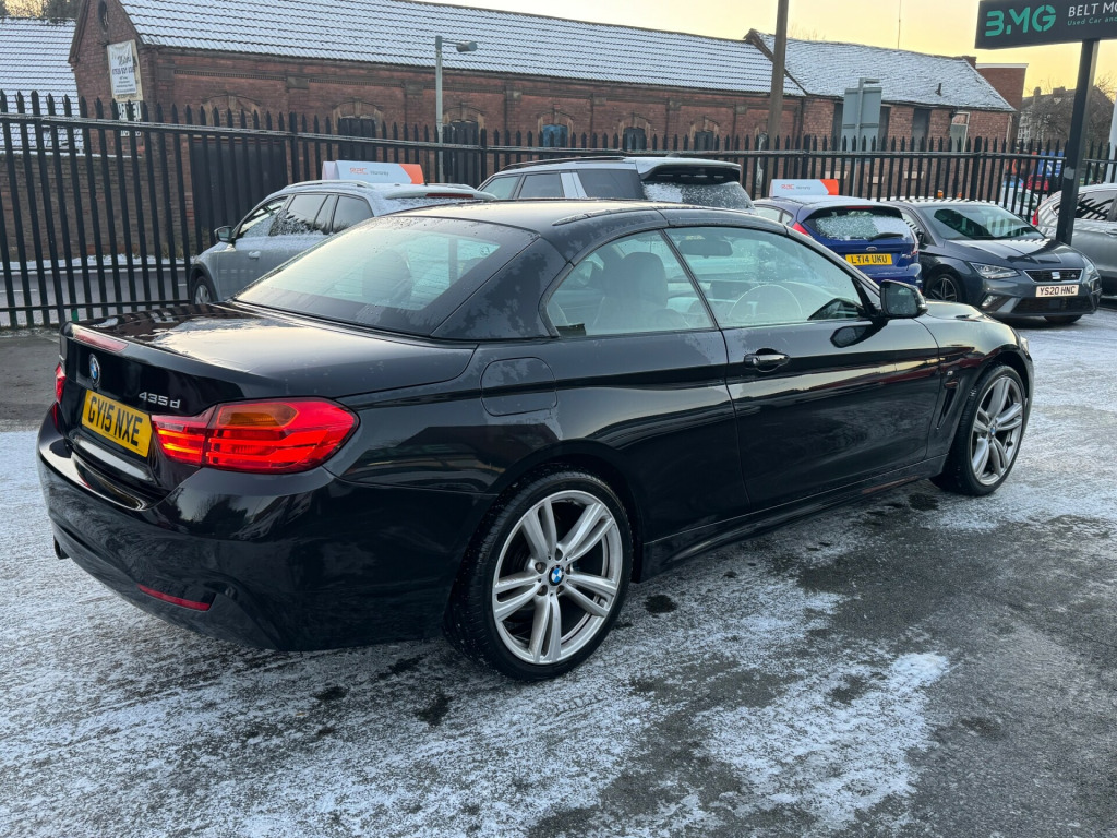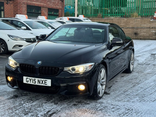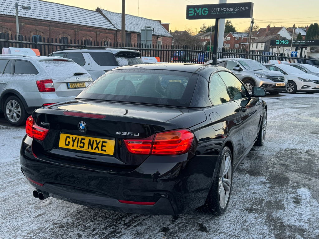 INDOOR HEATED VIEWING AVAILABLE AND 4K WALK AROUND VIDEOS AVAILABLE UPON REQUEST.FREE 12 MONTHS RAC GOLD WARRANTYFREE 12 MONTHS RAC ROADSIDE ASSISTANCESERVICE HISTORYThis 2015 BMW 4 Series 3.0 435d M Sport Convertible 2dr Diesel Auto xDrive Euro 6 (s/s) (313 ps) has covered 90000 miles and is ULEZ compliant, making it a reliable and environmentally friendly choice. With its sleek convertible design, 4 seats, and 2 doors, this vehicle offers both style and practicality. The powerful diesel engine and Sport Automatic Transmission ensure a smooth and efficient driving experience. It comes equipped with impressive features such as 19in Alloy Wheels, Black Sapphire exterior, and Interior Trim Finisher in Black High Gloss, providing a touch of luxury and sophistication. The brushed aluminium interior trim adds a modern and elegant touch to the cabin. With its sleek design and advanced features, this BMW 4 Series is a standout option for those seeking a high-performance convertible. v power socket - centre console, 12v power socket - passenger footwell, 20gb memory, auxiliary input, bmw apps interface, bmw connecteddrive online services, bmw emergency call, bmw professional radio - single cd and mp3, bmw remote services, bmw teleservices, bluetooth hands free with audio streaming, bluetooth hands free with usb audio interface, dab digital radio, display - 8.8in colour screen, full black panel display, information plus, media package - bmw professional, navigation system - bmw professional multimedia, real time traffic information, speakers x6, 18in alloy wheels - m double spoke - 400m, air breather - black high gloss, bumpers - body colour, door handles - body colour, door mirrors - body coloured, door mirrors - electric and heated, door mirrors - integrated indicator side repeaters, electric windows - front and rear with open-close fingertip control, exhaust tailpipe - chrome - dual - round - left, exterior trim - high-gloss shadowline, heat protection glazing with green tint, heated windscreen washer jets, kidney grille - chrome extra-wide high-gloss black vertical slats, m aerodynamic bodystyling, m sport package, roof - retractable hard top, roof mouldings - body colour, run flat tyres, side exterior m designation badges, tyres - reduced rolling resistance, windscreen with grey shade band, abs - anti lock braking system, asc - automatic stability control, airbags - curtain, airbags - driver, airbags - front side, airbags - passenger, airbags - passenger deactivation, alarm system thatcham 1 with remote control, battery safety cut off, brake assist, brake drying, brake pre-tensioning, cbc - cornering brake control, central locking - remote, child seat isofix attachment - rear, crash sensor - activating central locking-hazard warning lights-fuel cut off, dbc - dynamic brake control, dsc - dynamic stability control plus, dtc - dynamic traction control, dynamic brake lights, engine immobiliser, first aid kit, hill start assist, rollover protection system, seat belt security check for driver, side impact protection, warning triangle, air conditioning - automatic with two-zone control, air conditioning and radio control panel in high gloss black, ambient lighting - switchable bmw classic orange - cold white - led, armrest - front with storage compartment, automatically dimming rear view mirror, bottle holders - front door storage compartments, comfort go keyless engine start, cup holders - front, door sill finishers - m designation, extended lighting, floor mats - velour, footwell lights - front, gear knob - leather, handbrake - leather, head restraints - front and rear, headlining - anthracite, interior lighting - front and rear centre, interior trim - aluminium hexagon with estoril blue finisher, interior trim finisher - estoril blue, loading aid, luggage compartment - lashing eyes x2, luggage compartment - storage tray, m sport instrument cluster, multifunction controls for steering wheel, personal profile, rain sensor, seat adjustment - front electric with driver memory, seats - front - manual height adjustment, seats - front heated, seats - front sports, soft close - boot, steering column with manual reach and rake adjustment, steering wheel - leather - m sport, storage compartment - behind rear seat backrest, sun visors with vanity mirrors and ticket holder, tool kit located in luggage compartment, welcome light, brake pad wear indicator, check control warning system, cruise control with brake function, drive performance control - eco pro - comfort - sport and sport plus, drive performance control with eco pro - comfort and sport modes, electronic differential lock, lights-on audio warning, m sport suspension, obc - on-board computer, oil sensor for level and grade - warning by check control system, optimum shift indicator, pdc - park distance control - front, pdc - park distance control - front and rear, pdc - park distance control - rear, servotronic steering, tpms - tyre pressure monitoring system, idrive controller - 8 favourite buttons, daytime running lights - led, follow me home headlight function, front fog lights, headlights - automatic activation, headlights - beam throw control, headlights - washer system, high level third brake light, led tailights, xenon headlights
