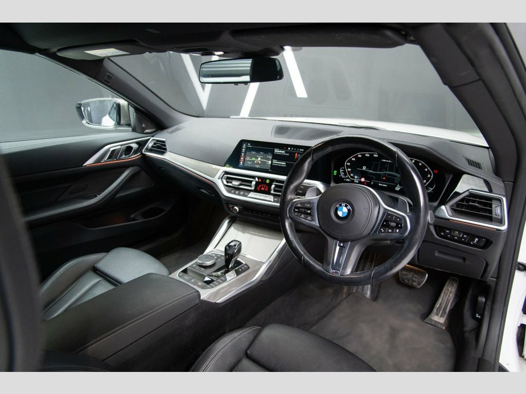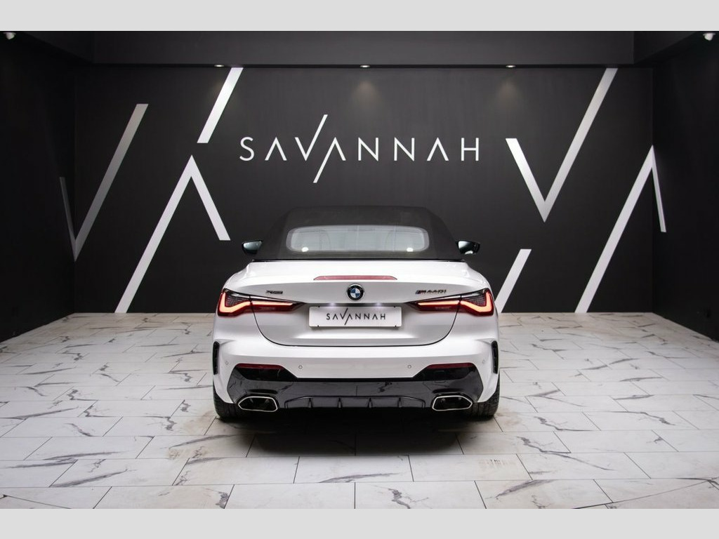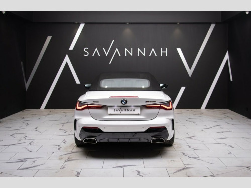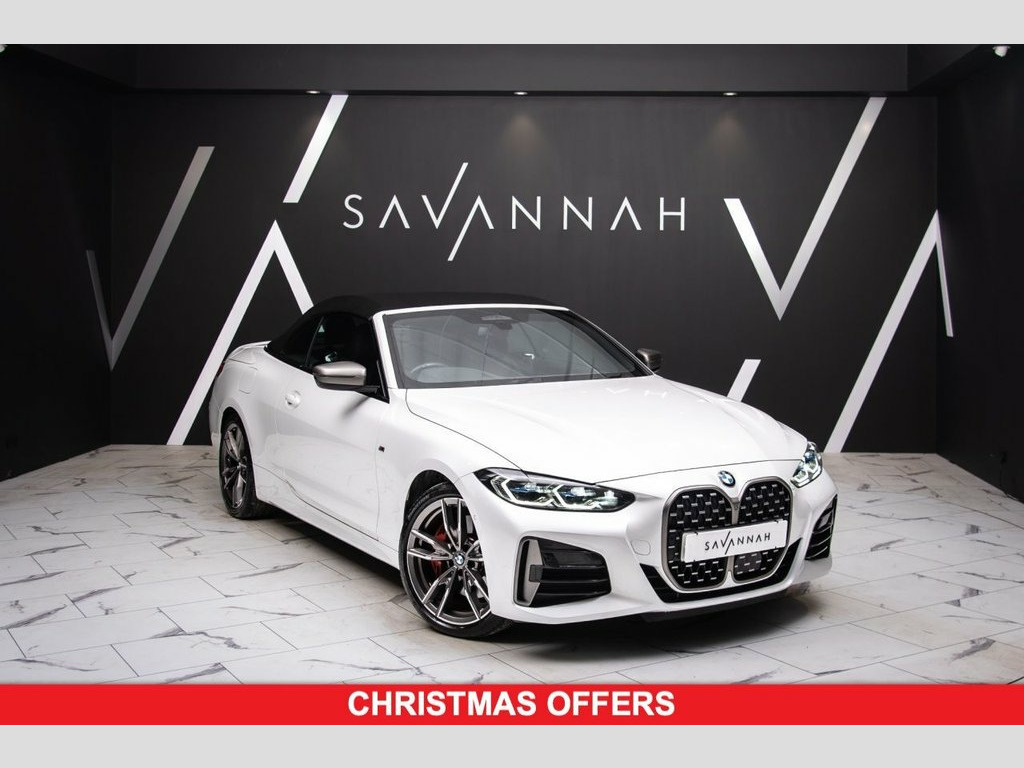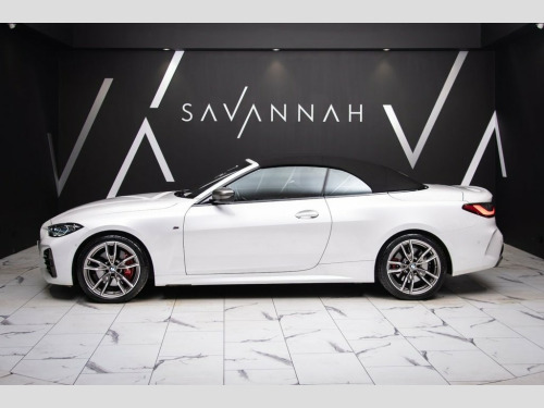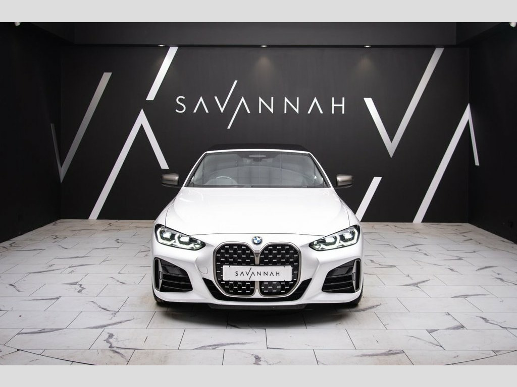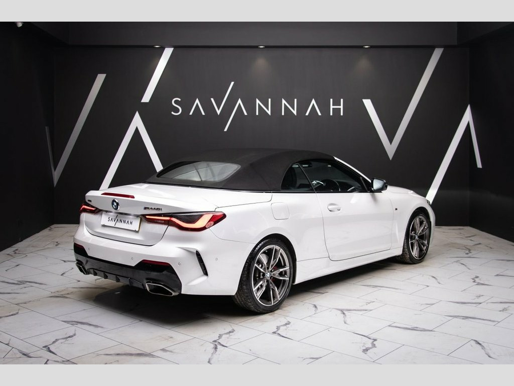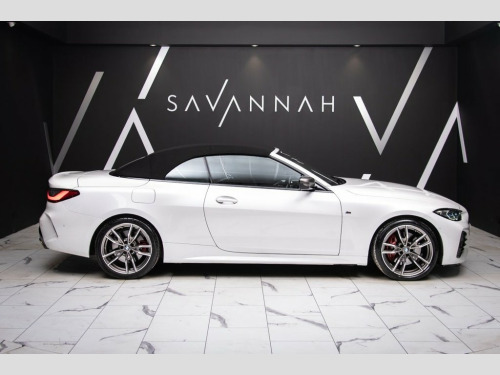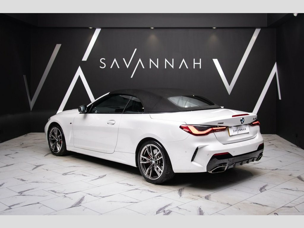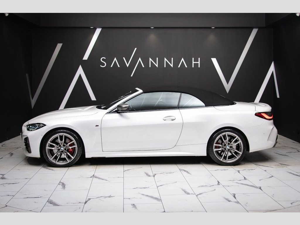 BMW 4 SERIES 3.0 M440i MHT Convertible 2dr Petrol Hybrid Auto xDrive Euro 6 (s/s) (374 ps) presents a seamless blend of elegance, sportiness and advanced technology. Finished in Mineral White with Cerium Grey accents across the kidney grilles, mirror caps and air inlets, it commands attention with its retractable hard top, aerodynamic M body styling, 19in M Light Double Spoke alloy wheels and twin free-form exhaust tailpipes. The interior combines sophistication with driver focus, featuring Vernasca leather sport seats with grey stitching, M seat belts, aluminium trim and a heated M leather steering wheel, all enhanced by ambient lighting and the Warm Air Collar for top-down comfort. Cutting-edge features include BMW Live Cockpit Professional, Harman Kardon loudspeaker system, Parking Assistant Plus, Technology Plus Pack and Visibility Package, ensuring both entertainment and safety are delivered in equal measure. Comfort is guaranteed with three-zone automatic air conditioning, heated seats, wireless charging, adaptive M suspension and a host of intelligent driving modes, while safety is prioritised through Active Guard Plus, ISOFIX, Dynamic Stability Control and Thatcham Category 1 alarm system. This convertible strikes the perfect balance between exhilarating performance and everyday practicality, making it a truly premium choice. 19in Alloy Wheels - M Double Spoke Style, 12V Power Socket - Centre Console, 19in Alloy Wheels - M Light Double Spoke, 2x Free-Form Exhaust Tailpipe Finishers, 48v System, Active Guard Plus, Adaptive M Sport Suspension, Air Conditioning - Automatic with Three-, Airbags, Alarm System - Thatcham 1 with Remote Co, Ambient Lighting with Welcome Light Carp, Armrest - Integrated in Door Trim Front , Armrest - Rear Centre, Attentiveness Assistant, BMW Connected Package Professional, BMW ConnectedDrive Online Services, BMW Emblem on Engine Compartment Lid and, BMW Emergency Call, BMW Live Cockpit Professional, BMW TeleServices, Battery Safety Cut Off, Bluetooth Hands-Free Facility with USB A, Brake