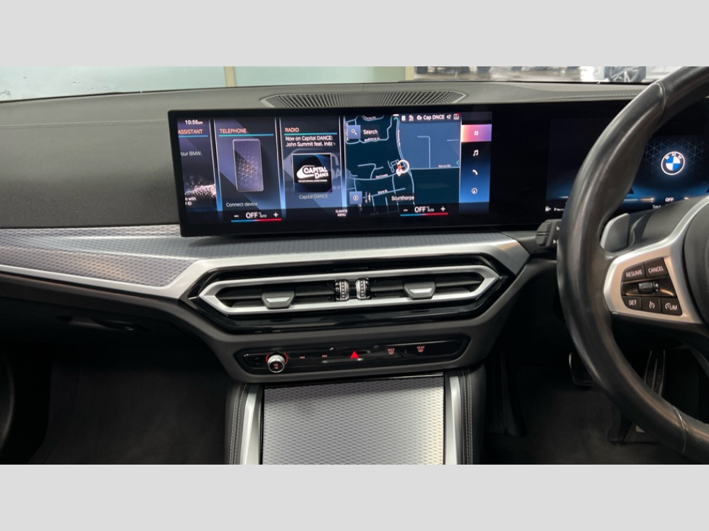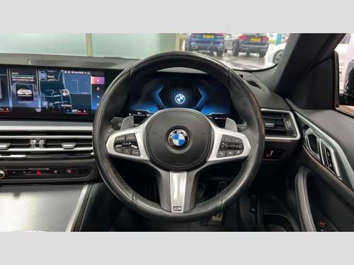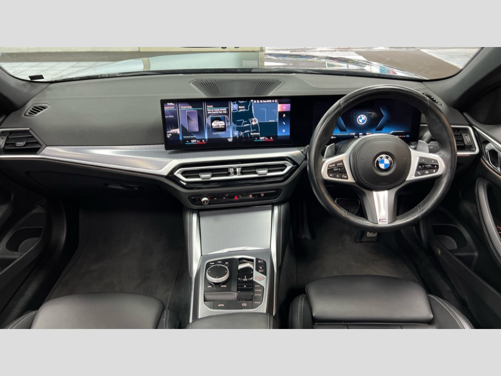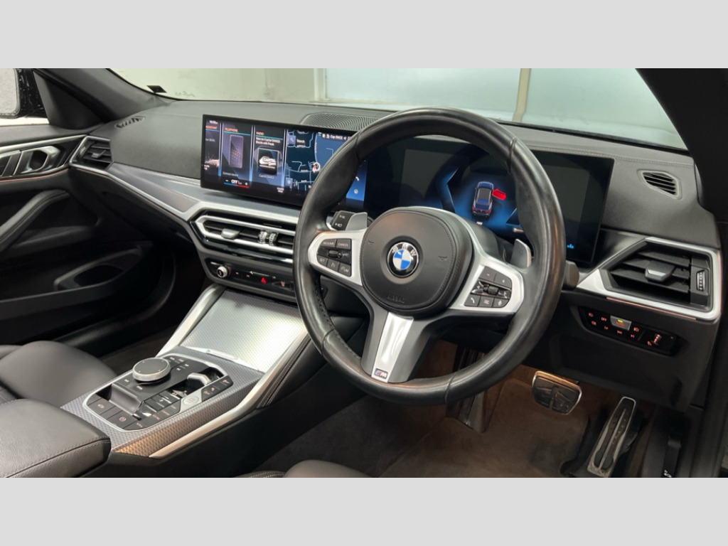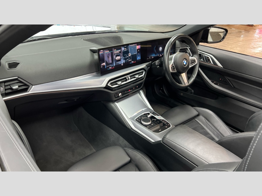 BMW 4 Series 420i M Sport 2dr Step Auto Active guard plus, Attentiveness assist, Auto start-stop, Bluetooth hands free facility with USB audio interface with audio streaming, BMW ConnectedDrive online services, BMW iDrive controller on centre console, BMW Live Cockpit Plus Nav-12.3" instrument&14.9" control Widescreen curved display/Intelligent Voice Assist/iDrive touch/Access 3rd party app/4G LTE, BMW service history, BMW Teleservices, Brake pad wear indicator in front and rear, Check Control warning system for monitoring of lights and door/luggage compartment open warning, Condition based service, Cruise control with speed limit function, Electric power steering with Servotronic steering optimised at all speed ranges, Gearshift time display in manual mode, Instrument cluster with speedometer with mph readout, tachometer, fuel gauge and oil temperature gauge, Integrated owners handbook, Oil sensor for level and grade, warning by check control system, On board computer - average speed, fuel consumption, outside temp display with acoustic warning, clock/date, service interval, odometer/trip meter, Optimum shift indicator, Run flat indicator, Shifting point display, Variable sport steering, 8 speed automatic steptronic transmission with gearshift paddles, Balanced 50/50 weight distribution, Double joint spring strut front axle, Double VANOS, Drive performance control - ECO PRO, comfort and sport modes, High precision injection, Low centre of gravity, M sport suspension, Petrol Particulate Filter, Stroke dependent dampers, VALVETRONIC engine management, 2x USB Type C ports in front centre console for charging and data transfer, 2x USB Type C ports in rear centre console for charging, DAB tuner, Electronic service booklet, Acoustic glazing, Automatic headlight beam throw control with load dependent regulating reaction, dynamic compensation of braking dive and acceleration squat, Automatic windscreen wipers and automatic headlight, Automatically dimming electrochromatic rear view mirror, BMW emblem on engine compartment lid and tailgate, BMW kidney grille with mesh grille front side of the nuggets in matt aluminium and frame in chrome high gloss, Body colour fuel filler flap, Body colour roof fin, Brushed aluminium inserts in the front door sill finishers with BMW designation, Door sill strips, Dynamic brake lights, Electric windows - front and rear, with open/close fingertip control, anti trap facility and comfort closing function all round, Exterior mirrors - electrically folding with anti-dazzle, Fading support, Follow me home headlights, Front and rear bumper system, Front apron plastic in body colour, Green tinted heat protection glazing, High gloss shadow line exterior trim, Illuminated bow type door handles in body colour drivers side with door lock, Interior rear view electrochromatic mirror with automatic anti dazzle function, LED daytime running lights, LED front fog lights, LED front indicators, Licence plate panel integrated into front bumper and tailgate, Lightweight engineering, M designation on front side panels, left and right, Model designation on right side of tailgate, One piece front bumper cover including towing eye cover in body colour, Preparation for high beam assistant, Rear boot, Reversing light, Side frame decorative moulding black matt, Third brake light, Two part LED tailights in L-shape with components in smoked glass, brake light, LED turn indicator and rear fog light, Visible exhaust tailpipe finisher, Visible VIN plate, Welcome lights in interior and door handle area, Widened track and increased camber values for max transverse dynamics, agility and steering precision, Window recess cover black high gloss, Windscreen wipers with integrated heated washing jets, 12V power socket in front centre console, 2 2nd row folding seats, 2 front cupholder in centre console with clamping elements and matt black inlay, 2 Rear seat headrests, 2nd row centre armrest with built-in cupholders, 3 spoke M sport leather multifunction steering wheel, 3 zone automatic air conditioning, 4 pieces lashing eyelets in luggage compartment, Anthracite headlining, Armrest integrated in front and rear door trim + front centre console armrest, BMW ID, Driver seat backrest width adjustment, Electric seat adjustment with memory, Extended storage, Luggage compartment seprating net on side trim left and right, Four grab handles integrated in roof lining, Front and rear door pockets, Front and rear reading lights, Front sport seats, Heated driver and front passenger seats, Height adjustable front headrests, Height adjustable mechanically and infinitely variable steering column, Illuminated armrest storage compartment, Illuminated glove compartment with separate small compartment, Make-up mirror lights, Single front passenger seat, Storage compartment in rear centre console, Sunvisors with illuminated vanity mirrors and ticket pocket, Through load system, Toolkit located in luggage compartment, Velour front floor mats, Vernasca leather upholstery, Ambient lighting pack - 4 Series, Connected professional package - 4 Series, M sport exterior styling pack - 4 Series, 2 x 3-point rear seatbelts, Battery safety cut-off, BMW emergency call, Brake energy regeneration, Braking pre-tensioning, Coasting in idle in ECO PRO mode, Cornering brake control (CBC), Crash sensor activating of airbags, Unlocking doors, hazard warning lights, interior light, safety battery terminal, Driver and front passenger side airbags, integrated in the door side seat backrest bolsters for all seat variants, Driver/Front Passenger airbags, Dry braking, Dynamic brake control, Dynamic stability control + (DSC+) - Anti-lock Braking System (ABS) with brake assist and cornering brake control + Automatic Stability Control (ASC), Dynamic Traction Control - DTC, Electric parking brake including automatic hold function and automatic release of the parking brake when driving off, Electronic differential lock control (EDLC), Front and rear v