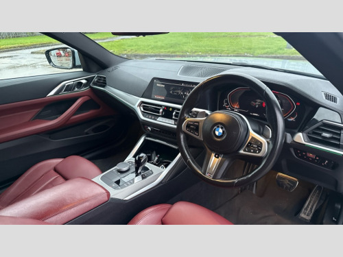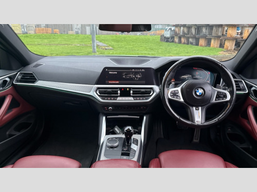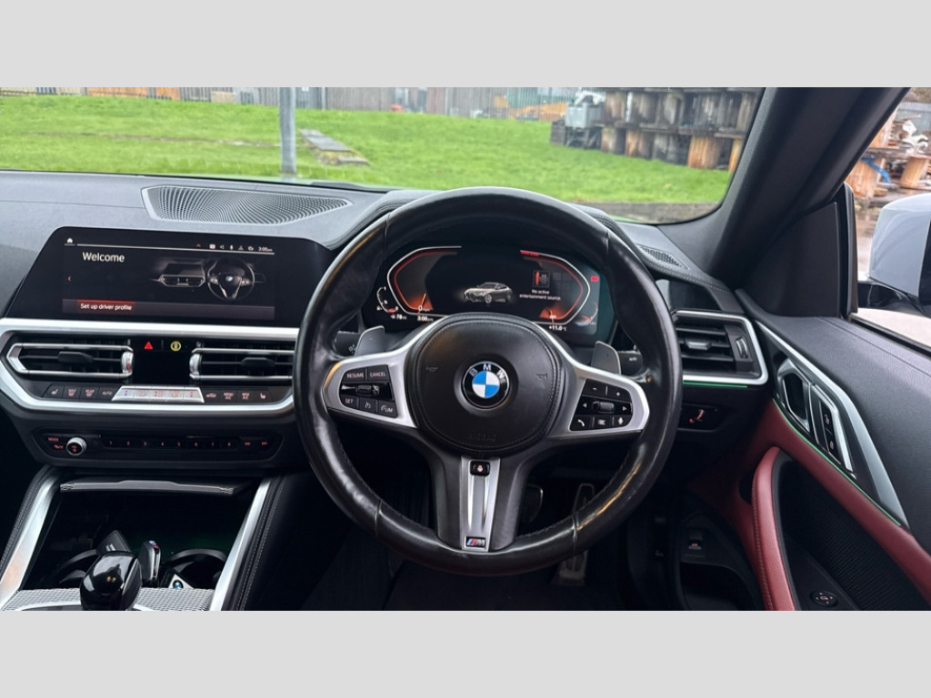 BMW 4 Series 420i M Sport 2dr Step Auto Active guard plus, Attentiveness assist, Auto start-stop, BMW ConnectedDrive online services, BMW iDrive controller on centre console, BMW Live Cockpit Professional Nav with 12.3" instrument display + 10.25" display, Intelligent Voice Assist, BMW OS 7, HDD, 2USB, 4G LTE connect, BMW service history, BMW Teleservices, Brake pad wear indicator in front and rear, Check Control warning system for monitoring of lights and door/luggage compartment open warning, Condition based service, Cruise control with speed limit function, Electric power steering with Servotronic steering optimised at all speed ranges, Gearshift time display in manual mode, Instrument cluster with speedometer with mph readout, tachometer, fuel gauge and oil temperature gauge, Integrated owners handbook, Oil sensor for level and grade, warning by check control system, On board computer - average speed, fuel consumption, outside temp display with acoustic warning, clock/date, service interval, odometer/trip meter, Optimum shift indicator, Run flat indicator, Shifting point display, Touch control functionality for BMW Live Cockpit Professional Nav, Variable sport steering, 8 speed automatic steptronic transmission with gearshift paddles, Balanced 50/50 weight distribution, Double joint spring strut front axle, Double VANOS, Drive performance control - ECO PRO, comfort and sport modes, High precision injection, Low centre of gravity, M sport suspension, Petrol Particulate Filter, Stroke dependent dampers, VALVETRONIC engine management, 2x USB Type C ports in front centre console for charging and data transfer, 2x USB Type C ports in rear centre console for charging, DAB tuner, Electronic service booklet, Acoustic glazing, Automatic headlight beam throw control with load dependent regulating reaction, dynamic compensation of braking dive and acceleration squat, Automatic windscreen wipers and automatic headlight, Automatically dimming electrochromatic rear view mirror, BMW emblem on engine compartment lid and tailgate, BMW kidney grille with mesh grille front side of the nuggets in matt aluminium and frame in chrome high gloss, Body colour fuel filler flap, Body colour roof fin, Brushed aluminium inserts in the front door sill finishers with BMW designation, Door sill strips, Dynamic brake lights, Electric windows - front and rear, with open/close fingertip control, anti trap facility and comfort closing function all round, Exterior mirrors - electrically folding with anti-dazzle, Fading support, Follow me home headlights, Front and rear bumper system, Front apron plastic in body colour, Green tinted heat protection glazing, High gloss shadow line exterior trim, Illuminated bow type door handles in body colour drivers side with door lock, Interior rear view electrochromatic mirror with automatic anti dazzle function, LED daytime running lights, LED front fog lights, LED front indicators, Licence plate panel integrated into front bumper and tailgate, Lightweight engineering, M designation on front side panels, left and right, M rear boot spoiler, Model designation on right side of tailgate, One piece front bumper cover including towing eye cover in body colour, Preparation for high beam assistant, Rear boot, Reversing light, Side frame decorative moulding black matt, Two part LED tailights in L-shape with components in smoked glass, brake light, LED turn indicator and rear fog light, Visible exhaust tailpipe finisher, Visible VIN plate, Welcome lights in interior and door handle area, Widened track and increased camber values for max transverse dynamics, agility and steering precision, Window recess cover black high gloss, Windscreen wipers with integrated heated washing jets, 12V power socket in front centre console, 2 front cupholder in centre console with clamping elements and matt black inlay, 2 Rear seat headrests, 2 seat bench in second row, 3 spoke M sport leather multifunction steering wheel, 3 zone automatic air conditioning, 4 pieces lashing eyelets in luggage compartment, 40:20:40 split folding rear seat and rear centre armrest with two cupholders, Anthracite headlining, Armrest integrated in front and rear door trim + front centre console armrest, BMW ID, Driver seat backrest width adjustment, Four grab handles integrated in roof lining, Front and rear door pockets, Front and rear reading lights, Front sport seats, Heated driver and front passenger seats, Height adjustable front headrests, Height adjustable mechanically and infinitely variable steering column, Illuminated armrest storage compartment, Illuminated glove compartment with separate small compartment, Make-up mirror lights, Single front passenger seat, Storage compartment in rear centre console, Sunvisors with illuminated vanity mirrors and ticket pocket, Toolkit located in luggage compartment, Velour front floor mats, Vernasca leather upholstery, Ambient lighting pack - 4 Series, Connected professional pack - 4 Series, M sport exterior styling pack - 4 Series, 2 x 3-point rear seatbelts, Battery safety cut-off, BMW emergency call, Brake energy regeneration, Braking pre-tensioning, Child seat ISOFIX attachment for the two outer rear seats, Coasting in idle in ECO PRO mode, Cornering brake control (CBC), Crash sensor activating of airbags, Unlocking doors, hazard warning lights, interior light, safety battery terminal, Driver and front passenger side airbags, integrated in the door side seat backrest bolsters for all seat variants, Driver/Front Passenger airbags, Dry braking, Dynamic brake control, Dynamic stability control + (DSC+) - Anti-lock Braking System (ABS) with brake assist and cornering brake control + Automatic Stability Control (ASC), Dynamic Traction Control - DTC, Electric parking brake including automatic hold function and automatic release of the parking brake when driving off, Electronic differential lock control (EDLC), Front and rear ventilated brake disc, Front passenger manual airbag deactivation,