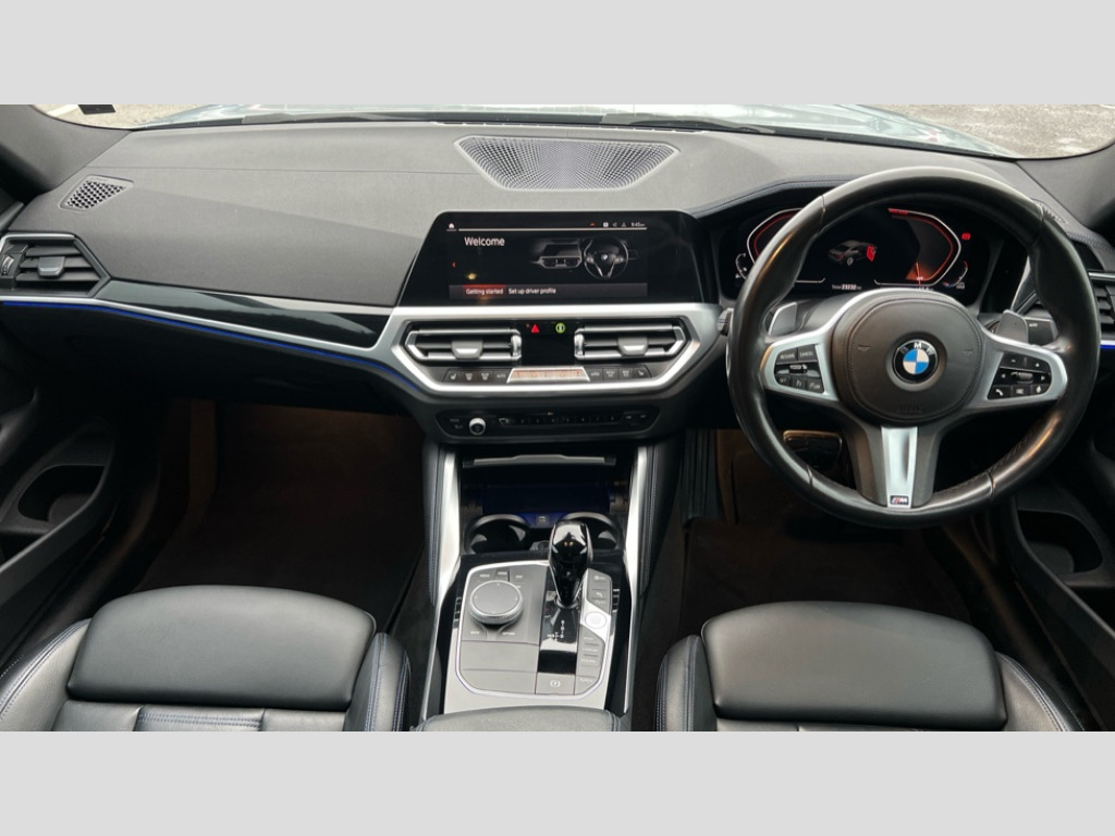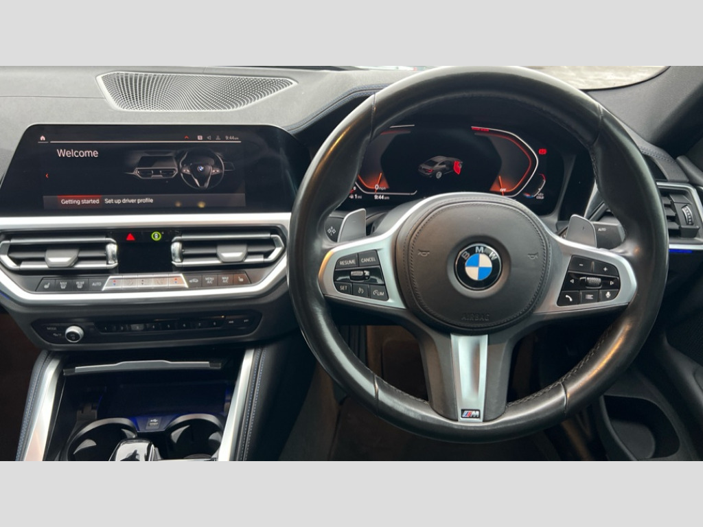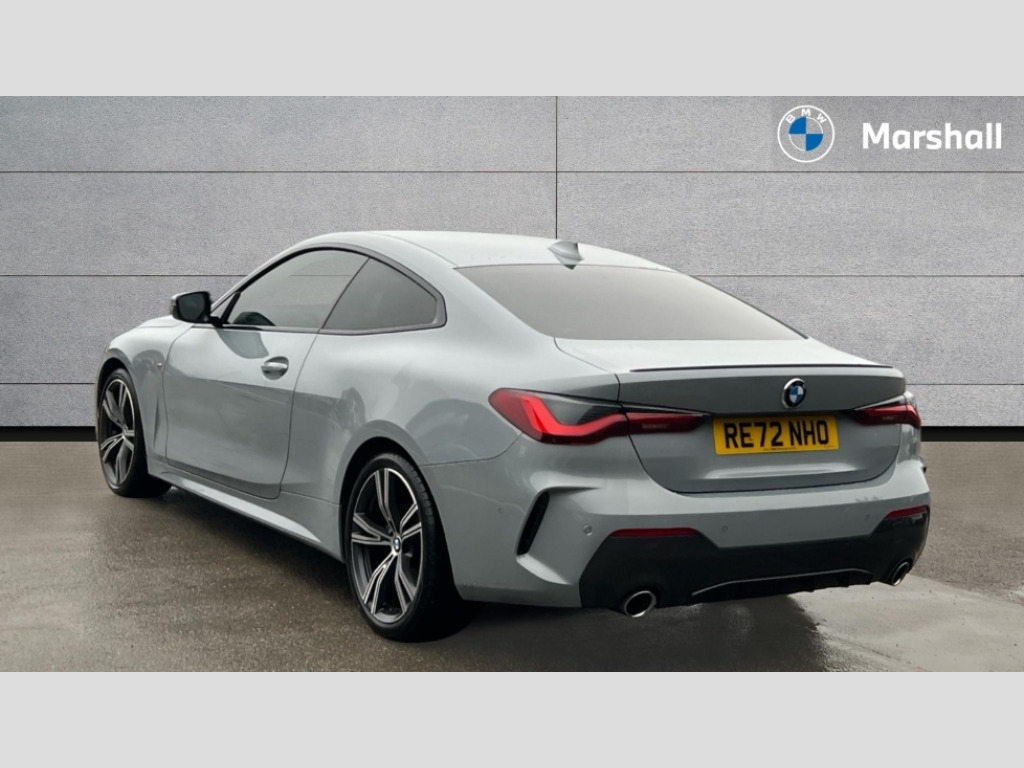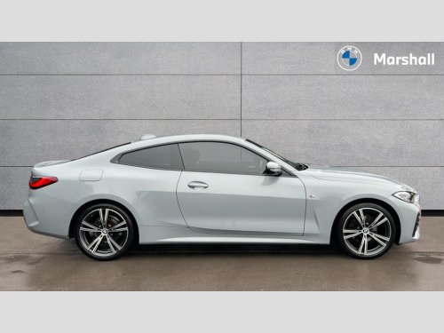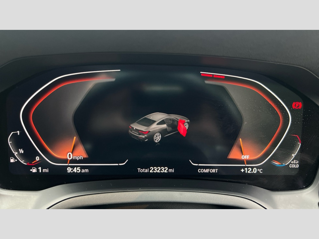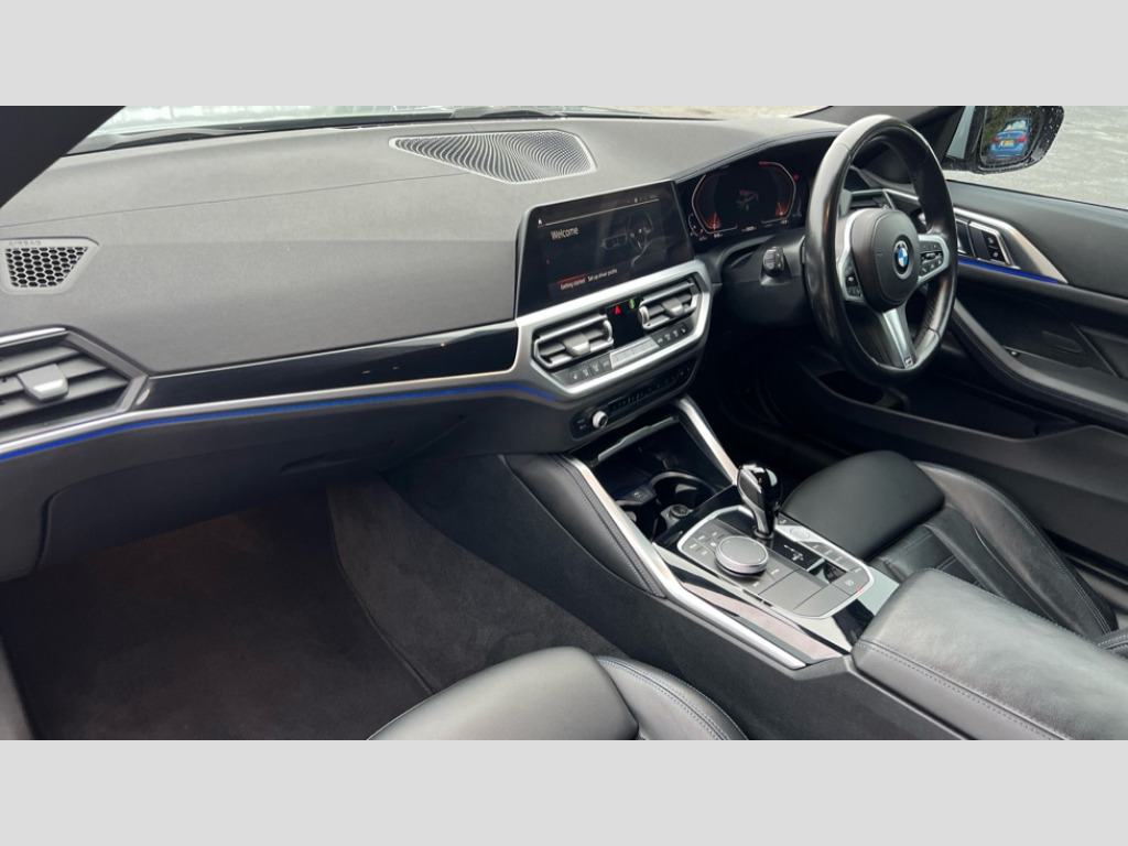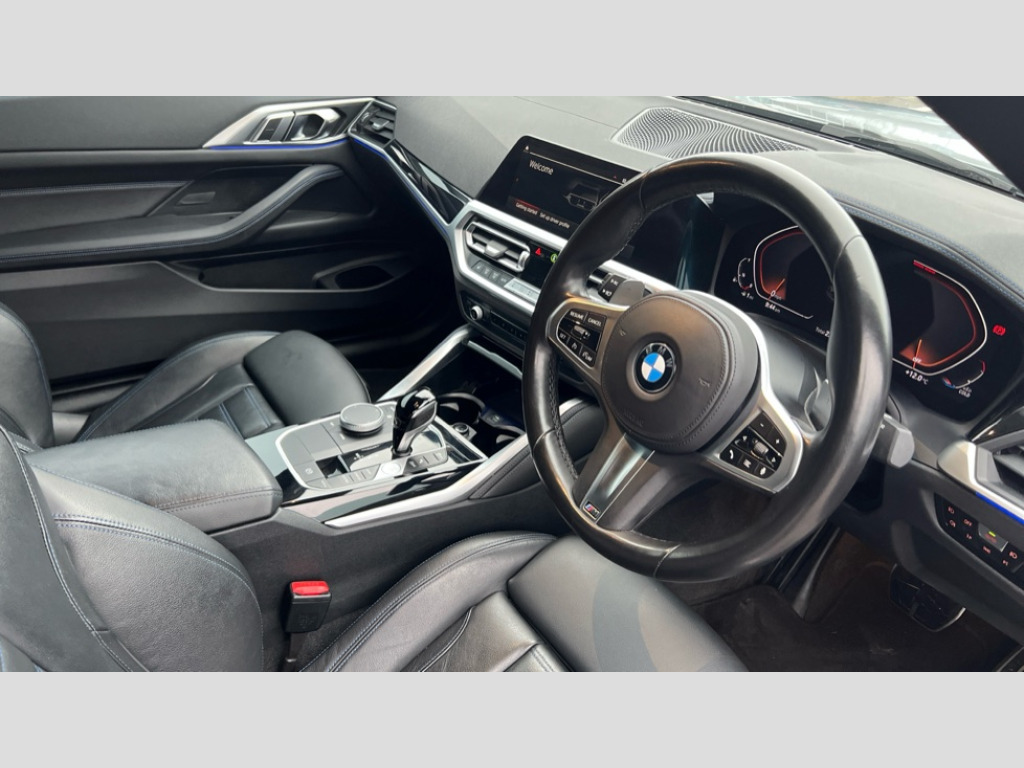 BMW 4 Series 420i M Sport 2dr Step Auto Active guard plus, Attentiveness assist, Auto start-stop, BMW ConnectedDrive online services, BMW iDrive controller on centre console, BMW Live Cockpit Professional Nav with 12.3" instrument display + 10.25" display, Intelligent Voice Assist, BMW OS 7, HDD, 2USB, 4G LTE connect, BMW service history, BMW Teleservices, Brake pad wear indicator in front and rear, Check Control warning system for monitoring of lights and door/luggage compartment open warning, Condition based service, Cruise control with speed limit function, Electric power steering with Servotronic steering optimised at all speed ranges, Gearshift time display in manual mode, Instrument cluster with speedometer with mph readout, tachometer, fuel gauge and oil temperature gauge, Integrated owners handbook, Oil sensor for level and grade, warning by check control system, On board computer - average speed, fuel consumption, outside temp display with acoustic warning, clock/date, service interval, odometer/trip meter, Optimum shift indicator, Run flat indicator, Shifting point display, Touch control functionality for BMW Live Cockpit Professional Nav, Variable sport steering, 8 speed automatic steptronic transmission with gearshift paddles, Balanced 50/50 weight distribution, Double joint spring strut front axle, Double VANOS, Drive performance control - ECO PRO, comfort and sport modes, High precision injection, Low centre of gravity, M sport suspension, Petrol Particulate Filter, Stroke dependent dampers, VALVETRONIC engine management, 2x USB Type C ports in front centre console for charging and data transfer, 2x USB Type C ports in rear centre console for charging, DAB tuner, Electronic service booklet, Acoustic glazing, Automatic headlight beam throw control with load dependent regulating reaction, dynamic compensation of braking dive and acceleration squat, Automatic windscreen wipers and automatic headlight, Automatically dimming electrochromatic rear view mirror, BMW emblem on engine compartment lid and tailgate, BMW kidney grille with mesh grille front side of the nuggets in matt aluminium and frame in chrome high gloss, Body colour fuel filler flap, Body colour roof fin, Brushed aluminium inserts in the front door sill finishers with BMW designation, Door sill strips, Dynamic brake lights, Electric windows - front and rear, with open/close fingertip control, anti trap facility and comfort closing function all round, Exterior mirrors - electrically folding with anti-dazzle, Fading support, Follow me home headlights, Front and rear bumper system, Front apron plastic in body colour, Green tinted heat protection glazing, High gloss shadow line exterior trim, Illuminated bow type door handles in body colour drivers side with door lock, Interior rear view electrochromatic mirror with automatic anti dazzle function, LED daytime running lights, LED front fog lights, LED front indicators, Licence plate panel integrated into front bumper and tailgate, Lightweight engineering, M designation on front side panels, left and right, M rear boot spoiler, Model designation on right side of tailgate, One piece front bumper cover including towing eye cover in body colour, Preparation for high beam assistant, Rear boot, Reversing light, Side frame decorative moulding black matt, Two part LED tailights in L-shape with components in smoked glass, brake light, LED turn indicator and rear fog light, Visible exhaust tailpipe finisher, Visible VIN plate, Welcome lights in interior and door handle area, Widened track and increased camber values for max transverse dynamics, agility and steering precision, Window recess cover black high gloss, Windscreen wipers with integrated heated washing jets, 12V power socket in front centre console, 2 front cupholder in centre console with clamping elements and matt black inlay, 2 Rear seat headrests, 2 seat bench in second row, 3 spoke M sport leather multifunction steering wheel, 3 zone automatic air conditioning, 4 pieces lashing eyelets in luggage compartment, 40:20:40 split folding rear seat and rear centre armrest with two cupholders, Anthracite headlining, Armrest integrated in front and rear door trim + front centre console armrest, BMW ID, Driver seat backrest width adjustment, Four grab handles integrated in roof lining, Front and rear door pockets, Front and rear reading lights, Front sport seats, Heated driver and front passenger seats, Height adjustable front headrests, Height adjustable mechanically and infinitely variable steering column, Illuminated armrest storage compartment, Illuminated glove compartment with separate small compartment, Make-up mirror lights, Single front passenger seat, Storage compartment in rear centre console, Sunvisors with illuminated vanity mirrors and ticket pocket, Toolkit located in luggage compartment, Velour front floor mats, Vernasca leather upholstery, Ambient lighting pack - 4 Series, Connected professional pack - 4 Series, M sport exterior styling pack - 4 Series, 2 x 3-point rear seatbelts, Battery safety cut-off, BMW emergency call, Brake energy regeneration, Braking pre-tensioning, Child seat ISOFIX attachment for the two outer rear seats, Coasting in idle in ECO PRO mode, Cornering brake control (CBC), Crash sensor activating of airbags, Unlocking doors, hazard warning lights, interior light, safety battery terminal, Driver and front passenger side airbags, integrated in the door side seat backrest bolsters for all seat variants, Driver/Front Passenger airbags, Dry braking, Dynamic brake control, Dynamic stability control + (DSC+) - Anti-lock Braking System (ABS) with brake assist and cornering brake control + Automatic Stability Control (ASC), Dynamic Traction Control - DTC, Electric parking brake including automatic hold function and automatic release of the parking brake when driving off, Electronic differential lock control (EDLC), Front and rear ventilated brake disc, Front passenger manual airbag deactivation,