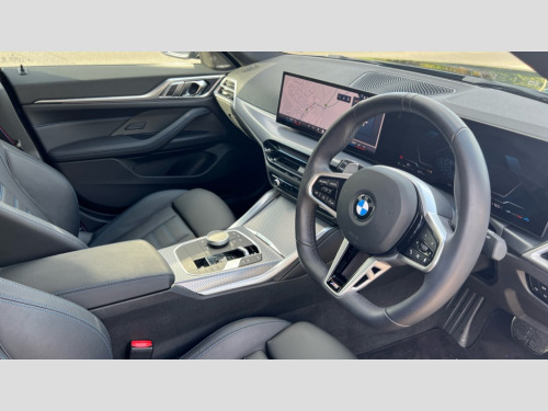 BMW 4 Series 420i M Sport 5dr Step Auto Active guard plus, Attentiveness assist, Automatic start/stop function, BMW ConnectedDrive online services, BMW iDrive controller on centre console, BMW service history, BMW Teleservices, Brake pad wear indicator in front and rear, Check Control warning system for monitoring of lights and door/luggage compartment open warning, Condition based service, Electric bootlid, Electric power steering with Servotronic steering optimised at all speed ranges, Instrument cluster with speedometer with mph readout, tachometer, fuel gauge and oil temperature gauge, Integrated owners handbook, Language version English, Oil sensor for level and grade, On board computer - average speed, fuel consumption, outside temp display with acoustic warning, clock/date, service interval, odometer/trip meter, Run flat indicator, Shifting point display, Start/stop button in black, Variable sport steering, 8 speed automatic steptronic transmission with gearshift paddles, Balanced 50/50 weight distribution, Double joint spring strut front axle, Drive experience mode switch - Comfort mode, ECO PRO mode and SPORT mode, Low centre of gravity, Petrol Particulate Filter, Stroke dependent dampers, DAB tuner, Personal eSim, Acoustic glazing, Automatic headlight beam throw control with load dependent regulating reaction, dynamic compensation of braking dive and acceleration squat, Automatic windscreen wipers and automatic headlight, BMW radiator grille with mesh grille, end face of the nuggets in aluminium matt and frame in chrome matt, Body colour fuel filler flap, Body colour roof fin, Bonnet and tailgate badge, Electric folding wing mirrors - Driver side electrochromic, auto anti dazzle function & front passenger side auto parking function without anti dazzle, Electric windows - front and rear, with open/close fingertip control, anti trap facility and comfort closing function all round, Follow me home headlights, Front and rear bumper system, Front apron plastic in body colour, Green tinted heat protection glazing, Illuminated bow type door handles in body colour drivers side with door lock, Interior rear view electrochromatic mirror with automatic anti dazzle function, LED 3rd brake light, LED daytime running lights, LED front fog lights, LED front indicators, Licence plate panel integrated into front bumper and tailgate, Low and high beam headlights in Bi-LED, M designation on front side panels, left and right, M Sport entry door sill strips, Model designation on right side of tailgate, One piece front bumper cover including towing eye cover in body colour, Preparation for high beam assistant, Rear side wing doors, Rear wiper, Reversing light, Side frame trim strip black matt, Two part LED tailights in L-shape with components in smoked glass, brake light, LED turn indicator and rear fog light, Visible exhaust tailpipe finisher, Visible VIN plate, Welcome lights in interior and door handle area, Widened track and increased camber values for max transverse dynamics, agility and steering precision, Windscreen washer jets concealed underneath bonnet, 12V power socket in front centre console, 2 front cupholder in centre console with clamping elements and matt black inlay, 3 rear headrests, 3 seat bench in 2nd row, 3 spoke flat bottom M sport leather multifunction steering wheel, 3 zone automatic air conditioning, 4 pieces lashing eyelets in luggage compartment, 40:20:40 split folding rear seat, folding head restraint of centre seat and rear centre armrest with two cupholders, Anthracite headlining, Armrest integrated in front and rear door trim + front centre console armrest, Battery in luggage compartment, BMW ID, Extended storage - 2x Dual USB Type C 3A charging function in the rear centre console for the rear, Extended storage - Luggage compartment partition net on left side trim panel, Bag hook on both sides of the luggage compartment, Extended storage - Multifunction hook, Extended storage - Trailer tow hitch button in black (extendable trailer tow hitch) on the right hand side, Four grab handles integrated in roof lining, Front and rear door pockets, Front footwell lights, Heated driver and front passenger seats, Height adjustable front headrests, Illuminated armrest storage compartment, Illuminated glove compartment with separate small compartment, Interior light and front reading light, Luggage compartment light, Single front passenger seat, Steering column adjustment - Infinitely variable in height and length, Sunvisors with illuminated vanity mirrors and ticket pocket, Through load system, Toolkit located in luggage compartment, Velour front floor mats, Ambient lighting pack - 4 Series, BMW Live Cockpit Plus pack - 4 Series, Connected professional package - 4 Series, M High gloss shadowline exterior trim pack - 4 Series, M sport exterior styling pack - 4 Series, Park assist pack - 4 Series, 3 point seatbelts on all seats, BMW emergency call, Brake energy regeneration, Braking pre-tensioning, Child locks, Child seat ISOFIX attachment for the two outer rear seats, Crash sensor activating of airbags, Unlocking doors, hazard warning lights, interior light, safety battery terminal, Driver and front passenger side airbags, integrated in the door side seat backrest bolsters for all seat variants, Driver/Front Passenger airbags, Dry braking, Dynamic brake control, Dynamic stability control + (DSC+) - Anti-lock Braking System (ABS) with brake assist and cornering brake control + Automatic Stability Control (ASC), Dynamic Traction Control - DTC, Electric parking brake including automatic hold function and automatic release of the parking brake when driving off, Electronic differential lock control (EDLC), Front and rear ventilated brake disc, Front passenger manual airbag deactivation, Head airbags for all 4 outer seats, Hill start assistant, Seat belt security check for driver and front passenger, Seat belt with belt stopper, pyrotechnic belt tensioners and belt force limiters, Seat occu
