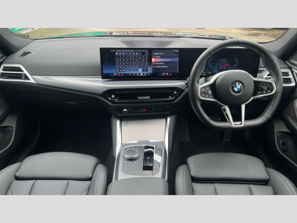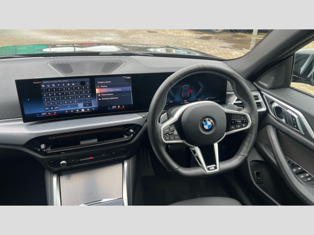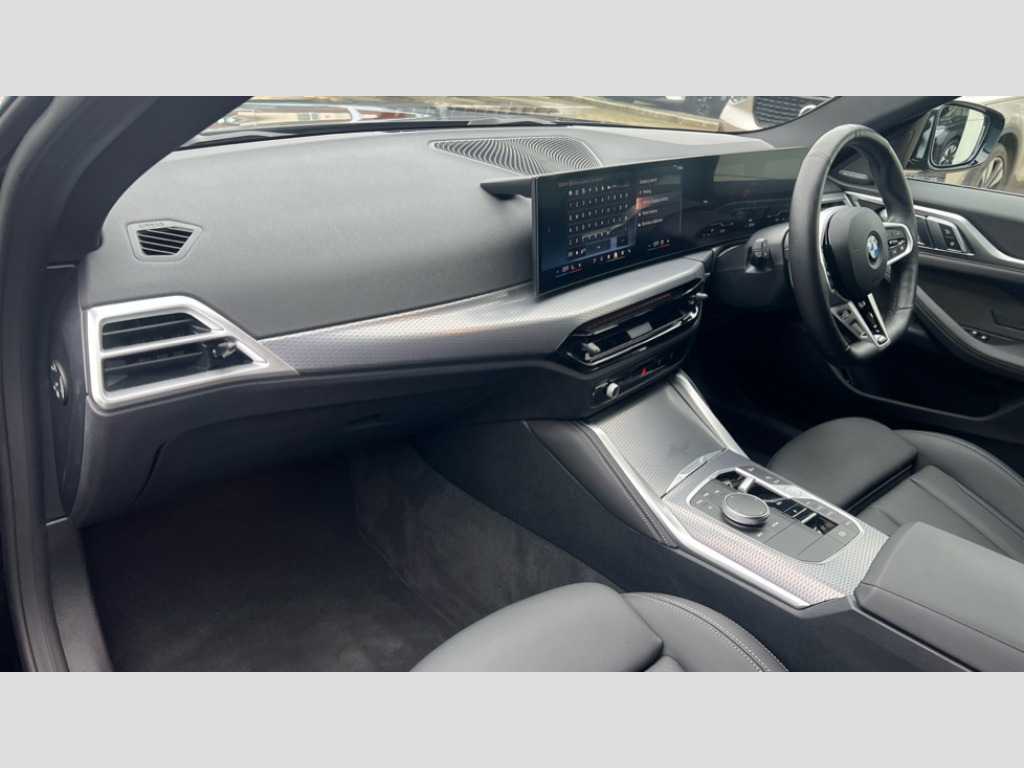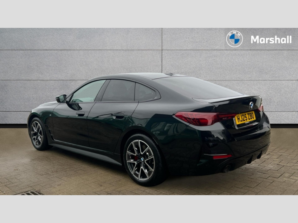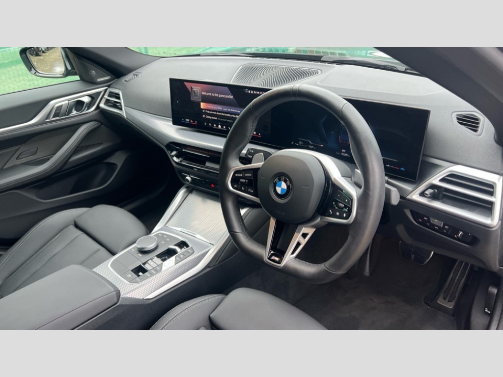BMW 4 Series 420i M Sport 5dr Step Auto Active guard plus, Attentiveness assist, Automatic start/stop function, BMW ConnectedDrive online services, BMW iDrive controller on centre console, BMW service history, BMW Teleservices, Brake pad wear indicator in front and rear, Check Control warning system for monitoring of lights and door/luggage compartment open warning, Condition based service, Electric bootlid, Electric power steering with Servotronic steering optimised at all speed ranges, Instrument cluster with speedometer with mph readout, tachometer, fuel gauge and oil temperature gauge, Integrated owners handbook, Language version English, Oil sensor for level and grade, On board computer - average speed, fuel consumption, outside temp display with acoustic warning, clock/date, service interval, odometer/trip meter, Run flat indicator, Shifting point display, Start/stop button in black, Variable sport steering, 8 speed automatic steptronic transmission with gearshift paddles, Balanced 50/50 weight distribution, Double joint spring strut front axle, Drive experience mode switch - Comfort mode, ECO PRO mode and SPORT mode, Electronic differential lock control (EDLC), Low centre of gravity, Petrol Particulate Filter, Stroke dependent dampers, DAB tuner, Personal eSim, Acoustic glazing, Adaptive LED Headlights, Automatic headlight beam throw control with load dependent regulating reaction, dynamic compensation of braking dive and acceleration squat, Automatic windscreen wipers, BMW individual lights shadow line, BMW radiator grille with mesh grille, end face of the nuggets in aluminium matt and frame in chrome matt, Body colour fuel filler flap, Body colour roof fin, Bonnet and tailgate badge, Electric folding wing mirrors - Driver side electrochromic, auto anti dazzle function & front passenger side auto parking function without anti dazzle, Electric windows - front and rear, with open/close fingertip control, anti trap facility and comfort closing function all round, Extended high gloss shadow line exterior trim - Tailpipe trim in black chrome, mirror caps and rear spoiler in high gloss black, Follow me home headlights, Front and rear bumper system, Front apron plastic in body colour, Green tinted heat protection glazing, High beam assistant, Illuminated bow type door handles in body colour drivers side with door lock, Interior rear view electrochromatic mirror with automatic anti dazzle function, LED 3rd brake light, LED daytime running lights, LED front fog lights, LED front indicators, Licence plate panel integrated into front bumper and tailgate, M designation on front side panels, left and right, M rear boot spoiler, M Sport entry door sill strips, Model designation on right side of tailgate, One piece front bumper cover including towing eye cover in body colour, Rear side wing doors, Rear wiper, Reversing light, Side frame trim strip black matt, Two part LED tailights in L-shape with components in smoked glass, brake light, LED turn indicator and rear fog light, Visible exhaust tailpipe finisher, Visible VIN plate, Welcome lights in interior and door handle area, Widened track and increased camber values for max transverse dynamics, agility and steering precision, Windscreen washer jets concealed underneath bonnet, 12V power socket in front centre console, 2 front cupholder in centre console with clamping elements and matt black inlay, 3 rear headrests, 3 seat bench in 2nd row, 3 spoke flat bottom M sport leather multifunction steering wheel, 3 zone automatic air conditioning, 4 pieces lashing eyelets in luggage compartment, 40:20:40 split folding rear seat, folding head restraint of centre seat and rear centre armrest with two cupholders, Anthracite headlining, Armrest integrated in front and rear door trim + front centre console armrest, Battery in luggage compartment, BMW ID, Extended storage - 2x Dual USB Type C 3A charging function in the rear centre console for the rear, Extended storage - Luggage compartment partition net on left side trim panel, Bag hook on both sides of the luggage compartment, Extended storage - Multifunction hook, Extended storage - Trailer tow hitch button in black (extendable trailer tow hitch) on the right hand side, Four grab handles integrated in roof lining, Front and rear door pockets, Front footwell lights, Heated driver and front passenger seats, Height adjustable front headrests, Illuminated armrest storage compartment, Illuminated glove compartment with separate small compartment, Interior light and front reading light, Luggage compartment light, Single front passenger seat, Steering column adjustment - Infinitely variable in height and length, Sunvisors with illuminated vanity mirrors and ticket pocket, Through load system, Toolkit located in luggage compartment, Velour front floor mats, Ambient lighting pack - 4 Series, BMW Live Cockpit Plus pack - 4 Series, Connected professional package - 4 Series, M High gloss shadowline exterior trim pack - 4 Series, M sport exterior styling pack - 4 Series, Park assist pack - 4 Series, 3 point seatbelts on all seats, BMW emergency call, Brake energy regeneration, Braking pre-tensioning, Child locks, Child seat ISOFIX attachment for the two outer rear seats, Crash sensor activating of airbags, Unlocking doors, hazard warning lights, interior light, safety battery terminal, Driver and front passenger side airbags, integrated in the door side seat backrest bolsters for all seat variants, Driver/Front Passenger airbags, Dry braking, Dynamic brake control, Dynamic stability control + (DSC+) - Anti-lock Braking System (ABS) with brake assist and cornering brake control + Automatic Stability Control (ASC), Dynamic Traction Control - DTC, Electric parking brake including automatic hold function and automatic release of the parking brake when driving off, Front and rear ventilated brake disc, Front passenger manual airbag deactivation, Head airbags for all 4 outer seats, Hill start assistant, M Sport brakes in 