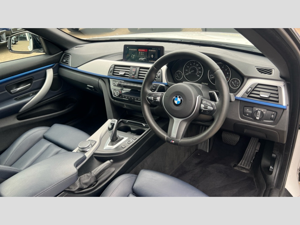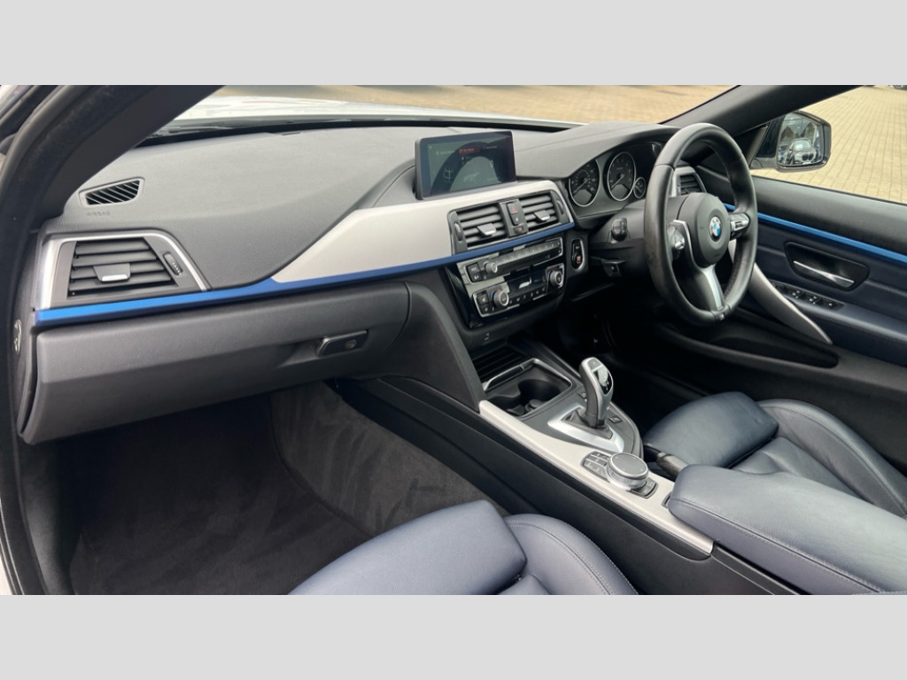 BMW 4 Series 430i M Sport 2dr Auto [Professional Media] BMW Online services, BMW remote services, BMW Teleservices, Brake pad wear indicator warning light, Check control system, Door/boot open warning, Front/rear Parking distance control, iDrive controller and display with 6.5" monitor, Lights on warning, Oil temperature gauge, On board computer, Outside temperature display, Real time traffic information, Run flat indicator, Service interval indicator, Stop/start button, Drive Performance Control, Electronic differential lock, Sports function on gearbox with steering wheel mounted gearshift paddles, Bluetooth audio streaming, BMW professional radio/CD/MP3, DAB Digital radio, 2 speed adjustable intermittent wipers with wash/wipe function, Auto dimming rear view mirror, Body colour bumpers, Body colour door handles, Body colour door mirrors, Body colour roof mouldings, Chrome kidney grille with black vertical slats, Door sill finishers, Dual chrome exhaust, Electric adjustable heated door mirrors, Electric front windows/one touch facility, Follow me home headlights, Heat insulating tinted glass, Heated windscreen washer jets, High gloss shadow line, LED daytime running lights, LED front fog lights, M aerodynamic bodystyling, Rain sensor including auto headlights activation, Welcome lighting, Windscreen with grey shadeband, 12V sockets in front centre console and passenger footwell, 3 spoke leather M sport multifunction sports steering wheel, Anthracite Velour floor mats, Dual zone climate control, Folding front centre armrest with storage compartment, Folding storage compartment with glasses holder + coin tray, Front cupholders x 2, Front door storage with bottle holder, Front head restraints, Front sports seats with electric side bolster adjustment, Front/rear armrests within door panels, Glovebox with lid, Heated front seats, Integrated rear head restraints, ISOFIX child seat preparation+airbag deactivation, Lashing eyelets in boot, Leather handbrake grip, Reach + rake adjustable steering column, Rear centre armrest, Storage compartment behind rear seat, Storage compartment in centre rear seat base, Storage compartment in rear centre console, Toolkit located in luggage compartment, Extended lights package - 4 Series, 3 point seatbelts on all seats, ABS/EBD, Automatic Stability Control (ASC), BMW emergency call, Brake energy regeneration, Cornering brake control (CBC), Crash Sensor - activates hazard/interior lighting + unlocks doors, Driver seatbelt warning indicator, Driver/Front Passenger airbags, DSC+, Dynamic brake control, Dynamic Traction Control - DTC, Front passenger airbag deactivation, Front seatbelt force limiters, Front seatbelt pretensioner, Front side airbags, Hill start assist, Roll over protection, Side impact protection, Tyre pressure monitor, Warning triangle and first aid kit, Central locking including fuel filler and boot, Drive away door locking, Electronic immobiliser, Remote control Thatcham category 1 alarm