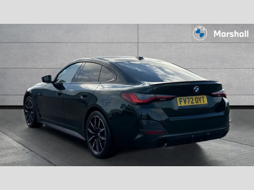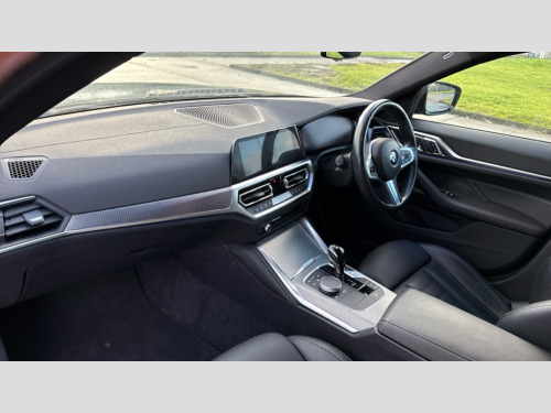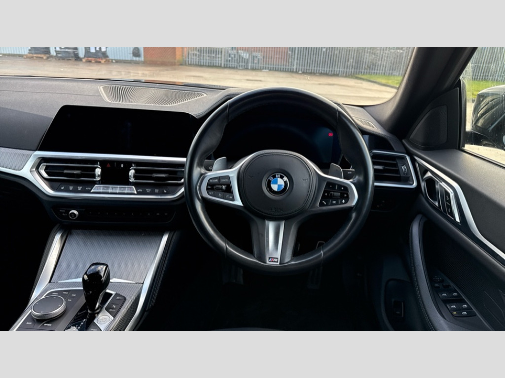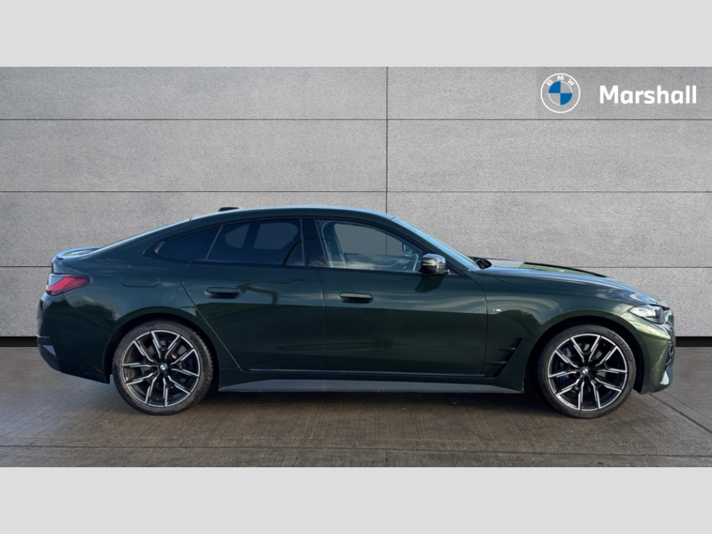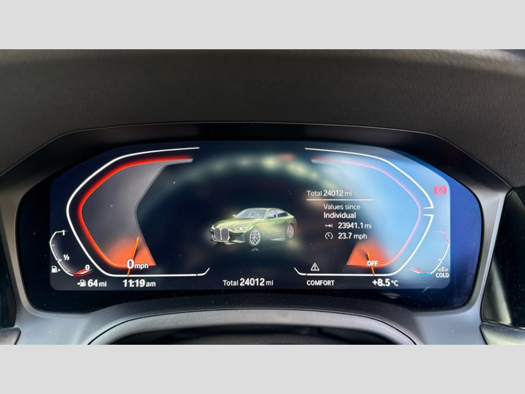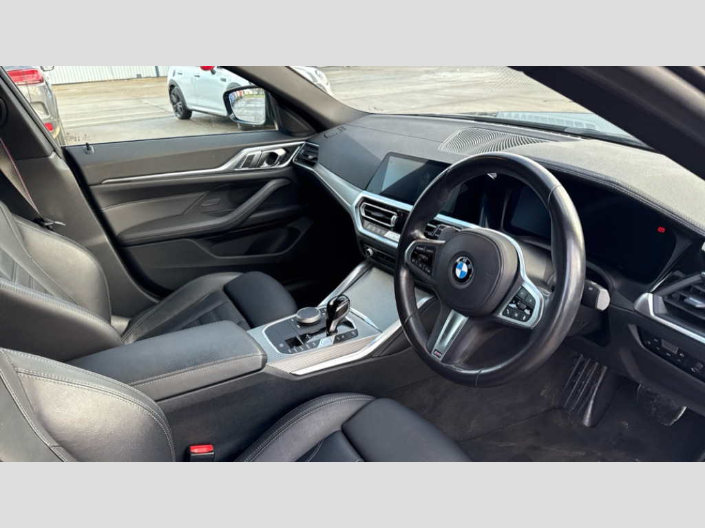 BMW 4 Series 430i M Sport 5dr Step Auto Active guard plus, Attentiveness assist, Auto start-stop, BMW ConnectedDrive online services, BMW iDrive controller on centre console, BMW Live Cockpit Professional Nav with 12.3" instrument display + 10.25" display, Intelligent Voice Assist, BMW OS 7, HDD, 2USB, 4G LTE connect, BMW service history, BMW Teleservices, Brake pad wear indicator in front and rear, Check Control warning system for monitoring of lights and door/luggage compartment open warning, Condition based service, Cruise control with speed limit function, Electric bootlid, Electric power steering with Servotronic steering optimised at all speed ranges, Gearshift time display in manual mode, Instrument cluster with speedometer with mph readout, tachometer, fuel gauge and oil temperature gauge, Integrated owners handbook, Oil sensor for level and grade, warning by check control system, On board computer - average speed, fuel consumption, outside temp display with acoustic warning, clock/date, service interval, odometer/trip meter, Optimum shift indicator, Shifting point display, Variable sport steering, 8 speed automatic steptronic transmission with gearshift paddles, Active sound design, Adaptive M suspension, Double joint spring strut front axle, Double VANOS, Drive performance control - ECO PRO, comfort and sport modes, Electronic differential lock control (EDLC), High precision injection, Low centre of gravity, M Sport differential, Petrol Particulate Filter, Sprint mode, Stroke dependent dampers, VALVETRONIC engine management, 2x USB Type C ports in front centre console for charging and data transfer, DAB tuner, Electronic service booklet, 3rd brake light, Acoustic glazing, Automatic headlight beam throw control with load dependent regulating reaction, dynamic compensation of braking dive and acceleration squat, Automatic windscreen wipers and automatic headlight, Automatically dimming electrochromatic rear view mirror, BMW emblem on engine compartment lid and tailgate, BMW Individual high gloss shadow line with extended contents, BMW individual lights shadow line, Body colour fuel filler flap, Body colour roof fin, Brushed aluminium inserts in the front door sill finishers with BMW designation, Door sill strips, Dynamic brake lights, Electric windows - front and rear, with open/close fingertip control, anti trap facility and comfort closing function all round, Exterior mirrors - electrically folding with anti-dazzle, Fading support, Follow me home headlights, Front and rear bumper system, Front apron plastic in body colour, Green tinted heat protection glazing, High gloss shadow line exterior trim, Illuminated bow type door handles in body colour drivers side with door lock, Interior rear view electrochromatic mirror with automatic anti dazzle function, LED daytime running lights, LED front fog lights, LED front indicators, Licence plate panel integrated into front bumper and tailgate, Lightweight engineering, M designation on front side panels, left and right, M rear boot spoiler with high gloss black gurney, Model designation on right side of tailgate, One piece front bumper cover including towing eye cover in body colour, Preparation for high beam assistant, Rear side wing doors, Rear wiper, Reversing light, Side frame decorative moulding black matt, Sun protection glass, Two part LED tailights in L-shape with components in smoked glass, brake light, LED turn indicator and rear fog light, Visible exhaust tailpipe finisher, Visible VIN plate, Welcome lights in interior and door handle area, Widened track and increased camber values for max transverse dynamics, agility and steering precision, Window recess cover black high gloss, Windscreen wipers with integrated heated washing jets, 12V power socket in front centre console, 2 front cupholder in centre console with clamping elements and matt black inlay, 3 rear headrests, 3 seat bench in 2nd row, 3 spoke M sport leather multifunction steering wheel, 3 zone automatic air conditioning, 4 pieces lashing eyelets in luggage compartment, 40:20:40 split folding rear seat and rear centre armrest with two cupholders, Anthracite headlining, Armrest integrated in front and rear door trim + front centre console armrest, BMW ID, Driver seat backrest width adjustment, Four grab handles integrated in roof lining, Front and rear door pockets, Front and rear reading lights, Front sport seats, Heated driver and front passenger seats, Height adjustable front headrests, Height adjustable mechanically and infinitely variable steering column, Illuminated armrest storage compartment, Illuminated glove compartment with separate small compartment, Make-up mirror lights, Single front passenger seat, Storage compartment in rear centre console, Sunvisors with illuminated vanity mirrors and ticket pocket, Toolkit located in luggage compartment, Velour front floor mats, Vernasca leather upholstery, Ambient lighting pack - 4 Series, Connected professional pack - 4 Series, M sport exterior styling pack - 4 Series, 3 point seatbelts on all seats, Battery safety cut-off, BMW emergency call, Brake energy regeneration, Braking pre-tensioning, Child proof locking system in rear door, Child seat ISOFIX attachment for the two outer rear seats, Coasting in idle in ECO PRO mode, Cornering brake control (CBC), Crash sensor activating of airbags, Unlocking doors, hazard warning lights, interior light, safety battery terminal, Driver and front passenger side airbags, integrated in the door side seat backrest bolsters for all seat variants, Driver/Front Passenger airbags, Dry braking, Dynamic brake control, Dynamic stability control + (DSC+) - Anti-lock Braking System (ABS) with brake assist and cornering brake control + Automatic Stability Control (ASC), Dynamic Traction Control - DTC, Electric parking brake including automatic hold function and automatic release of the parking brake when driving off, Front and rear ventilated brake disc, Front passenger manual airbag de