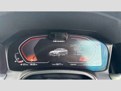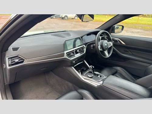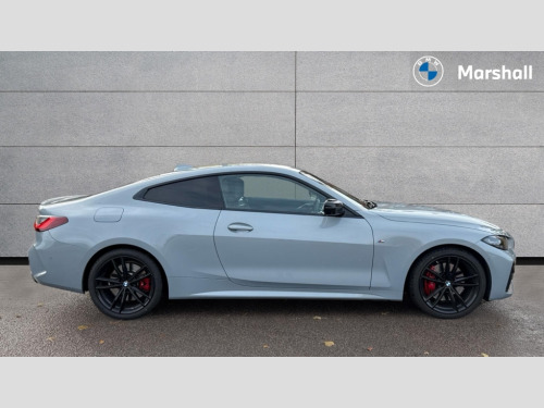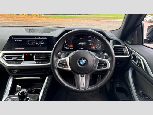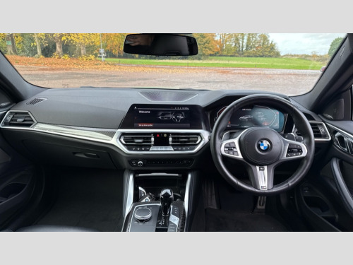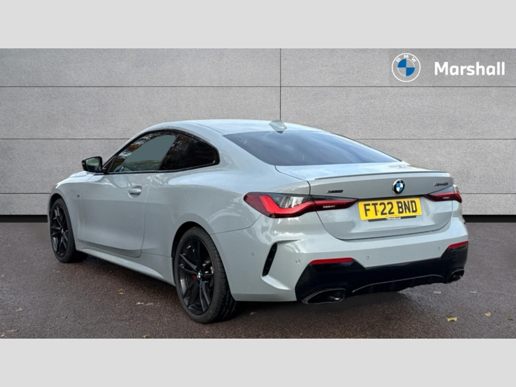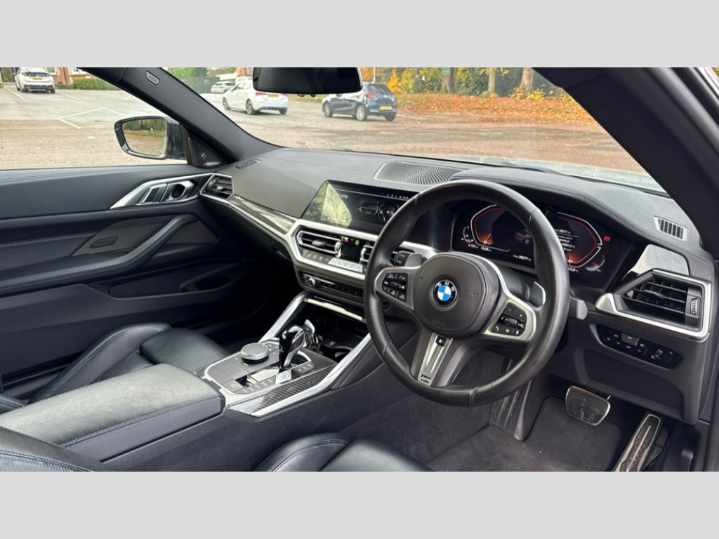 BMW 4 Series M440i xDrive MHT 2dr Step Auto Active guard plus, Attentiveness assist, Auto start-stop, BMW ConnectedDrive online services, BMW iDrive controller on centre console, BMW Live Cockpit Professional Nav with 12.3" instrument display + 10.25" display, Intelligent Voice Assist, BMW OS 7, HDD, 2USB, 4G LTE connect, BMW service history, BMW Teleservices, Brake pad wear indicator in front and rear, Check Control warning system for monitoring of lights and door/luggage compartment open warning, Condition based service, Electric power steering with Servotronic steering optimised at all speed ranges, Gearshift time display in manual mode, Instrument cluster with speedometer with mph readout, tachometer, fuel gauge and oil temperature gauge, Integrated owners handbook, Oil sensor for level and grade, warning by check control system, On board computer - average speed, fuel consumption, outside temp display with acoustic warning, clock/date, service interval, odometer/trip meter, Optimum shift indicator, Touch control functionality for BMW Live Cockpit Professional Nav, Variable sport steering, 48V Mild hybrid technology, 8 speed automatic steptronic transmission with gearshift paddles, Adaptive M suspension, Balanced 50/50 weight distribution, Driving experience modes - Comfort,ECO PRO,Sport and Sport+ mode, Low centre of gravity, M Sport differential, Petrol Particulate Filter, Stroke dependent dampers, xDrive system permanent all-wheel drive variable torque distribution, DAB tuner, Electronic service booklet, 3rd brake light, Acoustic glazing, Automatic headlight beam throw control with load dependent regulating reaction, dynamic compensation of braking dive and acceleration squat, Automatic windscreen wipers and automatic headlight, Automatically dimming electrochromatic rear view mirror, BMW emblem on engine compartment lid and tailgate, Body colour fuel filler flap, Body colour roof fin, Brushed aluminium inserts in the front door sill finishers with BMW designation, Dynamic brake lights, Electric windows - front and rear, with open/close fingertip control, anti trap facility and comfort closing function all round, Exterior mirrors - electrically folding with anti-dazzle, Fading support, Follow me home headlights, Front and rear bumper system, Front apron plastic in body colour, Green tinted heat protection glazing, Illuminated bow type door handles in body colour drivers side with door lock, Interior rear view electrochromatic mirror with automatic anti dazzle function, LED daytime running lights, Licence plate panel integrated into front bumper and tailgate, Lightweight engineering, M designation on front side panels, left and right, M rear boot spoiler, One piece front bumper cover including towing eye cover in body colour, Preparation for high beam assistant, Rear boot, Reversing light, Side frame decorative moulding black matt, Twin exhaust tailpipes x2, Two part LED tailights in L-shape with components in smoked glass, brake light, LED turn indicator and rear fog light, Visible VIN plate, Welcome lights in interior and door handle area, Widened track and increased camber values for max transverse dynamics, agility and steering precision, Window recess cover black high gloss, Windscreen wipers with integrated heated washing jets, xDrive designation on left tailgate, 12V power socket in front centre console, 2 front cupholder in centre console with clamping elements and matt black inlay, 2 Rear seat headrests, 2 seat bench in second row, 3 spoke M sport leather multifunction steering wheel, 3 zone automatic air conditioning, 4 pieces lashing eyelets in luggage compartment, 40:20:40 split folding rear seat and rear centre armrest with two cupholders, Ambient lighting with welcome carpet light, Anthracite headlining, Armrest integrated in front and rear door trim + front centre console armrest, Four grab handles integrated in roof lining, Front and rear door pockets, Front and rear footwell lights, Front and rear reading lights, Front headrests, Front passenger seat, Heated driver and front passenger seats, Height adjustable mechanically and infinitely variable steering column, Illuminated armrest storage compartment, Illuminated glove compartment with separate small compartment, Luggage compartment light, Make-up mirror lights, Storage compartment in rear centre console, Sunvisors with vanity mirrors and ticket pocket, Toolkit located in luggage compartment, USB type - C cable charging function in the rear centre console, Velour front floor mats, Connected professional package - 4 Series, M sport exterior styling pack - 4 Series M440i, 2 x 3-point rear seatbelts, Battery safety cut-off, BMW emergency call, Brake energy regeneration, Braking pre-tensioning, Child seat ISOFIX attachment for the two outer rear seats, Coasting in idle in ECO PRO mode, Cornering brake control (CBC), Crash sensor activating of airbags, Unlocking doors, hazard warning lights, interior light, safety battery terminal, Driver and front passenger side airbags, integrated in the door side seat backrest bolsters for all seat variants, Driver/Front Passenger airbags, Dry braking, Dynamic brake control, Dynamic stability control + (DSC+) - Anti-lock Braking System (ABS) with brake assist and cornering brake control + Automatic Stability Control (ASC), Dynamic Traction Control - DTC, Electric parking brake including automatic hold function and automatic release of the parking brake when driving off, Electronic differential lock control (EDLC), Front and rear ventilated brake disc, Front passenger manual airbag deactivation, Head airbags for all 4 outer seats, Hill start assistant, M Sport seatbelts, Seat belt security check for driver and front passenger, Seat belt with belt stopper, pyrotechnic belt tensioners and belt force limiters, Side impact protection, Tyre pressure monitoring with three level warning strategy, Warning triangle and first aid kit, Alarm system (Thatcham 1) with remote control and electroni