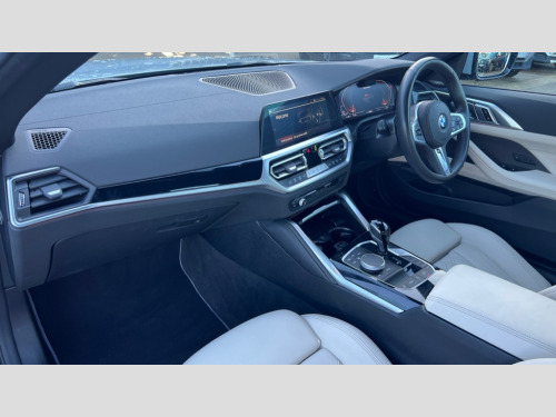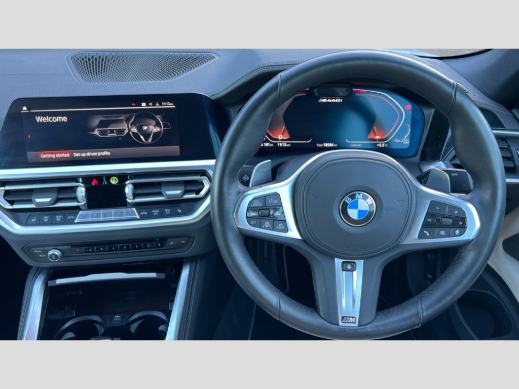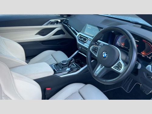 BMW 4 Series M440i xDrive MHT 2dr Step Auto Active guard plus, Attentiveness assist, Auto start-stop, Bluetooth hands free facility with USB audio interface with audio streaming, BMW ConnectedDrive online services, BMW iDrive controller on centre console, BMW service history, BMW Teleservices, Brake pad wear indicator in front and rear, Check Control warning system for monitoring of lights and door/luggage compartment open warning, Condition based service, Electric power steering with Servotronic steering optimised at all speed ranges, Gearshift time display in manual mode, Instrument cluster with speedometer with mph readout, tachometer, fuel gauge and oil temperature gauge, Integrated owners handbook, Oil sensor for level and grade, warning by check control system, On board computer - average speed, fuel consumption, outside temp display with acoustic warning, clock/date, service interval, odometer/trip meter, Optimum shift indicator, Run flat indicator, Shifting point display, Variable sport steering, 48V Mild hybrid technology, 8 speed automatic steptronic transmission with gearshift paddles, Active sound design, Adaptive M suspension, Balanced 50/50 weight distribution, Double joint spring strut front axle, Drive performance control - ECO PRO, comfort and sport modes, Low centre of gravity, M Sport differential, Petrol Particulate Filter, Sprint mode, Stroke dependent dampers, xDrive system permanent all-wheel drive variable torque distribution, 2x USB Type C ports in front centre console for charging and data transfer, 2x USB Type C ports in rear centre console for charging, DAB tuner, Electronic service booklet, Acoustic glazing, Automatic headlight beam throw control with load dependent regulating reaction, dynamic compensation of braking dive and acceleration squat, Automatic windscreen wipers and automatic headlight, Automatically dimming electrochromatic rear view mirror, BMW emblem on engine compartment lid and tailgate, BMW Individual high gloss shadow line with extended contents, BMW individual lights shadow line, Body colour fuel filler flap, Body colour roof fin, Brushed aluminium inserts in the front door sill finishers with BMW designation, Door sill strips, Dynamic brake lights, Electric windows - front and rear, with open/close fingertip control, anti trap facility and comfort closing function all round, Exterior mirrors - electrically folding with anti-dazzle, Fading support, Follow me home headlights, Front and rear bumper system, Front apron plastic in body colour, Green tinted heat protection glazing, High gloss shadow line exterior trim, Illuminated bow type door handles in body colour drivers side with door lock, Interior rear view electrochromatic mirror with automatic anti dazzle function, LED daytime running lights, LED front indicators, Licence plate panel integrated into front bumper and tailgate, Lightweight engineering, M designation on front side panels, left and right, Model designation on right side of tailgate, One piece front bumper cover including towing eye cover in body colour, Preparation for high beam assistant, Rear boot, Reversing light, Side frame decorative moulding black matt, Third brake light, Two part LED tailights in L-shape with components in smoked glass, brake light, LED turn indicator and rear fog light, Visible exhaust tailpipe finisher, Visible VIN plate, Welcome lights in interior and door handle area, Widened track and increased camber values for max transverse dynamics, agility and steering precision, Window recess cover black high gloss, Windscreen wipers with integrated heated washing jets, xDrive designation on left tailgate, 12V power socket in front centre console, 2 2nd row folding seats, 2 front cupholder in centre console with clamping elements and matt black inlay, 2 Rear seat headrests, 2nd row centre armrest with built-in cupholders, 3 spoke M sport leather multifunction steering wheel, 3 zone automatic air conditioning, 4 pieces lashing eyelets in luggage compartment, Anthracite headlining, Armrest integrated in front and rear door trim + front centre console armrest, Battery in luggage compartment, BMW ID, Electric seat adjustment with memory, Extended storage, Luggage compartment seprating net on side trim left and right, Four grab handles integrated in roof lining, Front and rear door pockets, Front and rear reading lights, Front sport seats, Heated driver and front passenger seats, Height adjustable front headrests, Height adjustable mechanically and infinitely variable steering column, Illuminated armrest storage compartment, Illuminated glove compartment with separate small compartment, Make-up mirror lights, Single front passenger seat, Storage compartment in rear centre console, Sunvisors with illuminated vanity mirrors and ticket pocket, Through load system, Toolkit located in luggage compartment, Velour front floor mats, Ambient lighting pack - 4 Series, Connected professional package - 4 Series, M sport exterior styling pack - 4 Series M440i, 2 x 3-point rear seatbelts, Battery safety cut-off, BMW emergency call, Brake energy regeneration, Braking pre-tensioning, Child seat ISOFIX attachment for the two outer rear seats, Coasting in idle in ECO PRO mode, Cornering brake control (CBC), Crash sensor activating of airbags, Unlocking doors, hazard warning lights, interior light, safety battery terminal, Driver and front passenger side airbags, integrated in the door side seat backrest bolsters for all seat variants, Driver/Front Passenger airbags, Dry braking, Dynamic brake control, Dynamic stability control + (DSC+) - Anti-lock Braking System (ABS) with brake assist and cornering brake control + Automatic Stability Control (ASC), Dynamic Traction Control - DTC, Electric parking brake including automatic hold function and automatic release of the parking brake when driving off, Electronic differential lock control (EDLC), Front and rear ventilated brake disc, Front passenger manual airbag deactivation, Head a
