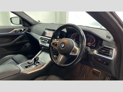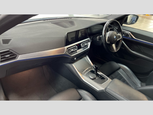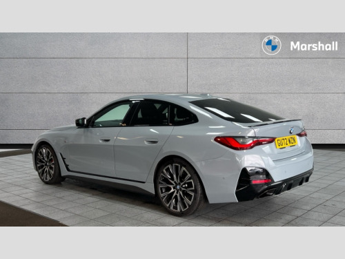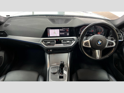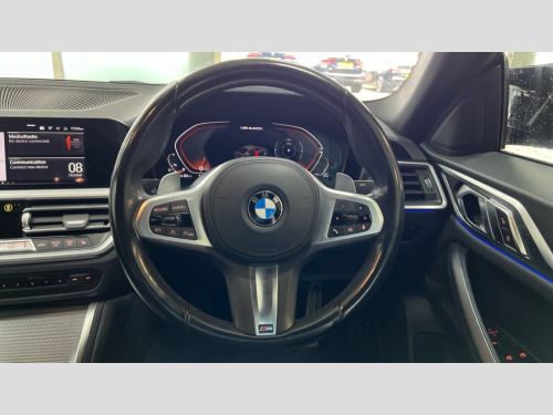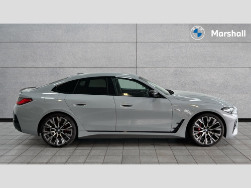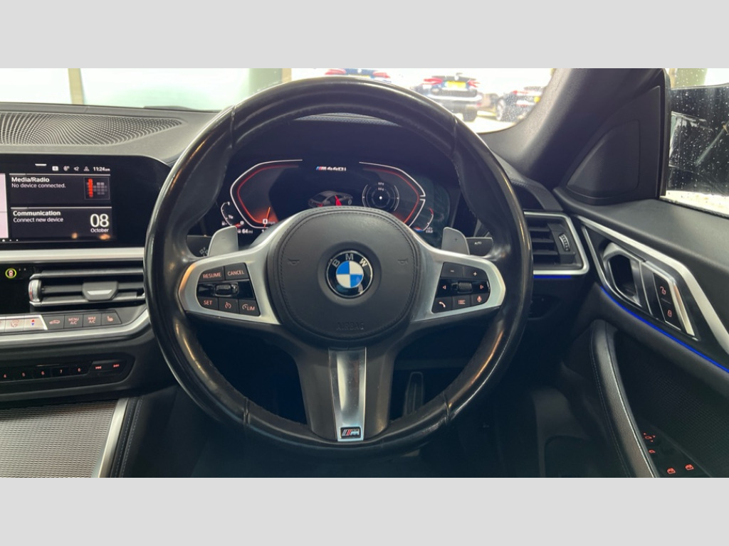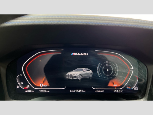 BMW 4 Series M440i xDrive MHT 5dr Step Auto Active guard plus, Attentiveness assist, Auto start-stop, BMW ConnectedDrive online services, BMW iDrive controller on centre console, BMW Live Cockpit Professional Nav with 12.3" instrument display + 10.25" display, Intelligent Voice Assist, BMW OS 7, HDD, 2USB, 4G LTE connect, BMW service history, BMW Teleservices, Brake pad wear indicator in front and rear, Check Control warning system for monitoring of lights and door/luggage compartment open warning, Condition based service, Electric bootlid, Electric power steering with Servotronic steering optimised at all speed ranges, Gearshift time display in manual mode, Instrument cluster with speedometer with mph readout, tachometer, fuel gauge and oil temperature gauge, Integrated owners handbook, Oil sensor for level and grade, warning by check control system, On board computer - average speed, fuel consumption, outside temp display with acoustic warning, clock/date, service interval, odometer/trip meter, Optimum shift indicator, Tailgate, Variable sport steering, 48V Mild hybrid technology, 8 speed automatic steptronic transmission with gearshift paddles, Adaptive M suspension, Driving experience modes - Comfort,ECO PRO,Sport and Sport+ mode, Low centre of gravity, M Sport differential, Petrol Particulate Filter, Stroke dependent dampers, xDrive system permanent all-wheel drive variable torque distribution, DAB tuner, Electronic service booklet, Acoustic glazing, Automatic headlight beam throw control with load dependent regulating reaction, dynamic compensation of braking dive and acceleration squat, Automatic windscreen wipers and automatic headlight, Automatically dimming electrochromatic rear view mirror, BMW emblem on engine compartment lid and tailgate, Body colour fuel filler flap, Body colour roof fin, Brushed aluminium inserts in the front door sill finishers with BMW designation, Dynamic brake lights, Electric windows - front and rear, with open/close fingertip control, anti trap facility and comfort closing function all round, Exterior mirrors - electrically folding with anti-dazzle, Fading support, Follow me home headlights, Front and rear bumper system, Front apron plastic in body colour, Green tinted heat protection glazing, Illuminated bow type door handles in body colour drivers side with door lock, Interior rear view electrochromatic mirror with automatic anti dazzle function, LED daytime running lights, Licence plate panel integrated into front bumper and tailgate, Lightweight engineering, M designation on front side panels, left and right, M rear boot spoiler, One piece front bumper cover including towing eye cover in body colour, Preparation for high beam assistant, Rear side wing doors, Rear wiper, Reversing light, Side frame decorative moulding black matt, Twin exhaust tailpipes x2, Two part LED tailights in L-shape with components in smoked glass, brake light, LED turn indicator and rear fog light, Visible VIN plate, Welcome lights in interior and door handle area, Widened track and increased camber values for max transverse dynamics, agility and steering precision, Window recess cover black high gloss, Windscreen wipers with integrated heated washing jets, xDrive designation on left tailgate, 12V power socket in front centre console, 2 front cupholder in centre console with clamping elements and matt black inlay, 3 rear headrests, 3 seat bench in 2nd row, 3 spoke M sport leather multifunction steering wheel, 3 zone automatic air conditioning, 4 pieces lashing eyelets in luggage compartment, 40:20:40 split folding rear seat and rear centre armrest with two cupholders, Ambient lighting with welcome carpet light, Anthracite headlining, Armrest integrated in front and rear door trim + front centre console armrest, Four grab handles integrated in roof lining, Front and rear door pockets, Front and rear footwell lights, Front and rear reading lights, Front headrests, Heated driver and front passenger seats, Height adjustable mechanically and infinitely variable steering column, Illuminated armrest storage compartment, Illuminated glove compartment with separate small compartment, Luggage compartment light, Make-up mirror lights, Single front passenger seat, Storage compartment in rear centre console, Sunvisors with vanity mirrors and ticket pocket, Toolkit located in luggage compartment, Velour front floor mats, Connected professional package - 4 Series, M sport exterior styling pack - 4 Series M440i, 3 point seatbelts on all seats, Battery safety cut-off, BMW emergency call, Brake energy regeneration, Braking pre-tensioning, Child proof locking system in rear door, Child seat ISOFIX attachment for the two outer rear seats, Coasting in idle in ECO PRO mode, Cornering brake control (CBC), Crash sensor activating of airbags, Unlocking doors, hazard warning lights, interior light, safety battery terminal, Driver and front passenger side airbags, integrated in the door side seat backrest bolsters for all seat variants, Driver/Front Passenger airbags, Dry braking, Dynamic brake control, Dynamic stability control + (DSC+) - Anti-lock Braking System (ABS) with brake assist and cornering brake control + Automatic Stability Control (ASC), Dynamic Traction Control - DTC, Electric parking brake including automatic hold function and automatic release of the parking brake when driving off, Electronic differential lock control (EDLC), Front and rear ventilated brake disc, Front passenger manual airbag deactivation, Head airbags for all 4 outer seats, Hill start assistant, M Sport seatbelts, Seat belt security check for driver and front passenger, Seat belt with belt stopper, pyrotechnic belt tensioners and belt force limiters, Side impact protection, Tyre pressure monitoring with three level warning strategy, Warning triangle and first aid kit, Alarm system (Thatcham 1) with remote control and electronic engine immobiliser, Central locking switch for all doors, fuel filler cap and luggage co