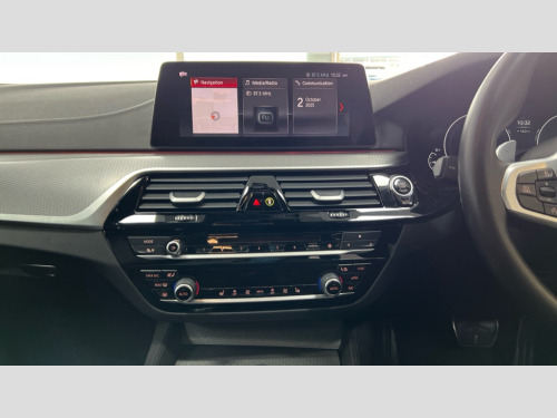 BMW 5 Series 520i M Sport 4dr Auto 20GB Hard drive, Active Guard incl speed limiting and lane departure functions with auto steering, and front collision warning with brake intervention, Average speed gauge, BMW Online services, BMW remote services, BMW Teleservices, Brake force display, Digital cockpit, Fuel consumption and range, iDrive controller and display with 10.2" colour display monitor, iDrive touch controller with shortcut buttons, Journey computer, Navigation System Professional Multimedia, Oil sensor for level and grade, On board computer, On-board diagnosis - OBD, Outside temperature display, Personal Profile, Real time traffic information, Service interval indicator, Speed limiter, Voice control system, Anti roll bar front and rear, Automatic transmission with gearshift paddles, Drive performance control with ECO PRO comfort + sport mode, Petrol Particulate Filter, Auxiliary input socket, Bluetooth audio streaming, BMW professional radio/CD/MP3, DAB Digital radio, Favourite buttons, Acoustic glazing, Active air stream kidney grille, All round anti-corrosion system, Auto dimming rear view mirror, Body colour door handles, Body coloured bumpers, Body coloured door mirrors, Body coloured side sills, Dynamic brake lights with LED technology, Electric + heated aspheric door mirrors, Electric front and rear windows with fingertip open/close + anti-trap all round, Follow me home headlights, Heated windscreen washer jets, Illuminated door handles, Individual door sill finishers, Interior rear view electrochromatic mirror with automatic anti dazzle function, LED daytime running lights, LED fog lights, Left and right single chrome quadrilateral exhaust tailpipes, M aerodynamic body kit, M designation on left and right front side panels, Rain sensor with auto light activation system, 12V power socket in rear, 2 X front 12v power sockets, 3 Spoke M sports leather steering wheel, Ambient interior lighting, Battery in luggage with jump start facility, Front and rear door sill inlays with illuminated BMW M designation, Front and rear footwell lights, Front centre armrest, Front cupholders x 2, Lockable glove compartment with light, M specific floor mats, M specific key, M specific pedals, M specific steering wheel, Multi-function controls for steering wheel, Reach + rake adjustable steering column, Rear centre armrest with 2 cupholders + storage, Rear headrests, Anti-lock brakes, Automatic Stability Control (ASC), BMW emergency call, Brake assist function, Brake energy regeneration, Child seat ISOFIX attachment rear outer seats, Cornering brake control (CBC), Crash Sensor - activation of central locking release, hazard warning light and interior lighting, Deformation zones front and rear with door reinforcements and bumpers that regenerate, Driver/front passenger, rear and side airbags, Driver/Passenger airbags (Impact dependent), DSC+, Dynamic brake control, Dynamic Traction Control - DTC, Electromechanical parking brake with automatic drive away release and auto hold function, Electronic brake force distribution, Engine drag torque control, Front head restraints with anti-whiplash, Front passenger airbag deactivation, Head airbags for first and second row seats, Hill start assist, Seat belts front inertia reel with pyrotechnical belt latch tensioner, belt force limiter and belt restrainer, Side impact protection, Three inertia reel rear seatbelts, Two tone horn, Tyre pressure monitoring system, Warning triangle and first aid kit, Alarm system with remote control and engine immobiliser, Locking wheel bolts, Remote central locking