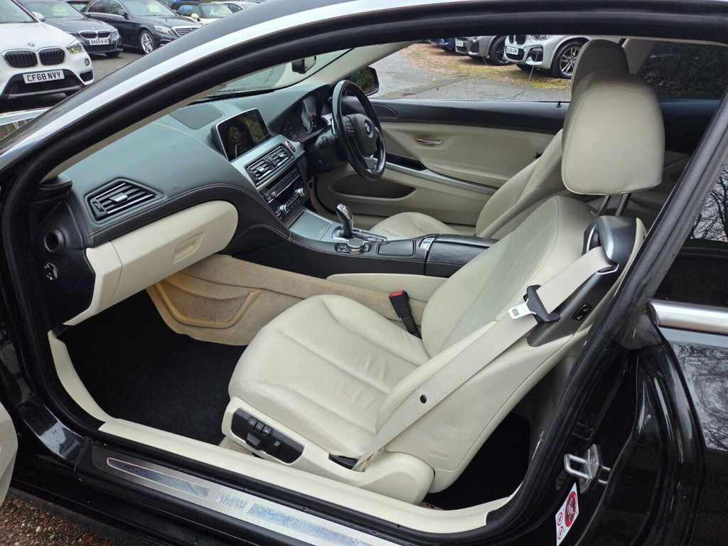 STUNNING BMW 640I SE COUPE 2 DOOR AUTO OFFERED IN GLEAMING BLACK SAPPHIRE METALLIC PAINT/IVORY DAKOTA LEATHER/HEATED SEATS/SATELLITE NAVIGATION/BLUETOOTH/DAB RADIO/DUAL ZONE CLIMATE CONTROL/MULTI FUNCTION STEERING WHEEL/CRUISE CONTROL/ELECTRIC DOOR MIRRORS/SUN PROTECTION GLASS/18 INCH ALLOY WHEELS/FRONT AND REAR PARKING SENSORS/SERVICE HISTORY/EXCELLENT CONDITION INSIDE AND OUT/PX WELCOME. 12V Power Socket - Centre Console Beneat, 12v Power Socket - Small Folding Compart, 18in Alloy Wheels - Light Star Spoke Sty, 20GB HDD Memory, ABS - Anti Lock Braking System, Air Conditioning - Automatic - Dual Zone, Air Inlet - Front with Chrome Finisher, Airbags - Driver, Airbags - Front Side, Airbags - Impact Dependent System for Dr, Airbags - Passenger, Airbags - Passenger Deactivation, Alarm System Thatcham 1 with Remote Cont, Ambient Interior Lighting, Armrest - Front with Storage Compartment, ASC - Automatic Stability Control, Automatically Dimming Rear View Mirror, Auxiliary Input, Battery in Luggage Compartment, Black Sapphire, BMW Apps Interface, BMW ConnectedDrive Online Services,