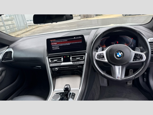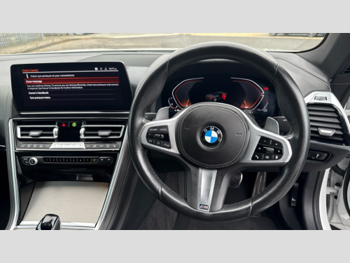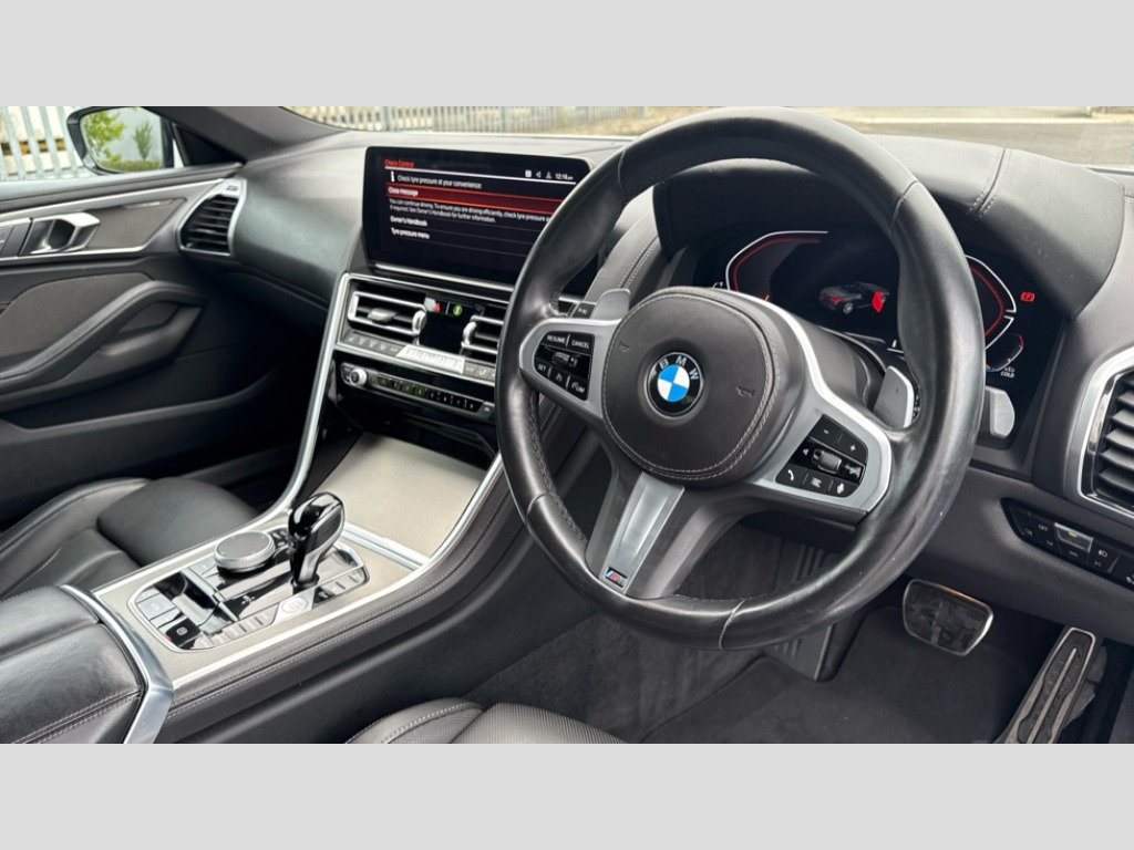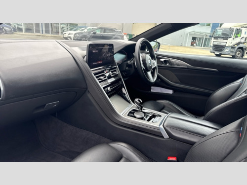 BMW 8 Series 840i M Sport 2dr Auto Automatic tailgate operation, remote opening with key, closing by tailgate button or remote control including tailgate in LED technology, Bluetooth hands free facility with USB audio interface, voice control and enhanced bluetooth + Wireless charging, BMW ConnectedDrive online services, BMW legal emergency call, BMW Teleservices, Brake pad wear indicator, Check control system, Condition based service, Drive experience control with Sport, Comfort, Eco Pro and Adaptive modes, Electric bootlid, Head up Display, iDrive controller with shortcut buttons, Instrument and upper door panel in walknappa leather, Integrated owners handbook, Light on warning, Oil sensor for level and grade, On board computer, Outside temperature display, Run flat indicator, Service interval indicator, Servotronic system, Speed limiter, Wi-Fi hotspot, Adaptive M suspension, Double wishbone front axle, Dynamic Damper Control, Eight speed sport automatic transmission, M Sport differential, Petrol Particulate Filter, Sport exhaust system, DAB Digital radio, Favourite buttons, Air breather inlay in pearl chrome, frame in black high gloss, Automatic windscreen wipers and automatic headlight, Carbon core, Climate comfort windscreen, Daytime driving lights front and rear active, Dynamic brake lights, Exterior mirrors - Floating design mirror, electric adjust/heated/folding, aspherical, Follow me home headlight function, Frameless interior mirror, Front and rear bumper system with replaceable deformation elements, Front electric windows, Front ornamental grille with kidney grille bars, Fully automatic and lined softtop, Heated rear window, glass, Heated windscreen washer jets, High beam assistant, Illuminated door handles, LED rear lights, M emblem on front side panel in light chrome, Model logo on right tailgate, Radiator grille frame in pearl chrome, Radiator grille struts in aluminium matt, Rain sensor and automatic driving lights control, Rear boot, sDrive designation on left tailgate, Thermally insulated windscreen, Third LED technology brake light in tailgate, Welcome lights in interior and door handle area, Wind deflector, Window frame and mirror base in black high gloss, 2 cup holders in front, 2 rear head restraints, 2 X front 12v power sockets, 3 spoke M sport leather multifunction steering wheel with shift paddle, 4 seats, 50/50 split folding rear seat, Ambient light with dynamic interior light, Automatic air conditioning with 2-zone control, BMW ID, Front centre armrest with light, 12V socket and USB and storage compartment, Front door pockets, Front entry lights doors, Front reading lights, Front seat heating, Front sun visors with ticket holder and illuminated mirror, Interior lighting - Interior light front centre above interior mirror,luggage compartment light,automatic interior light system soft on/soft off, Lashing eyelets, Lockable glove compartment with light, Microfilter and active carbon filter, Steering column with adjustable height and length and activation via control on the steering column, Through loading function, Warm air collar, BMW Live cockpit professional pack - 8 Series, Connected professional pack - 8 Series, Exterior items pack - 8 Series, M sport exterior styling aerodynamics pack - 8 Series, 18" M Sport braking system with blue painted brake calipers, ABS/EBD, Active protection, Airbags - Driver and front passenger airbag with seat occupancy detection, knee, side and front passenger seat airbag deactivation, Brake discs, compound structure, Cornering brake control (CBC), Crash sensor activating central locking release, hazard warning lights, fuel cut off, interior lighting, safety battery terminal clamp and airbags, DSC - Dynamic Stability Control, Dynamic brake control, Dynamic Traction Control - DTC, Electromechanical parking brake with automatic drive away release and auto hold function, Front three point with pyrotechnical belt latch tensioner seat belts, belt force limiter and belt stopper, Hill start assist, Integrated brake system, ISOFIX child seat mounting for the two outer rear seats, Rear three point with pyrotechnical belt latch tensioner seat belts and belt force limiter, Roll over protection system, Side impact protection, Tyre pressure monitoring system (TPMS), Warning triangle and first aid kit, Alarm system (Thatcham 1) with electronic engine immobiliser, Centre lock switch, Closing system with central locking, Comfort access system, Keyless entry with start/stop button, Locking wheel bolts, Vehicle key with exclusive M designation