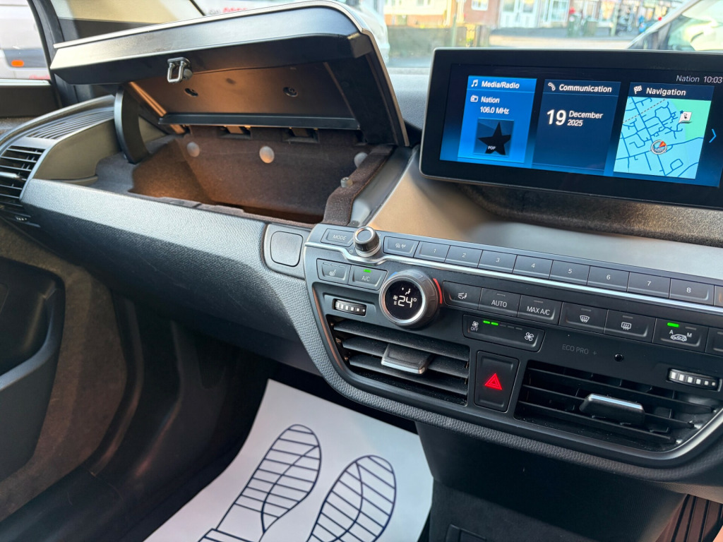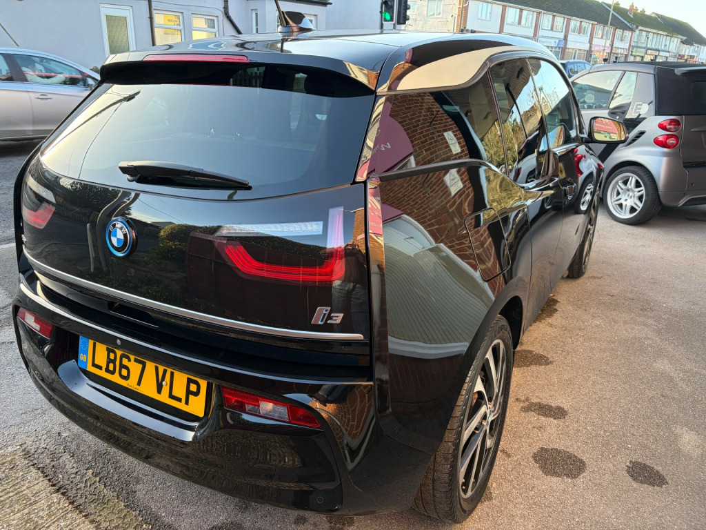 This 2018 BMW i3 33kWh 90Ah Hatchback 5dr Electric Auto (170 ps) has traveled just 36800 miles and supplied with a new MOTThis brilliant little electric vehicle is ULEZ compliant and features a spacious interior with 4 seats and 4 doors, making it perfect for city driving. The car includes desirable features such as 19in Alloy Wheels - i BiColour Light Turbine Styling - Widescreen display, Heated Seats, Sun Protection Glazing, Apple CarPlay, and a Loudspeaker System by Harman Kardon. Finished in a stylish and modern Fluid Black with Highlight BMW i Blue, this efficient hatchback is ready to hit the road with its energy-saving electric capabilities and impressive design.UK delivery. PX welcome. v power socket - centre console, 5.7in colour tft display - instrument cluster, additional 12v power socket in right-hand side of boot, bmw connecteddrive online services, bmw connecteddrive services and applications, bmw emergency call, bmw professional radio, bmw teleservices, bluetooth hands free with usb audio interface, dab digital radio, dc rapid charge preparation, navigation system - bmw professional multimedia, real time traffic information, remote services, shark fin aerial, 19in alloy wheels - i light streamline star-spoke style - 427, bmw mobility kit with tyre sealing system, bumper system - front and rear, contrast highlights in bmw i blue - kidney grille surrounds and highlighting below doors, direction indicator - side repeaters - integrated in exterior mirrors, direction indicator lights using led technology located on front bumper, electric windows - front with open-close fingertip control - anti-trap facility and comfort closing function, exterior mirrors - electrically folding with anti dazzle, exterior parts in body colour, exterior parts in contrast high-gloss black, heat protection glazing with green tint, high-gloss black wheel arch extensions, kidney grille chrome high-gloss with contrast frame in bmw i blue, lightweight alloy wheels with unique streamline design, lightweight engineering featuring carbon-fibre reinforced plastic - cfrp body structure, locking wheel bolts, model designation, model designation - i3 rear, rear fog light located in bumper, rear window - integrated into tailgate, reversing lights located in bumper, side windows, tyres - reduced rolling resistance, window surrounds - black, edrive designation - rear, 2.4 kw ac charging, ac fast charge - multi phase preparation, bmw integrated differential transmission, brake pad wear indicator - front and rear, cabin pre-conditioning via idrive or bmw i remote app, condition based service, cruise control with brake function, drive performance control with eco pro plus - eco pro and comfort modes, eco pro mode to provide improved range, eco pro plus mode to maximise the potential range - limits top speed for 56mph, eps - electric power steering with servotronic, electronic display of drivetrain information and battery range and temperature, electronic drive selector located on steering column to select: drive-reverse-neutral-park, illuminated charging socket with visual display of charge status, obc - on-board computer, pdc - park distance control - rear, tpms - tyre pressure monitoring system, active differential brake - adb sport - electronic differential lock in dsc-off mode, airbags, alarm system, battery safety cut off - for drivetrain battery and 12v battery, child seat isofix attachment - rear x2, crash sensor, dsc - dynamic stability control plus, dynamic brake lights, electric handbrake located on centre console between driver and passenger seats, first aid kit and warning triangle, remote control including integrated key - 2, seat belt security check for driver and front passenger, side impact protection, three-point seat belts - all seats, visible vin, additional detachable cupholder, air conditioning - automatic - single zone, armrest - front centre foldable with integrated storage compartment, central locking switch, cupholders - centre, door sill finished in black, extended storage, flap in rear side panel - right with push function to open, floor mats - velour - anthracite, gear selector switch located on steering column, glove box with partitioned sections, grab handles - integrated in roof lining - front, headrests - front - integrated into seat backrests, indicators, interior lighting - front centre over interior mirror and rear centre, interior trim - andesit silver matt, luggage compartment - light, luggage compartment access via recessed handle below tailgate, multifunction controls for steering wheel, personal profile, rain sensor, rear seat headrests - folding - two, rear shelf cover, seat heating - front, seats - 50-50 split folding rear, seats - x4 with individual seat designs in the front and rear, side armrests - front integrated into door trim, slide through light-weight front seats, start-stop button with comfort go keyless engine start, steering wheel - leather multifunction two spoke - black with unique bmw i blue accent, steering-wheel column adjustment - manual, storage compartment - front doors, sun visors with vanity mirrors and ticket holder, twin horns, check control warning system for monitoring of lights and door-luggage compartment open warning, daytime running lights - led with u shaped bmw i design, high-level third brake light integrated into rear spoiler, led headlights, lights-on warning by audio warning signal when ignition is switched off, rear lights - led integrated into tailgate