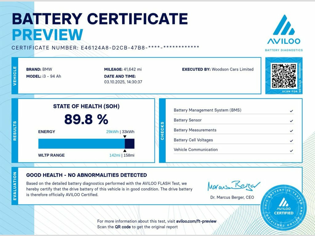 ** Soft Credit Search Pre Approval ** ** 1 Previous Owner ** This BMW i3 33kWh Hatchback Plug-In-Hybrid Auto Euro 6 Range Extender (170bhp) has covered 41000 miles in blue with two tone cloth interior. DAB Radio, sat nav, bluetooth, parking sensors, isofix, privacy glass + much more. *MAIN DEALER PART EXCHANGE* Warranty included. VOSA Mileage History Checked and HPI Clear. Vehicle has received an independent health check with report ++ Any inspection is more than welcome ++ Nationwide Delivery Service Available ++ Credit/Debit Card Accepted ++ Approved Finance Partner with Consumer Credit Licence ++ Call/Message anytime including evenings ++ Facetime/Video Call Available Around Your Schedule ++ Warranty Included. Late Night Appointments Available. Woodson Cars, Manchester. 01618509848 (For Sat Nav use Postcode M44 5AH) Driving Assistant Plus, Comfort Access System, 12V Power Socket - Centre Console, 19in Alloy Wheels - i Light Streamline S, 3.5mm Auxiliary Input Point for Auxiliar, 5.7in Colour TFT Display - Instrument Cl, AC Fast Charge - Multi Phase Preparation, Active Differential Brake - ADB Sport - , Additional Detachable Cupholder, Air Conditioning - Automatic - Single Zo, Airbags, Alarm System - Thatcham 1 with Remote Co, Armrest - Front - Folding with Storage C, BMW ConnectedDrive Online Services, BMW ConnectedDrive Services and Applicat, BMW Emergency Call, BMW Integrated Differential Transmission, BMW Mobility System, BMW Navigation System, BMW Professional Radio, BMW TeleServices, Battery Safety