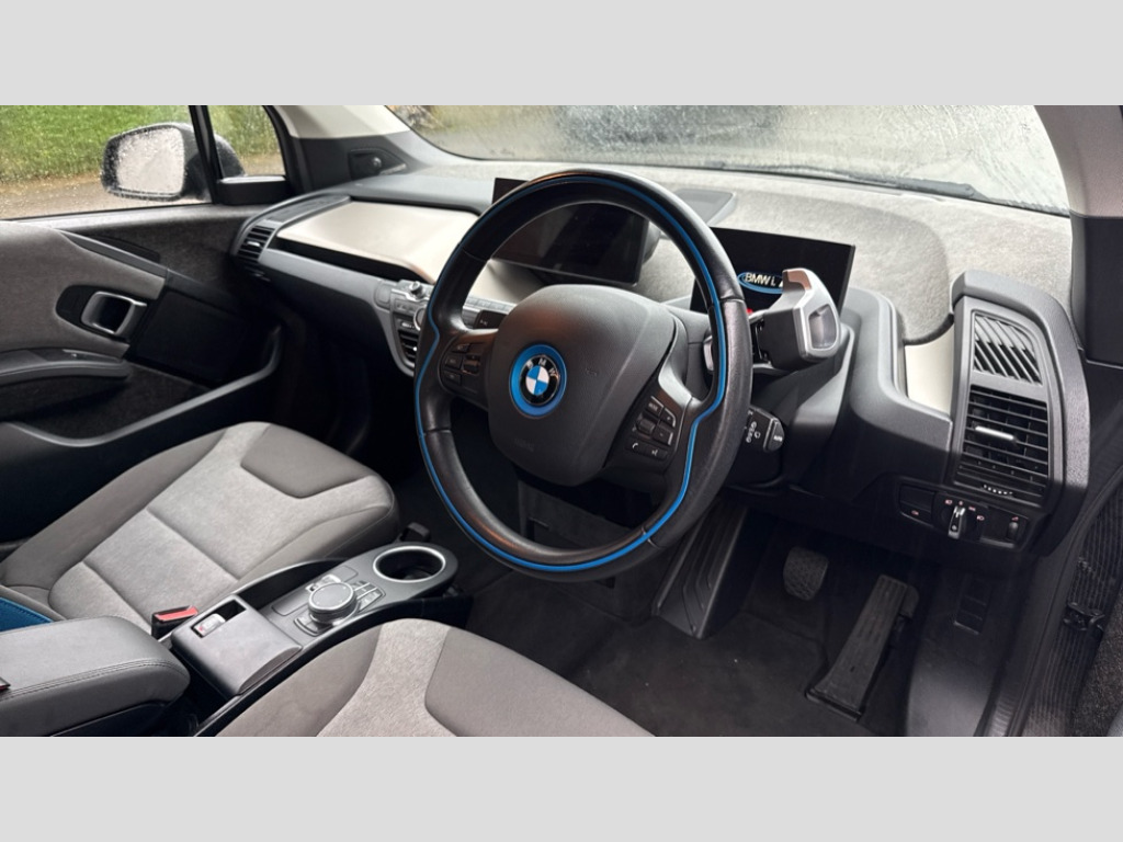 BMW I3 125kW 42kWh 5dr Auto 5.7" colour TFT Instrument cluster display - speedometer and readout, power and range information, Apple car play, Bluetooth hands free telephone facility with USB audio interface and audio streaming, BMW apps interface, BMW ConnectedDrive - Assist, BMW live tiles with charging, dynamic range map, integrated handbook, iDrive Touch Control with buttons, TMC information used to dynamic route plans, BMW Online services, BMW Professional Multimedia Navigation system - 10.25" LCD screen with BMW i design, dynamic route planning and 8 buttons, BMW remote services, BMW Teleservices, Connected eDrive Services, ECO PRO mode to improve range, ECO PRO+ mode to maximise the potential range (top speed 56mph) significant gains in range through a series of onboard electronic measures, Electronic display of drivetrain information and battery range and temperature, Front and rear Brake pad wear indicator, Lights on warning by audio warning signal when ignition is switched off, On board computer - average speed+fuel consumption, service interval, clock/date, odometer/trip meter, outside temperature display and ice warning, Personal profile with automatic lock when driving away selectable, preferences and favourites to a personal profile within the vehicle, Real time traffic information, Servotronic variable electric power steering (EPS), 12V compressor with integrated sealant injection bottle and hose, 2.4kW AC charging with 5m cable, AC Fast charge cable, BMW eDrive motor, BMW integrated differential transmission with electronic parking lock and single forward and reverse gears, Drive performance control with ECO PRO+, ECO PRO and comfort modes, Li-ion battery with active cooling and 38kWh usable energy with aluminium radiator, 8 modules ,integrated battery storage management electronics (SME), Safety battery cut-off for drive train and 12V, Auxiliary point for auxiliary devices, DAB Digital radio, Black finished door sills, Black window surrounds, Black with integrated LED brake light in rear spoiler, Body colour front and rear bumpers, doors and door handles, Contrast highlights in BMW i Blue - Kidney grille surrounds below doors, Direction indicator side lights in exterior mirrors, Dynamic brake lights, Electrically adjustable high gloss black exterior mirror with aspheric on drivers side, convex on passenger side mirrors, Electrically folding, anti dazzle, heated memory, auto parking function, heated washer jets, electrochromatic, aspheric on passenger exterior mirrors, Flap in rear side panel, right with push function to open with C shaped indication band for battery condition integrated into central locking system, Front and rear bumper system with replaceable deformation elements, Front electric windows with open and close fingertip control, anti trap facility and comfort closing, Green tinted heat protection glazing, High gloss black bonnet, door mirrors, roof and tailgate with chrome optic trim, High level third brake light integrated into rear spoiler with front LED bumper, LED side mirror caps, LED rear integrated cluster behind tailgate, Integrated tailgate rear window with tempered safety glass, heated rear window, Kidney grille chrome high-gloss with contrast frame in BMW i Blue, LED direction indicator lights on front bumper, LED rear lights integrated into tailgate, Low A pillar panel, Model designation, Rain sensor with automatic windscreen wiper and headlight activation, Rear BMW i3 designation, Rear fog lights in bumper, Rear view mirror with automatic dipping of passenger mirror when reverse gear is selected to aid parking, Rear wiper, Reversing lights in bumper, Roof mouldings with matt chrome optic highlight, Shark fin roof aerial, Side windows with tempered safety glass, rear static fixed windows, Visible VIN plate, 12V power socket in centre console, 50/50 split folding rear seat, Additional 12V power socket in right-hand side of boot, Additional detachable cupholder, Anthracite Velour floor mats, Automatic interior light when door is opened/ignition switched off or via remote key, Cabin pre-conditioning via iDrive or BMW i Remote App, Central cupholder - additional cupholder with clip on function for centre console, Conditioned based service, DC rapid charge preparation, Electronic drive selector on steering column to select drive, reverse, neutral or park, Foldable front centre armrest with integrated storage compartment, Front and rear four seats with individual seat designs, Front and rear grab handles in roof linings, Front and rear map pockets, Front and rear side armrests integrated into door trim, Front integrated seat backrest and rear height adjustable headrest for all seats, Front seat heating, Gear selector switch on steering column with control lever in chrome pearl grey with leather inserts in black and gear visual indication, Glove box with partitioned sections, Illuminated charging socket in visual display, Isofix child seat attachment for two rear seats, Luggage compartment access via recessed handle below tailgate, Manually adjustment steering wheel column, Multi phase AC fast charge preparation, Multi-function controls for steering wheel, Neutronic Cloth upholstery, Pre-heating for battery with active air flap control, Rear shelf cover, Single zone automatic air conditioning, Slide through light weight front seats with easy access to driver or passenger seat, Storage compartment in driver and passenger doors, Sunvisors with vanity mirrors and ticket pocket, Two folding rear seat headrests, Atelier interior world pack - i3, Extended storage pack - I3, 2 x 3-point rear seatbelts, Active Differential Brake (ADB-Sport) in DSC-OFF mode, Airbags - Front driver/passenger, front and rear curtain head protection, front side, manual deactivation of front passenger airbag, Anti lock braking system (ABS) with brake assist, Automatic Stability Control (ASC), BMW emergency call, Brake drying, Brake energy regeneration, Braking readiness, Cornering 