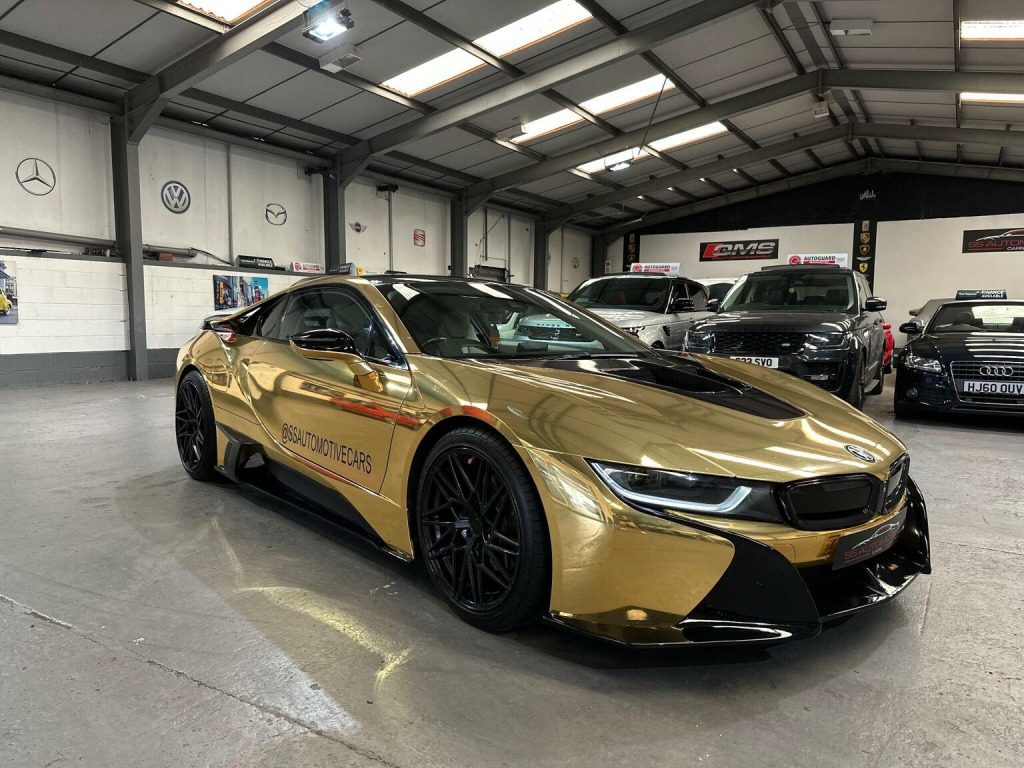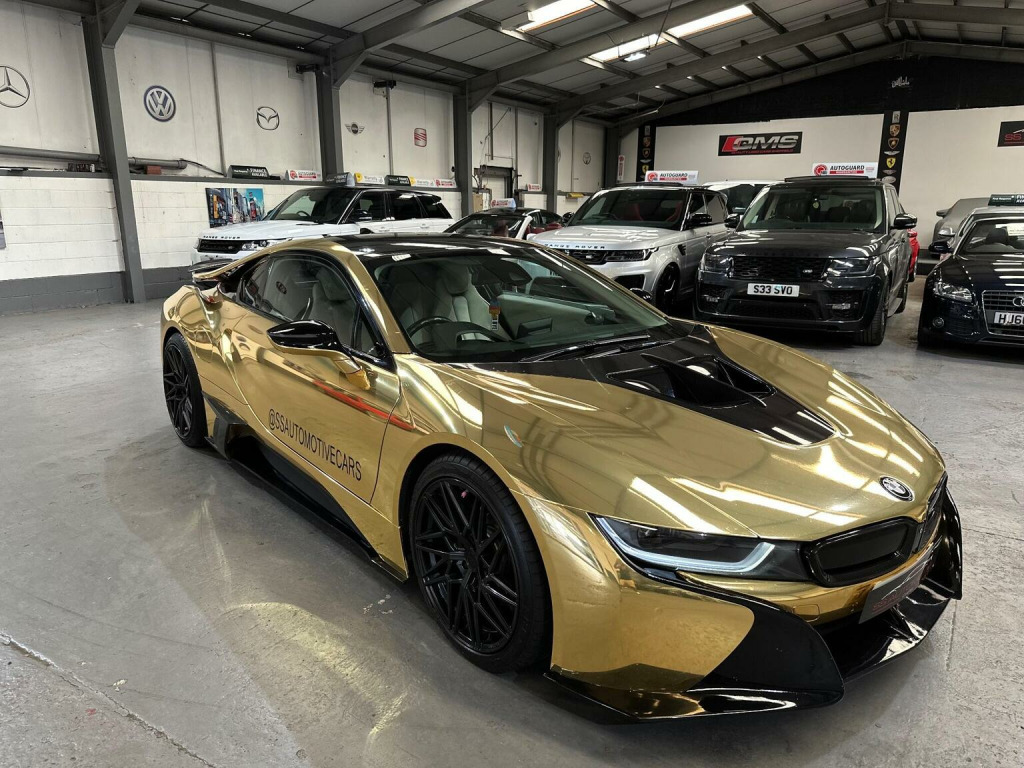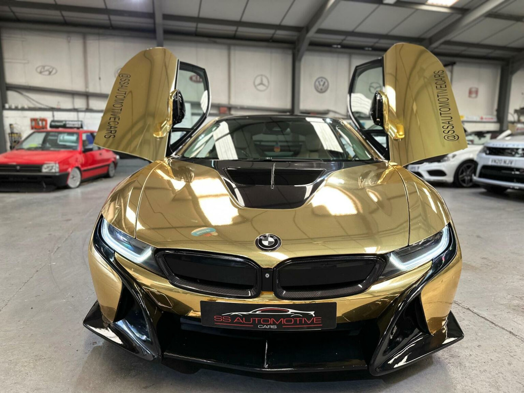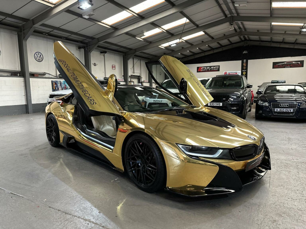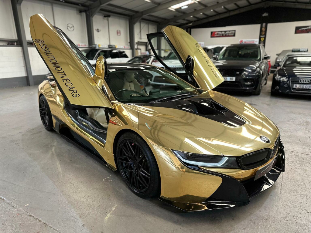 Here is our company owned BMW i8 2014, We have owned this vehicle from 2019 and used it for our own company advertising in summer so it has hardly been used less than 1000 miles a year, Currently on just under 50k miles, Full chrome gold wrap which was done in 2019. Does have some signs of wear now. , We may possibly re wrap some parts of front bumper to freshen up the car. Recently had full engine overhaul including , New timing chain, Waterpump, Cooler, Coolant pumps and more , Costing around £7000, It is always dry stored in our showroom on trickle charge, Custom Bodykit, Front splitter, Rear diffuser, Side skirts, Spoiler , 20 velare alloy wheels powder coated , Some body styling parts are dipped in carbon, Lovely vehicle. Real head turner, Not in rush to sell , Plate can be purchased separate if wanted , E 18 BYE, HPI clear, 2 keys