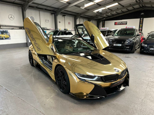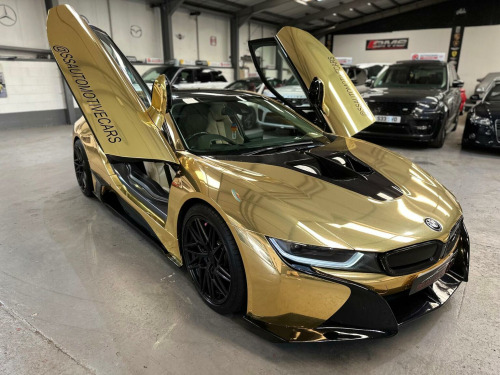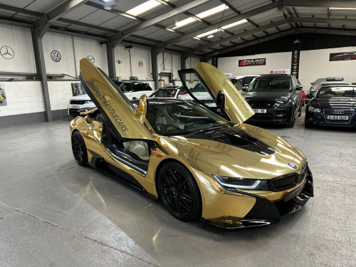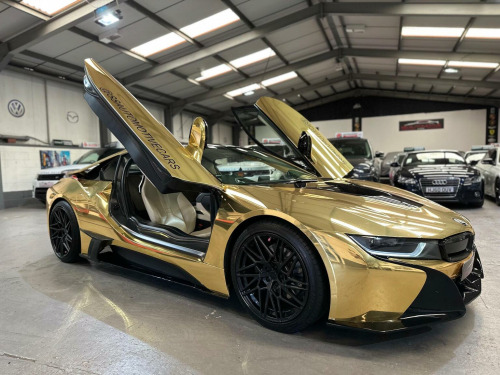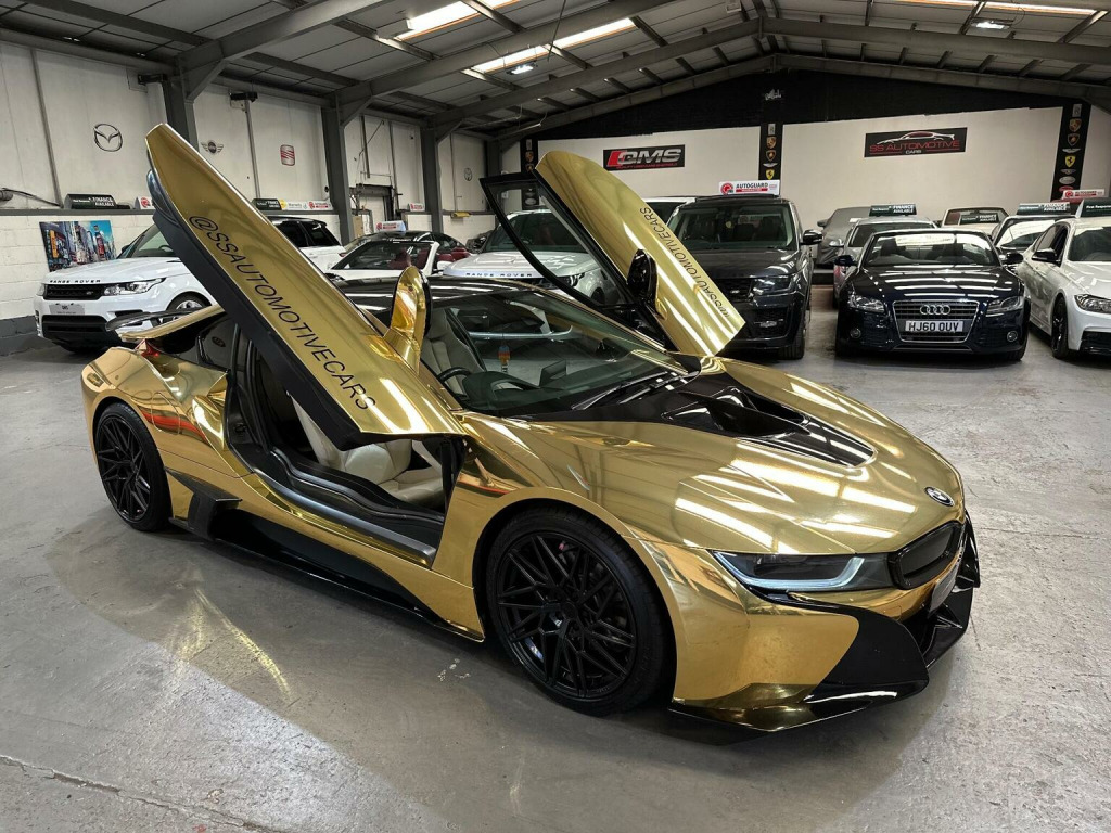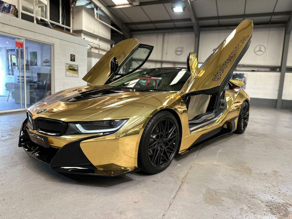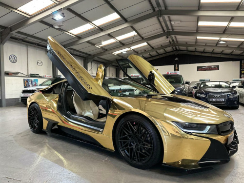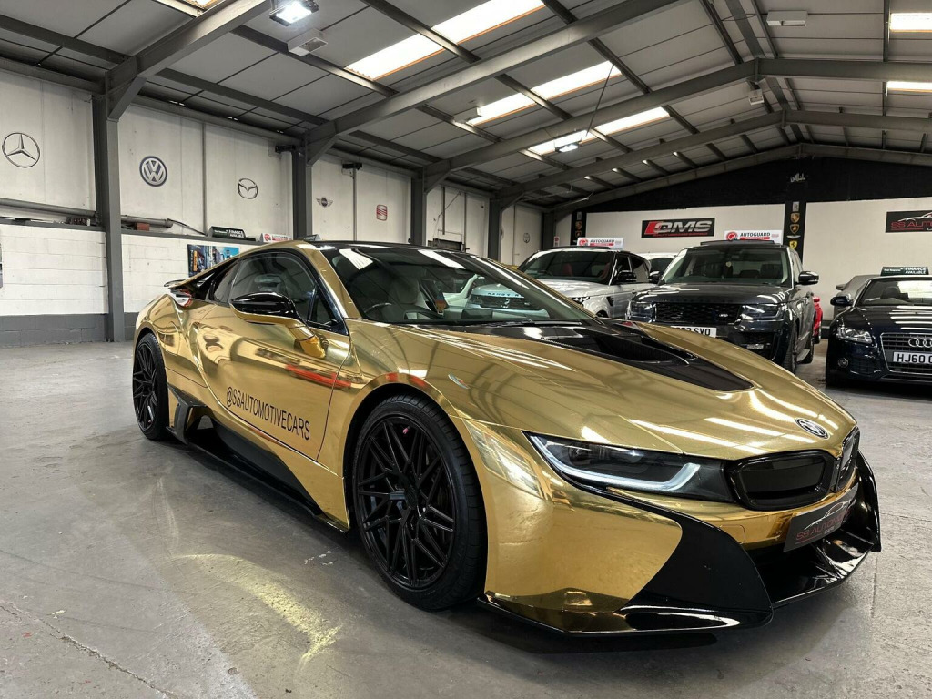 Here is our company owned BMW i8 2014, We have owned this vehicle from 2019 and used it for our own company advertising in summer so it has hardly been used less than 1000 miles a year, Currently on just under 50k miles, Full chrome gold wrap which was done in 2019. Does have some signs of wear now. , We may possibly re wrap some parts of front bumper to freshen up the car. Recently had full engine overhaul including , New timing chain, Waterpump, Cooler, Coolant pumps and more , Costing around £7000, It is always dry stored in our showroom on trickle charge, Custom Bodykit, Front splitter, Rear diffuser, Side skirts, Spoiler , 20 velare alloy wheels powder coated , Some body styling parts are dipped in carbon, Lovely vehicle. Real head turner, Not in rush to sell , Plate can be purchased separate if wanted , E 18 BYE, HPI clear, 2 keys