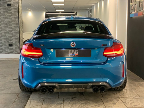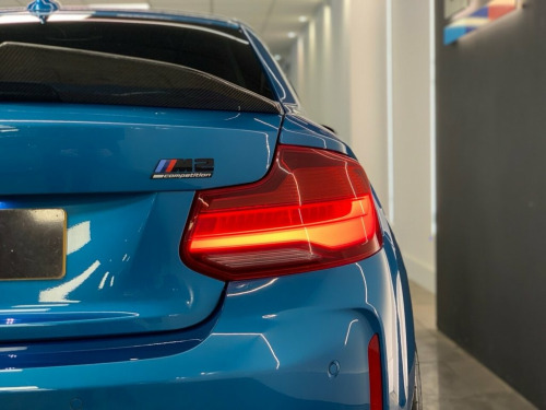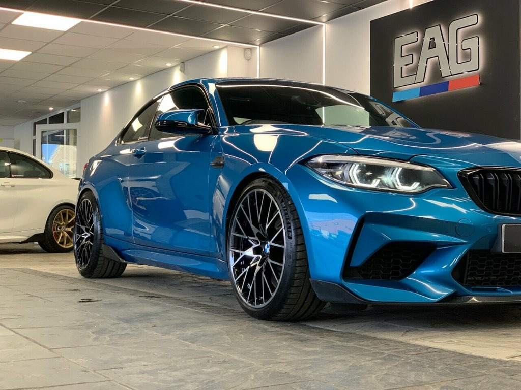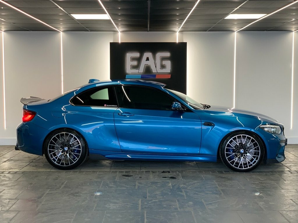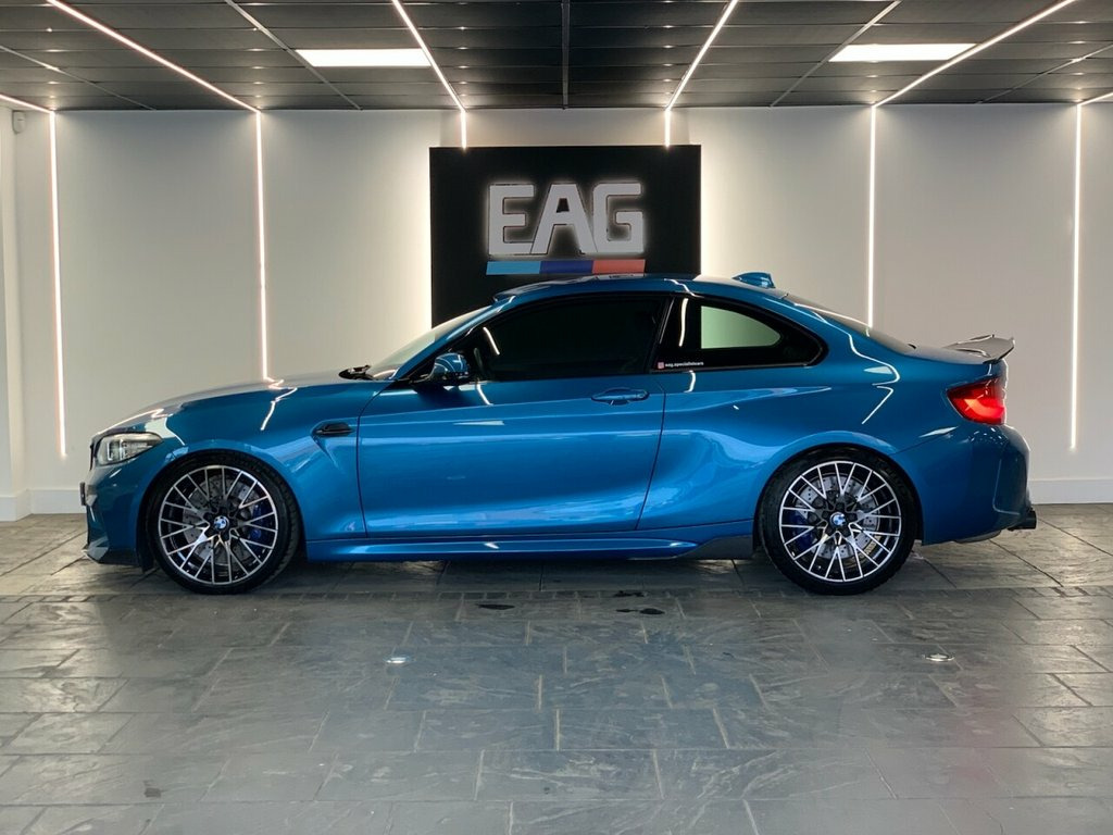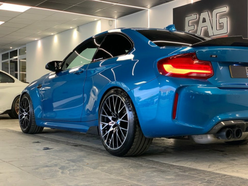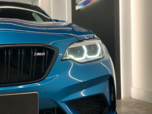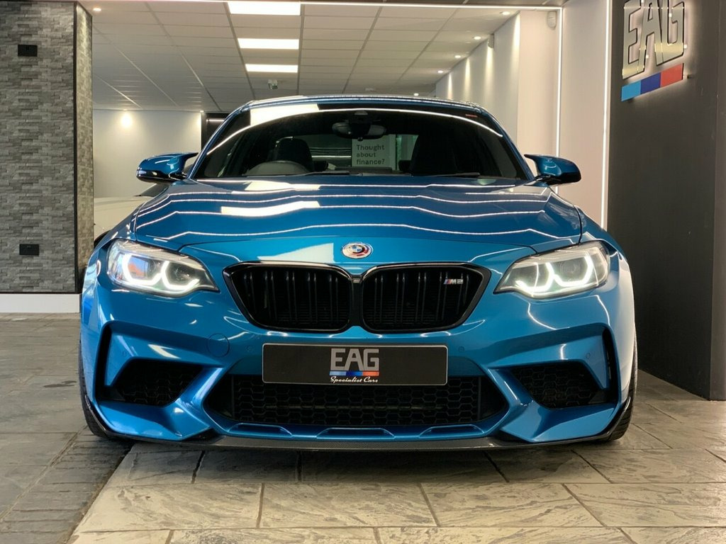 2019 (68) BMW M2 COMPETITION finished in Long Beach Blue metallic with Black Dakota leather and 788M alloy wheels. Styled externally with a full carbon exterior package which includes; front lower splitter, side skirt winglets, rear diffuser and boot spoiler. Finished with an Eibach Pro lowering kit and wheel spacers all round for an improved stance and handling. This example also comes with a stage 1 remap and a ghost immobiliser. Factory spec includes; sun protection glass, interior and exterior mirrors with auto dimming, fully electric and heated front seats with drivers memory, M seat belt stitching, carbon interior trim, adaptive LED headlights with high beam assist, front and rear park distance control, rain sensing wipers, cruise control with brake function, professional navigation, wireless telephone charging, Harman/Kardon sound system, DAB radio and Bluetooth connectivity. 4 owners. Full service history. PCP and HP finance available from 9.9% APR (subject to status) 12V Power Socket - Centre Console, 12V Power Socket - Passenger Footwell, 19in M Y-Spoke Alloy Wheels Style 788M w, Access to BMW Connected Plus (12 Month S, Active M Differential, Air Conditioning - Automatic - Dual Zone, Airbags, Airblades - Ferric Grey, Alarm System - Thatcham 1 with Remote Co, Ambient Lighting - Switchable, Armrest - Front with Sliding Adjustment, Automatically Dimming Rear View Mirror, BMW ConnectedDrive Online Services, BMW ConnectedDrive Services, BMW Emergency Call, BMW Mobility System, BMW Professional Radio with Single CD Pl, BMW TeleServices, Battery Age Recognition Function, Battery Safety Cut Off, Black Optic Display Instrument Cluster w, Bluetooth Hands-Free Fa
