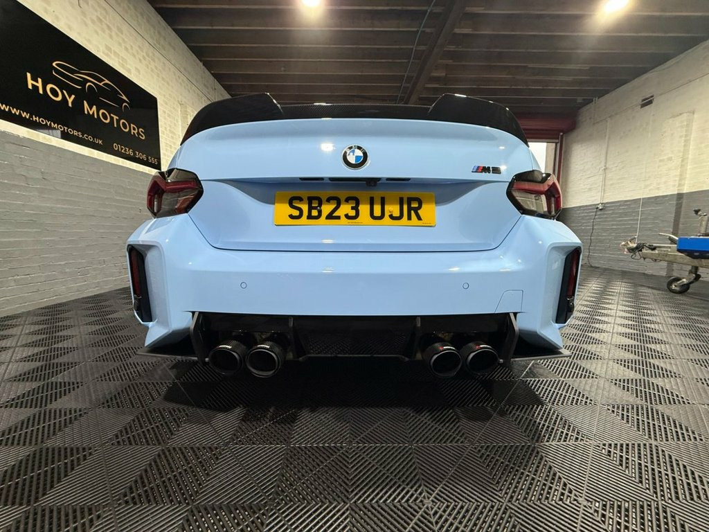 This 2023 BMW M2 BiTurbo offers an exceptional ownership proposition with its remarkably low mileage of just 7100 miles. Powered by a potent 3.0L Petrol Engine and adhering to Euro 6 emission standards, this performance coupé combines exhilarating driving dynamics with modern technology. Notable features include the comprehensive Driving Assistant package with Adaptive Cruise Control, the M2 Comfort Pack which adds Keyless Entry, a Heated Steering Wheel, and Wireless Phone Charging, alongside Adaptive LED Headlights for superior visibility. Inside, you'll find comfort enhanced by Heated Front Seats and Automatic Three-Zone Air Conditioning for personalised climate control. The M2 BiTurbo truly stands out with its impressive acceleration, achieving 0-60mph in a swift 4.1 seconds, demonstrating its sporting pedigree. This vehicle also benefits from a low insurance group, making it more accessible for many drivers, and its low CO2 emissions highlight its efficiency relative to its performance capabilities. These factors collectively indicate that this BMW M2 offers a superior blend of speed, comfort, and cost of ownership compared to many other vehicles in its class. This car also benefits from a 3 year service package from BMW that is completely free for the next owner. Milltek Remote Valve Quad Exhaust fitted by Ecotune Glasgow, Airtek intercooler protector, Maxton Ground Effect Bodykit, Michelin Pilot Sport 4S tyres 19in Front and 20in Rear Alloy Wheels - , 12V Power Socket - Centre Console, 19in Front and 20in Rear Alloy Wheels - , ABS - Anti Lock Braking System, Adaptive LED Headlights, Air Conditioning - Automatic with Three-, Airbags, Alarm System, Ambient Lighting, Automatically Dimming Rear View Mirror, BMW Connected Package Professional, BMW ConnectedDrive Online Services, BMW Individual Lights Shadow Line, BMW Legal Emergency Call, BMW Live Cockpit Professional, BMW Mobility System, BMW TeleServices, Bumper System - Front and Rear, Carbon Roof, Child Seat ISOFIX Attachment for the Two, Crash Sensor, Cruise Control with Brake Function, Cupholders - Two Front Centre Console, DAB Tuner, DSC - Dynam