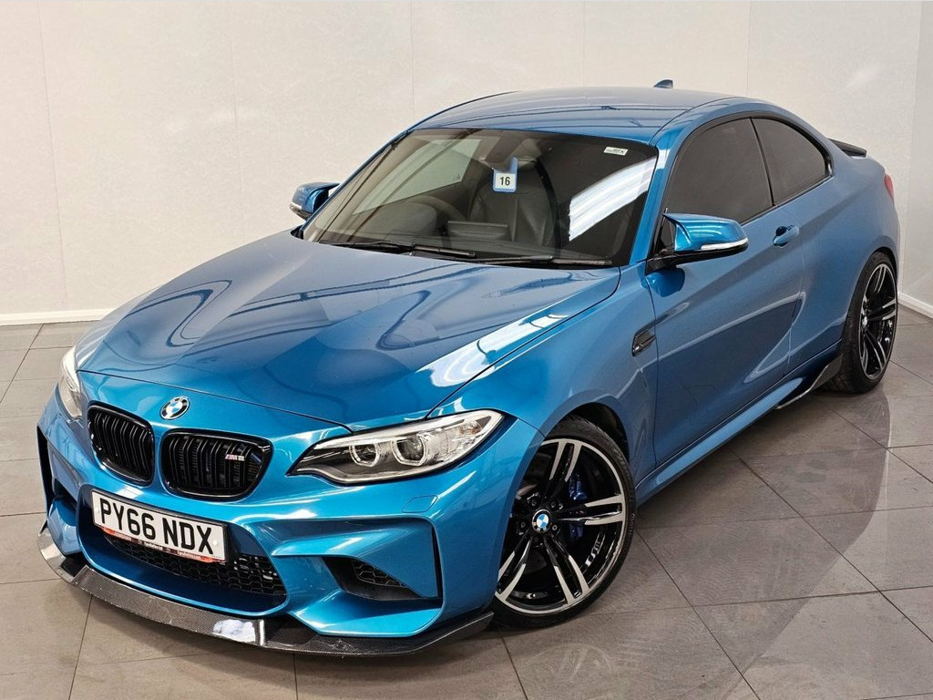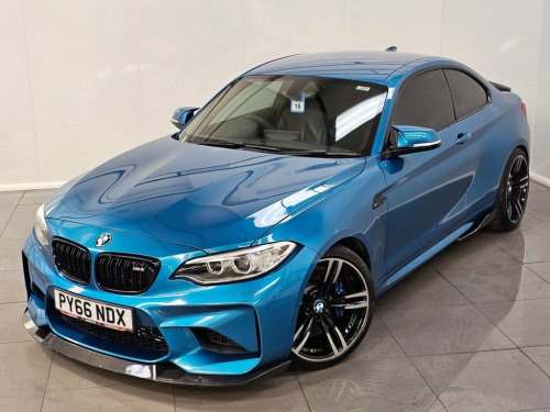 We are delighted to present this 2016 66 BMW M2 3.0i Coupe, Excellent condition throughout finished in Long Beach Blue complimented by 19 Alloy Wheels wrapped in XL Continental Sport Contact 7 tyres. Covering just 49k miles backed with Full Service History and 2 keys. This M2 comes with the following specifications: Stage 2 Remap (450bhp) - Airtec Upgraded Intercooler - B58TU Fuel Pump - MST Air Intake - MST Charge Pipes - VRSF Downpipe - Carbon Fibre Low Line Bodykit - Custom Steering wheel with LED Rev Counter Rear Sensors, Reverse Camera, Harmon/Kardon Sound System, Pronav, Leather Seats, Heated Electric Memory Seats, Motorised Folding Wingmirrors, Cruise Control, Speed Limiter, Paddles, Satnav, Bluetooth, Automatic Lights & Wipers, Stop/Start, Drive Select, Keyless, Dual Climate and A/C