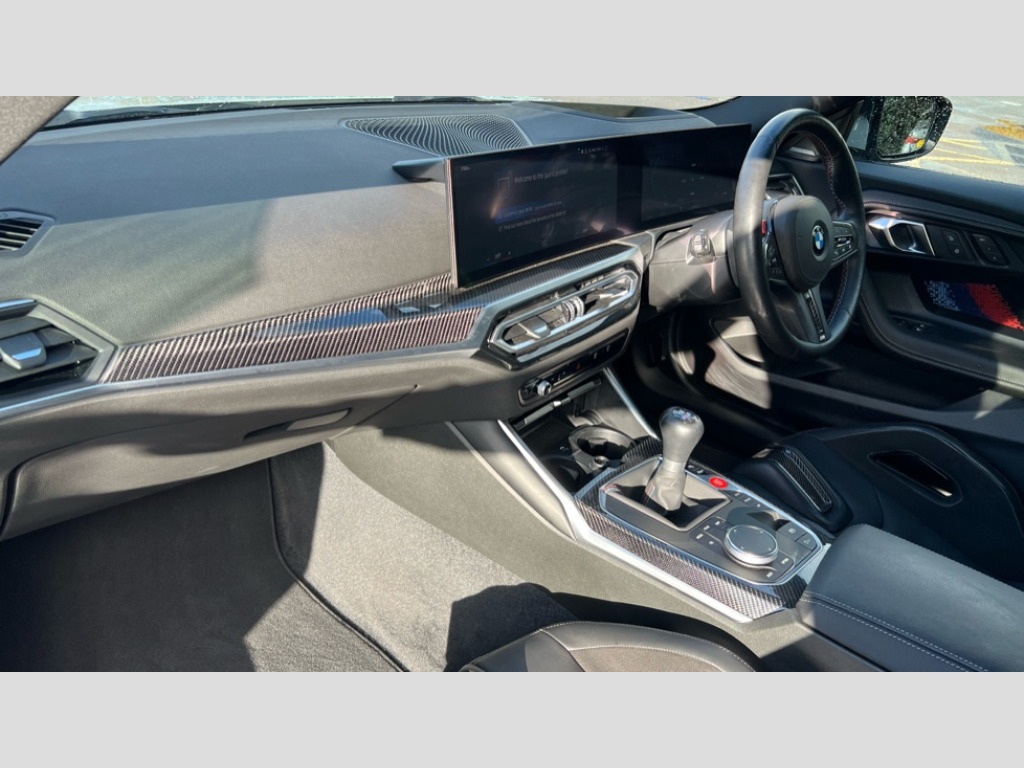 BMW M2 M2 2dr BMW ConnectedDrive online services, BMW legal emergency call, BMW Teleservices, Check control system, Configurable dashboard display, Cruise control with braking function, Digital owner's manual, Drive off assistant, Driver attention warning, Engine start button, Exterior temperature display, Live Cockpit Pro with head up display including 12.3" instrument cluster and 14.9" central display, M drive: DSC mode, engine characteristics, M Servotronic, M Drivelogic, adaptive M suspension, brake characteristics, M Sound Control, Oil sensor for level and grade, On board diagnostics, Parking assistant with reversing assistant, active PDC, lateral parking aid and rear view camera, PAS, Service interval indicator, Speed limiter, Start/stop system, Travel data recorder, Trip computer, Voice control for audio, climate, telephone, navigation, Widescreen display, M Adaptive suspension, M Drive Professional including track mode, laptimer, traction control & Drift analyser, M Sport differential, DAB tuner, Harman/Kardon surround sound system, USB port, Adaptive LED Headlights, Automatic headlamp activation, Automatic headlamp levelling, BMW Individual shadowline lights, Door mirror integrated indicators, Dynamic brake lights, Electric adjustable heated door mirrors, Extended High-gloss shadowline exterior trim: high-gloss black mirror caps and rear spoiler, tailpipe finishers in black chrome, Fading support, Follow me home headlights, Front and rear bumper system, Front electric windows, Headlight beam throw control, Heat protection, sun protection glazing, High beam assistant, Illuminated M highlighters, Interior rear view electrochromatic mirror with automatic anti dazzle function, LED 3rd brake light, LED daytime running lights, LED indicator lights, LED number plate light, LED rear lights, M carbon fibre roof, M high gloss shadowline exterior trim in mirror triangle cover, mirror cover panel, mirror bezel and window border, Mirror glass aspheric on driver's side, convex on passenger side, Rain sensor, Rear boot, Sun protection glass: darkened glass for rear screen and rear side windows, Variable front intermittent wipers, Welcome lighting, 12V power socket in front centre console with blanking plug, 2 cupholders, 2 rear head restraints, 2 rear seats, 3 spoke leather M multi-function steering wheel, Ambient lighting, Black velour front and rear floor mats, Carbon fibre interior trim including carbon applications on the steering wheel, Compartment in front of cupholder, Driver/passenger electric lumbar adjustment, Electrically adjustable front seats - driver seat with memory, Folding rear seat head rests, Front and rear door exit lights, Front and rear footwell lights, Front centre armrest, Front door pockets with bottle holders, Front door sill strips with aluminium inlays and M2 labelling, Front interior light, Front M Sport seats, Front reading lights, Glove compartment, Glovebox light, Heated front seats, Height adjustable front headrests, Illuminated armrest storage compartment, Illuminated M accents in front door, Isofix child seat for two outer rear seats, Luggage compartment lighting, M Anthracite headlining, Manually adjustable steering column, Rear armrest, Single front passenger seat, Steering column rake adjustment, Storage compartment in rear doors, Storage tray and compartment with cover in centre console, Through loading system with 40/20/40 split folding rear seat, Two zone automatic air conditioning, Vanity mirror lights, Connected package professional - M2, Extended storage pack - M2, Interior and exterior mirror pack - M2, 4 x 3 point seatbelts, ABS/EBD, Automatic Stability Control (ASC), Cornering brake control (CBC), Crash sensor, Curtain airbags, Driver/Front Passenger airbags, Dry braking, DSC - Dynamic Stability Control, Dynamic brake control, Electromechanical parking brake, Emergency door unlock, Front passenger airbag deactivation, Height adjustable front seatbelts, M seat belts, Seatbelt load limiter, Seatbelt pretensioners with load limiters, Seatbelt reminder, Tyre pressure sensor, Alarm system, Central locking, Drive away door locking, Immobiliser, Remote central locking, Tyre repair kit