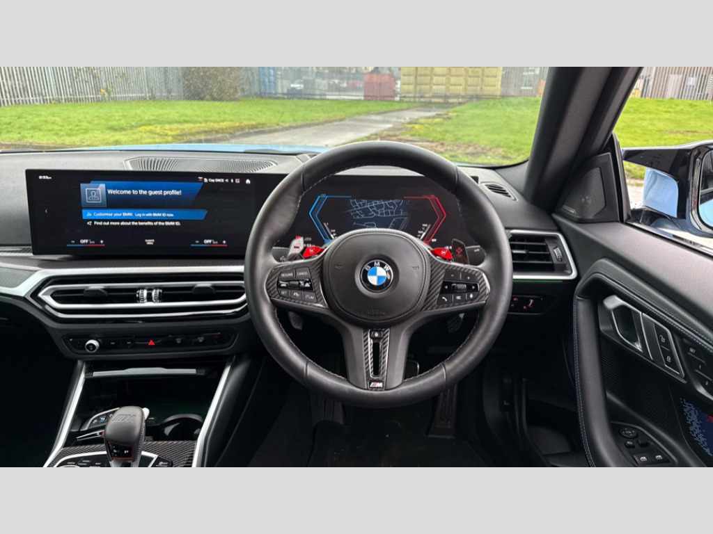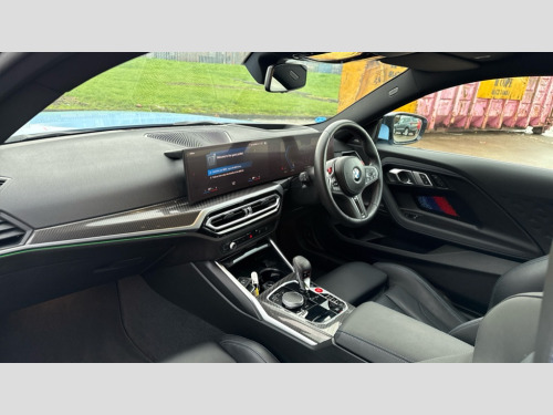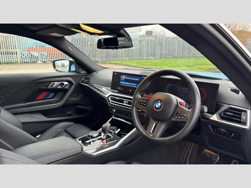 BMW M2 M2 2dr DCT BMW ConnectedDrive online services, BMW legal emergency call, BMW Teleservices, Check control system, Configurable dashboard display, Digital owner's manual, Drive off assistant, Driver attention warning, Engine start button, Exterior temperature display, Live Cockpit Pro with head up display including 12.3" instrument cluster and 14.9" central display, M drive: DSC mode, engine characteristics, M Servotronic, M Drivelogic, adaptive M suspension, brake characteristics, M Sound Control, Oil sensor for level and grade, On board diagnostics, Parking assistant with reversing assistant, active PDC, lateral parking aid and rear view camera, PAS, Service interval indicator, Shifting point display, Speed limiter, Start/stop system, Travel data recorder, Trip computer, Voice control for audio, climate, telephone, navigation, Widescreen display, M Adaptive suspension, M Drive Professional including track mode, laptimer, traction control & Drift analyser, M Sport differential, M steptronic sport transmission with drivelogic, DAB tuner, Harman/Kardon surround sound system, USB port, Adaptive LED Headlights, Automatic headlamp activation, Automatic headlamp levelling, BMW Individual shadowline lights, Door mirror integrated indicators, Dynamic brake lights, Electric adjustable heated door mirrors, Extended High-gloss shadowline exterior trim: high-gloss black mirror caps and rear spoiler, tailpipe finishers in black chrome, Fading support, Follow me home headlights, Front and rear bumper system, Front electric windows, Headlight beam throw control, Heat protection, sun protection glazing, High beam assistant, Illuminated M highlighters, Interior rear view electrochromatic mirror with automatic anti dazzle function, LED 3rd brake light, LED daytime running lights, LED indicator lights, LED number plate light, LED rear lights, M carbon fibre roof, M high gloss shadowline exterior trim in mirror triangle cover, mirror cover panel, mirror bezel and window border, Mirror glass aspheric on driver's side, convex on passenger side, Rain sensor, Rear boot, Sun protection glass: darkened glass for rear screen and rear side windows, Variable front intermittent wipers, Welcome lighting, 12V power socket in front centre console with blanking plug, 2 cupholders, 2 rear head restraints, 2 rear seats, 3 spoke leather M multi-function steering wheel, Ambient lighting, Black velour front and rear floor mats, Carbon fibre interior trim including carbon applications on the steering wheel and carbon shift paddles, Compartment in front of cupholder, Driver/passenger electric lumbar adjustment, Electrically adjustable front seats - driver seat with memory, Folding rear seat head rests, Front and rear door exit lights, Front and rear footwell lights, Front centre armrest, Front door pockets with bottle holders, Front door sill strips with aluminium inlays and M2 labelling, Front interior light, Front M Sport seats, Front reading lights, Glove compartment, Glovebox light, Heated front seats, Height adjustable front headrests, Illuminated armrest storage compartment, Illuminated M accents in front door, Isofix child seat for two outer rear seats, Luggage compartment lighting, M Anthracite headlining, Manually adjustable steering column, Rear armrest, Single front passenger seat, Steering column rake adjustment, Storage compartment in rear doors, Storage tray and compartment with cover in centre console, Through loading system with 40/20/40 split folding rear seat, Two zone automatic air conditioning, Vanity mirror lights, Connected package professional - M2, Extended storage pack - M2, Interior and exterior mirror pack - M2, 4 x 3 point seatbelts, ABS/EBD, Automatic Stability Control (ASC), Cornering brake control (CBC), Crash sensor, Curtain airbags, Driver/Front Passenger airbags, Dry braking, DSC - Dynamic Stability Control, Dynamic brake control, Electromechanical parking brake, Emergency door unlock, Front passenger airbag deactivation, Height adjustable front seatbelts, M seat belts, Seatbelt load limiter, Seatbelt pretensioners with load limiters, Seatbelt reminder, Tyre pressure sensor, Alarm system, Central locking, Drive away door locking, Immobiliser, Remote central locking, Tyre repair kit