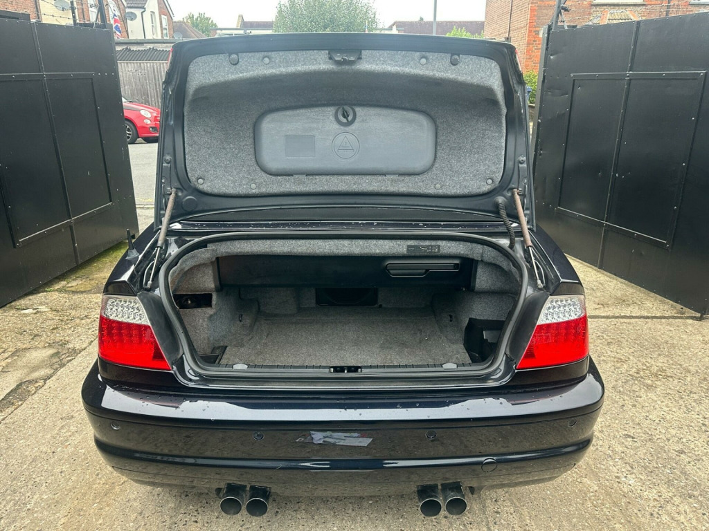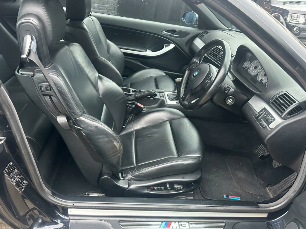 24 MONTHS WARRANTY - 12 MONTHS AA BREAKDOWN COVER - ULEZ COMPLIANT E46 BMW M3 CONVERTIBLE 3.2 6 SPEED MANUAL 343 BHP - CARBON BLACK WITH FULL BLACK NAPPA LEATHER SPORTS SEATS - ELECTRIC HEATED FRONT SPORTS SEATS WITH MEMORY - HARMAN KARDON SOUND SYSTEM - 19'' ALLOY WHEELS - M SPORTS LEATHER MULTI FUNCTION STEERING WHEEL - LEATHER GEAR KNOB - XENON HEADLIGHTS - HEADLIGHT WASHER SYSTEM - POWER FOLDING DOOR MIRRORS - AUTO LIGHTS - RAIN SENSITIVE WIPERS - PARKING SENSORS - ALUMINIUM SHADOW TRIM - FRONT FOG LIGHTS - SPARE KEYS - SERVICE RECORDS - LAST SERVICE 12/11/2025 89,152 MILES - LOTS OF MONEY SPENT RECENTLY - ALLOYS REPLACED - NEW PIRELLI TYRES - NEW ROOF MODULE - VARIOUS BODYWORK INVOICES FOR AGE RELATED REPAIRS - REAR SUBFRAME CHECKED NO CRACKS PRESENT - HPI CLEAR WITH REPORT - EXCEPTIONAL CONDITION FOR AGE - LOW MILEAGE FOR AGE - ANY INSPECTION WELCOME - FIRST TO SEE WILL BUY - PART EXCHANGE CONSIDERED -,