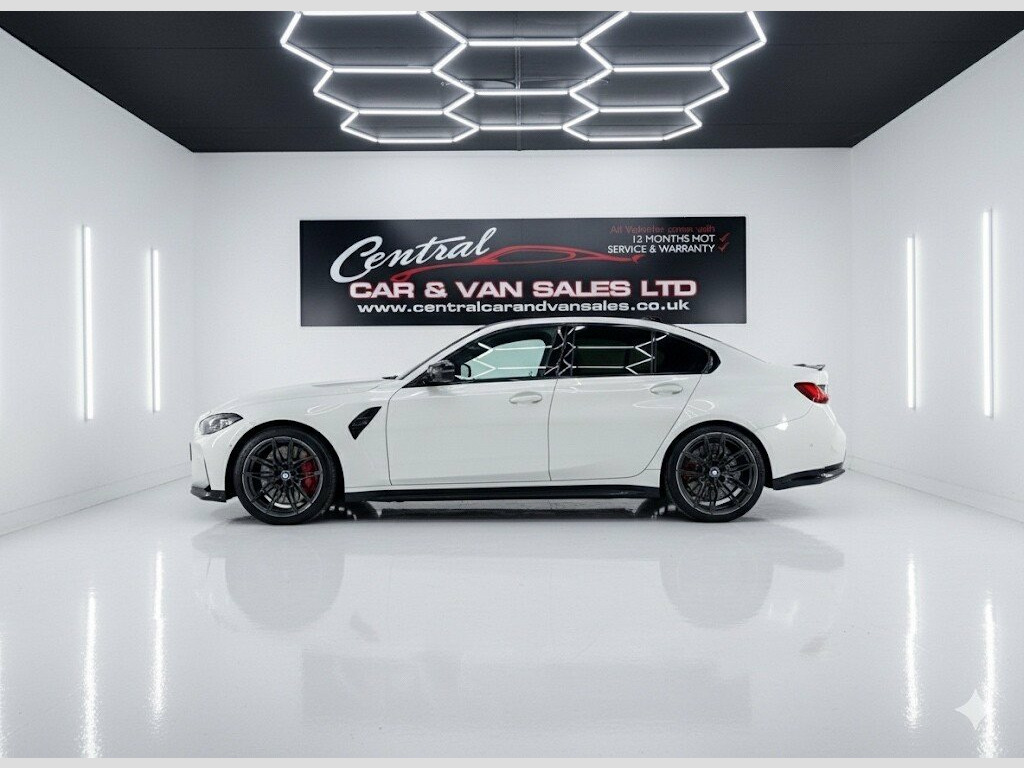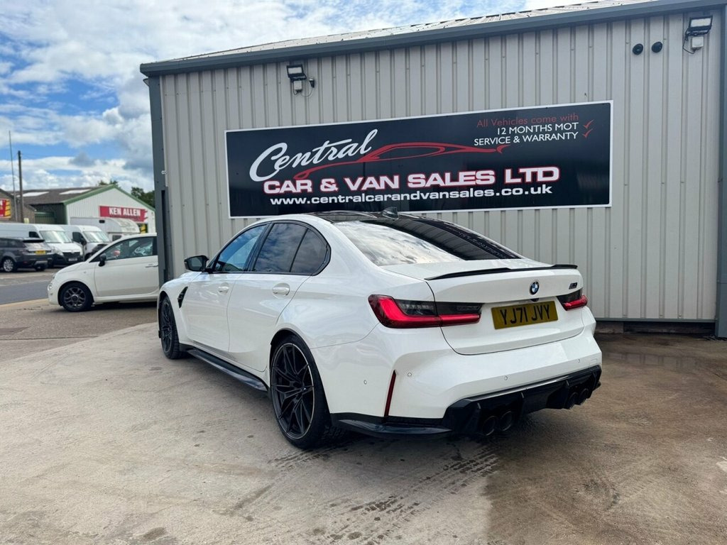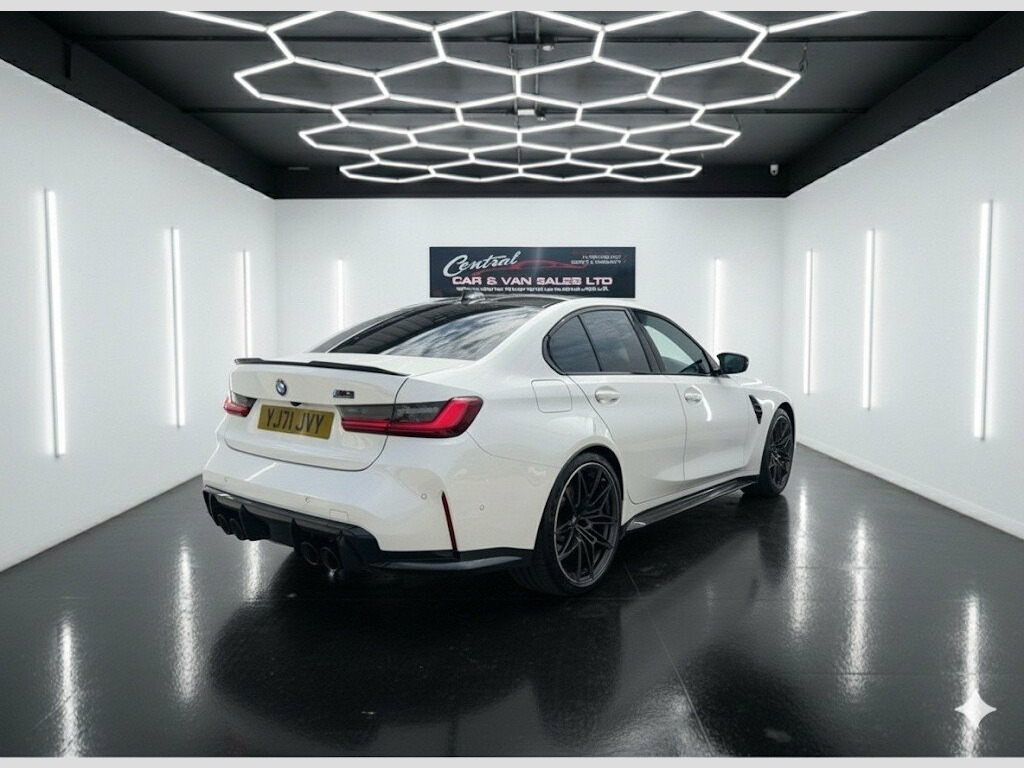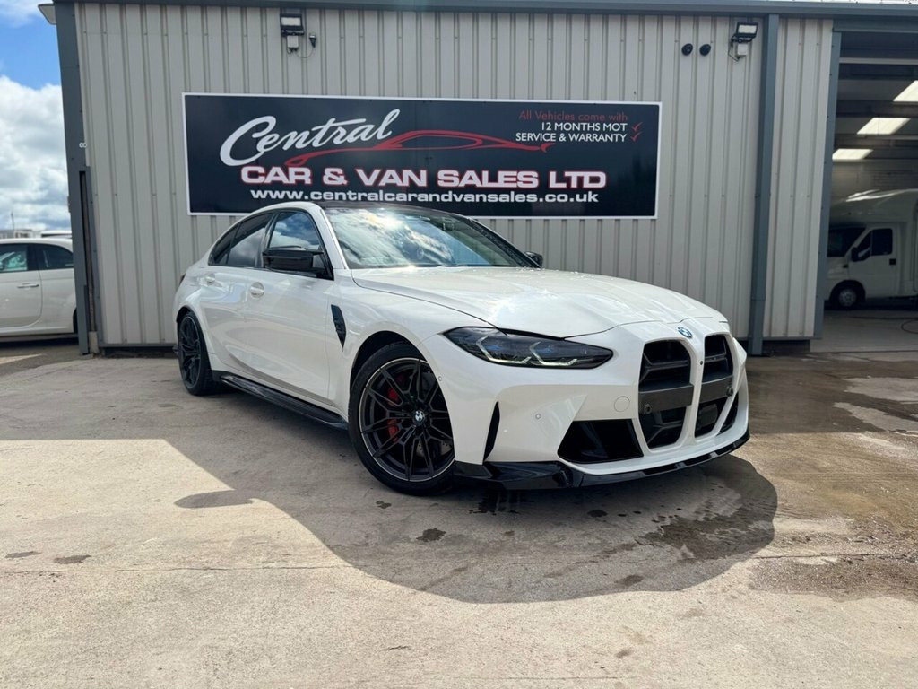 2021 BMW M3 3.0 Bi-Turbo Competition in Alpine White with M Carbon black leather bucket seats, The car has a carbon front grill and gloss black side skirts, rear spoiler & rear diffuser. The car has done 58,000 miles from new and is showing 0 previous owners, The car has Full BMW Digital Service History. Stored on the dashboard, The car is in fantastic condition throughout and has a high specification with factory extras. The M3 Competition features a 3.0-liter inline-6 twin-turbocharged engine producing 503 horsepower and 479 lb-ft of torque. It's paired with an 8-speed automatic transmission and comes standard with M xDrive all-wheel drive. which can be switched to RWD. Acceleration from 0 to 62 mph is achieved in 3.5 seconds, and the top speed is limited to 155 mph. This particular example comes with Electric Adjustable Memory M-Sport bucket seats in full leather with illuminated M logos, BMW Laser Technology Headlights, BMW Hands Free Driving, M1 M2 modes, MDM Mode, Driver Modes, 360 Cameras, Parking Camera, Parking Sensors, Lane Assist, BMW Apps, Illuminated storage area, Heated & Cooled Seats, BMW Collision Assist, Advanced BMW I-Drive, Keyless Entry & Start, Electronic Parking Brake With Auto Hold, Auto Lights, Ambient Lighting, Rear USBC X2, Digital Climate Control, Power Fold Mirrors. HPI Clear, Full V5 Log Book, Car Vertical Checked!