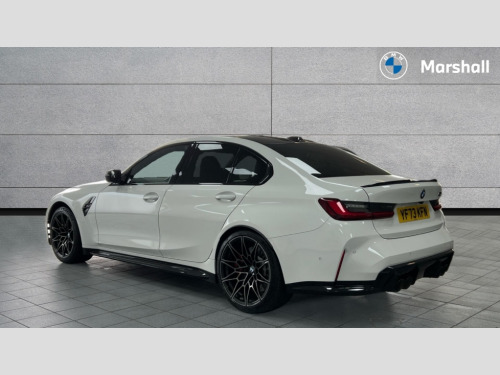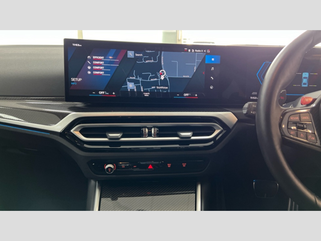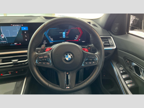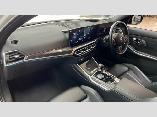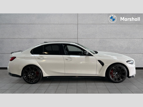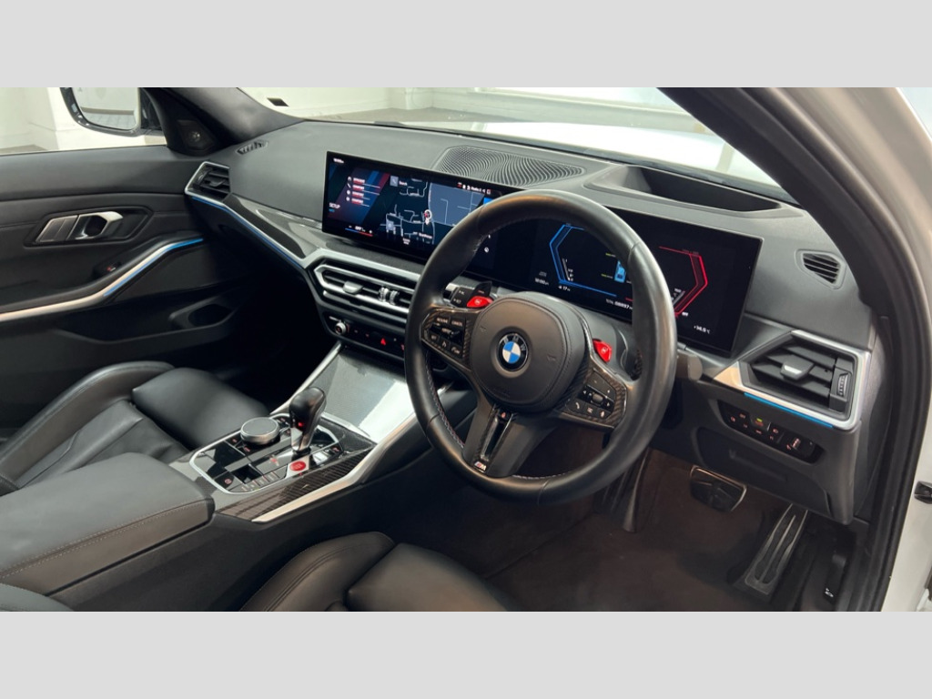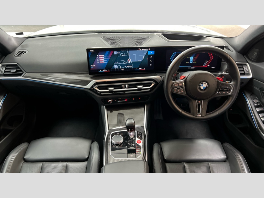 BMW M3 M3 Competition 4dr Step Auto Active guard plus, Automatic start/stop system, Bluetooth functionality with Apple CarPlay/Android Auto, BMW ConnectedDrive online services, BMW iDrive controller on centre console, BMW legal emergency call, BMW Live Cockpit Professional sat nav system with 12.3" instrument display and high resolution control display, BMW Online services, BMW Teleservices, Brake pad wear indicator warning light, Condition based service, Door/boot open warning light, Driving experience switch, Head up Display, Illuminated control elements, Instrument cluster with extended contents, Lights on warning, M drive buttons, Oil sensor for level and grade, warning by check control system, Oil temperature gauge, On board computer, On board diagnostics, Optimum shift indicator, Outside temperature display, Park distance control, Pull away assistant, Run flat indicator, Service interval indicator, Shifting point display, Speed limiter, Variable sport steering, Widescreen display, Adaptive M Sport suspension, Double joint spring strut front axle, M Drive Professional including track mode, laptimer, traction control & Drift analyser, M Sport differential, M steptronic sport transmission with drivelogic, Safety battery terminal clamp, 8 programmable favourite buttons, Auxiliary point for auxiliary devices, BMW professional radio/CD/MP3, DAB Digital radio, Harman/Kardon loudspeaker system, 3rd brake light, Acoustic glazing, Auto dimming driver's door mirror, Auto dimming rear view mirror, Automatic headlights + automatic windscreen wipers, Automatic parking function on front passenger's exterior mirror, Black chrome exhaust tailpipes, Black model designation badges, BMW emblem on engine compartment lid and tailgate, BMW high gloss shadow line with extended contents, BMW Individual shadowline lights, Body colour bumpers, Carbon fibre reinforced plastic (CFRP) roof with high gloss black roof aerial bulge and roof mouldings, Day time running light, Door mirror integrated indicators, Door sill finishers with aluminium inserts, Dynamic brake lights, Electric adjustable heated door mirrors, Electric folding door mirrors, Electric front and rear windows with one touch/convenient open/close function, Follow me home headlights, Front and rear apron plastic in body colour, Front and rear bumper system, Headlight beam throw control, Heat protection, sun protection glazing, Heated rear window with automatic switch off, Heated washer jets, High beam assistant, High gloss black frameless kidney grille with M badge, High gloss black lower bumper edges, side sills and diffuser edge binding, Illuminated bow type door handles in body colour drivers side with door lock, LED number plate light, LED tail lights with 3D L-shaped LED light design, M designation, M Sport entry door sill strips, Mirror glass aspheric on driver's side, convex on passenger side, Rear boot, Rear fog lights, Rear reflectors, Rear right M3 competition inscription, Rear side wing doors, Reversing light, Shark fin roof aerial, Strakes in front side panel, black matt/black high-gloss, with model badge, Visible VIN plate, Welcome lighting, 2 front cupholder in centre console with clamping elements and matt black inlay, 2 x 12 V Power sockets (luggage compartment and front centre console), 2 x USB Type C ports for charging and data transmission in front centre console, 3 folding rear headrests, 3 seat bench in 2nd row, Ambient inside door handle light, Ambient lighting for instrument panel, Ambient lighting for storage compartment, Ambient lighting front and rear, Ambient lighting in door panels, Anthracite headlining, Battery in luggage compartment, Carbon fibre centre console incl. cover for cupholders and storage compartment, Carbon fibre decorative steering wheel finishers, Carbon fibre shift paddles, Carbon fibre strip in instrument panel on front passenger side, Centre console armrest with storage compartment, Compartment in front of cupholder, Driver/passenger sunvisors with illuminated vanity mirrors + covers, Dynamic ambient interior lighting, Electric front seats + driver memory, English handbook, Floor mats in velour, Folding rear centre armrest with 2 cupholders, Footwell lighting, Front and rear door exit lights, Front door storage bins with bottle holder, Front interior light, Front isofix attachment + airbag deactivation, Front seat backrest width adjustment, Front seats lumbar support, Front/rear door armrests, Gearshift lever with embossed M badge, Heated front seats, Height adjustable front headrests, Interior mirror lighting, Isofix on 2nd row outer seats, Lockable/illuminated glovebox, Luggage compartment lighting, Manual 40:20:40 split folding rear seat with two tilt positions for backrest, Multifunction steering wheel, Rake/reach adjustable steering wheel, Single front passenger seat, Storage compartment in rear doors, Three zone automatic air conditioning, Through loading system, Toolkit located in luggage compartment, Wireless charging tray, Additional storage compartment pack - M3, Connected package professional - M3, High gloss shadowline exterior trim pack - M3, 3 point seatbelts on all seats, ABS/EBD, Automatic Stability Control (ASC), Brake energy regeneration, Brake fade compensation, Compound structure brake discs, Cornering brake control (CBC), Crash sensor, Driver/Front Passenger airbags, Dry braking, Dynamic brake control, Dynamic Stability Control with M Dynamic mode, Dynamic Traction Control - DTC, Electromechanical parking brake, Electronic differential lock control (EDLC), Front and rear head airbags, Front seat side impact airbags, Front seatbelt pretensioners + load limiters, Hill start assist, M Sport seat belts, Rear child proof door locks, Seat occupancy detection for driver and passenger side, Seatbelt warning, Side impact protection, Two tone horn, Tyre pressure sensor, Warning triangle and first aid kit, Centre lock switch, Closing system with central locking, Digital key, Electronic immobi