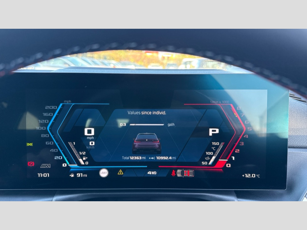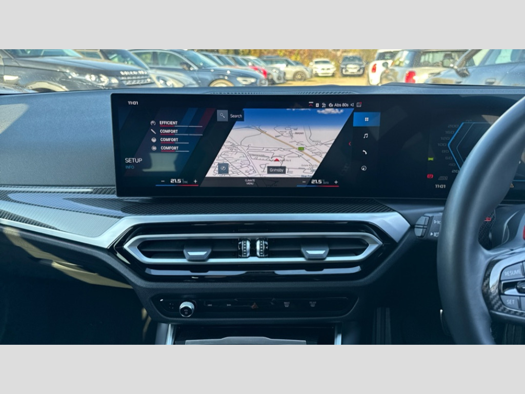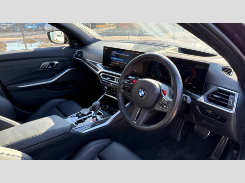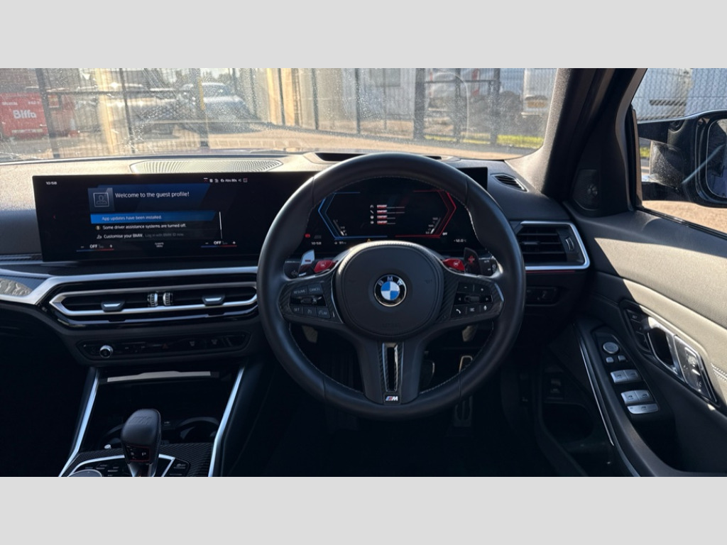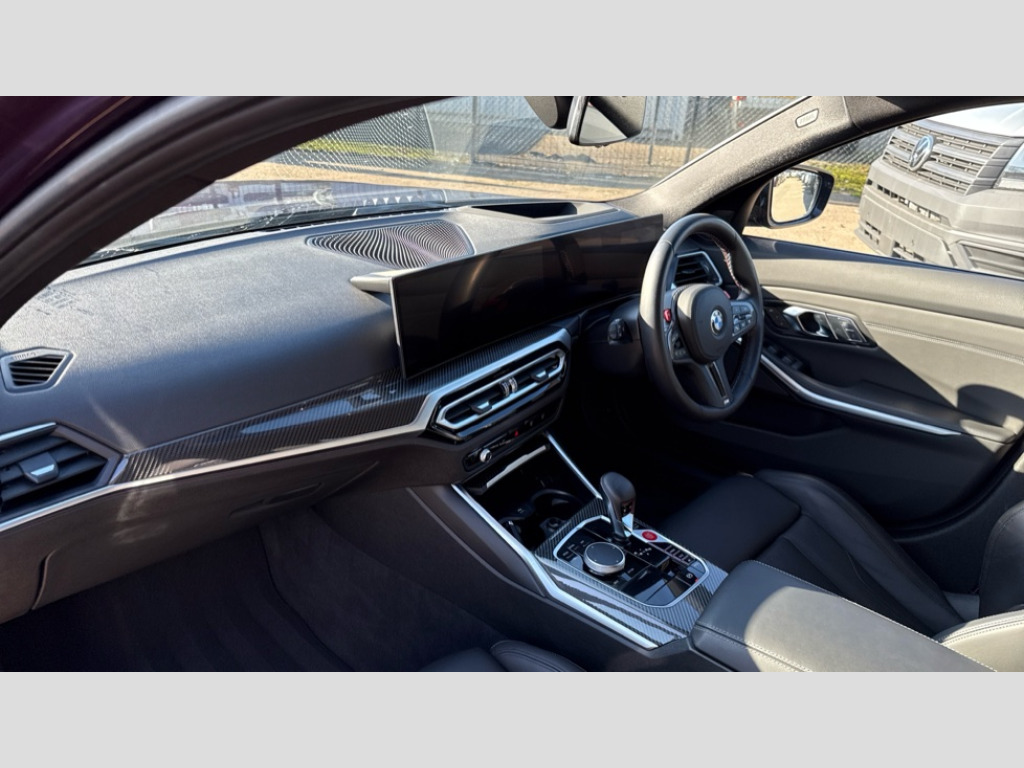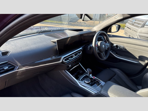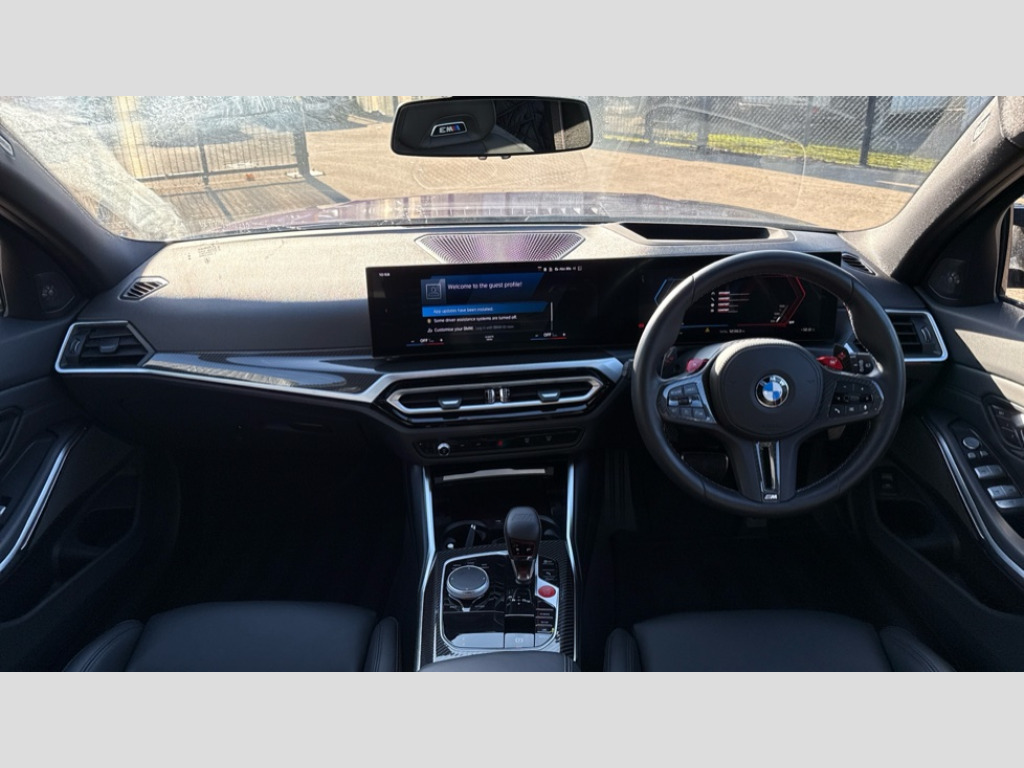 BMW M3 M3 xDrive Competition M 5dr Step Auto Active guard plus, Automatic start/stop system, Bluetooth functionality with Apple CarPlay/Android Auto, BMW ConnectedDrive online services, BMW iDrive controller on centre console, BMW legal emergency call, BMW Live Cockpit Professional sat nav system with 12.3" instrument display and high resolution control display, BMW Online services, BMW Teleservices, Brake pad wear indicator warning light, Condition based service, Door/boot open warning light, Driving experience switch, Electric boot lid, Head up Display, Illuminated control elements, Instrument cluster with extended contents, Lights on warning, M drive buttons, Oil sensor for level and grade, warning by check control system, Oil temperature gauge, On board computer, On board diagnostics, Optimum shift indicator, Outside temperature display, Pull away assistant, Run flat indicator, Service interval indicator, Shifting point display, Speed limiter, Variable sport steering, Adaptive M Sport suspension, Double joint spring strut front axle, M Drive Professional including track mode, laptimer, traction control & Drift analyser, M Sport differential, M steptronic sport transmission with drivelogic, Safety battery terminal clamp, 8 programmable favourite buttons, Auxiliary point for auxiliary devices, DAB Digital radio, Harman/Kardon loudspeaker system, Personal eSim, 3rd brake light, Acoustic glazing, Auto dimming driver's door mirror, Auto dimming rear view mirror, Automatic headlights + automatic windscreen wipers, Automatic parking function on front passenger's exterior mirror, Black model designation badges, BMW emblem on engine compartment lid and tailgate, BMW high gloss shadow line with extended contents, BMW Individual shadowline lights, Body colour bumpers, Carbon fibre reinforced plastic (CFRP) roof with high gloss black roof aerial bulge and roof mouldings, Day time running light, Door mirror integrated indicators, Door sill finishers with aluminium inserts, Dynamic brake lights, Electric adjustable heated door mirrors, Electric folding door mirrors, Electric front and rear windows with one touch/convenient open/close function, Follow me home headlights, Front and rear apron plastic in body colour, Front and rear bumper system, Headlight beam throw control, Heat protection, sun protection glazing, Heated rear window with automatic switch off, Heated washer jets, High beam assistant, High gloss black frameless kidney grille with M badge, High gloss black lower bumper edges, side sills and diffuser edge binding, High gloss black M roof rails, Illuminated bow type door handles in body colour drivers side with door lock, LED number plate light, LED tail lights with 3D L-shaped LED light design, M designation, M Sport entry door sill strips, Mirror glass aspheric on driver's side, convex on passenger side, Rear fog lights, Rear reflectors, Rear right M3 competition inscription, Rear side wing doors, Rear wiper, Reversing light, Shark fin roof aerial, Strakes in front side panel, black matt/black high-gloss, with model badge, Visible VIN plate, Welcome lighting, 2 front cupholder in centre console with clamping elements and matt black inlay, 2 x 12 V Power sockets (luggage compartment and front centre console), 2 x USB Type C ports for charging and data transmission in front centre console, 3 folding rear headrests, 3 seat bench in 2nd row, Ambient inside door handle light, Ambient lighting for instrument panel, Ambient lighting for storage compartment, Ambient lighting front and rear, Ambient lighting in door panels, Anthracite headlining, Battery in luggage compartment, Carbon fibre centre console incl. cover for cupholders and storage compartment, Carbon fibre decorative steering wheel finishers, Carbon fibre shift paddles, Carbon fibre strip in instrument panel on front passenger side, Centre console armrest with storage compartment, Compartment in front of cupholder, Driver/passenger sunvisors with illuminated vanity mirrors + covers, Dynamic ambient interior lighting, Electric front seats + driver memory, English handbook, Floor mats in velour, Folding rear centre armrest with 2 cupholders, Front door storage bins with bottle holder, Front isofix attachment + airbag deactivation, Front seat backrest width adjustment, Front seats lumbar support, Front/rear door armrests, Gearshift lever with embossed M badge, Heated front seats, Height adjustable front headrests, Isofix on 2nd row outer seats, Lockable/illuminated glovebox, Luggage compartment lighting, Manual 40:20:40 split folding rear seat with two tilt positions for backrest, Multifunction steering wheel, Rake/reach adjustable steering wheel, Single front passenger seat, Storage compartment in rear doors, Three zone automatic air conditioning, Through loading system, Toolkit located in luggage compartment, Wireless charging tray, Additional storage compartment pack - M3, Connected package professional - M3, High gloss shadowline exterior trim pack - M3, 3 point seatbelts on all seats, Anti-lock braking system (ABS), Automatic Stability Control (ASC), Brake energy regeneration, Brake fade compensation, Compound structure brake discs, Cornering brake control (CBC), Crash sensor, Driver/Front Passenger airbags, Dry braking, Dynamic brake control, Dynamic stability control + (DSC+), Dynamic Traction Control - DTC, Electromechanical parking brake, Electronic differential lock control (EDLC), Front and rear head airbags, Front seat side impact airbags, Front seatbelt pretensioners + load limiters, Hill start assist, M Sport seat belts, Rear child proof door locks, Seat occupancy detection for driver and passenger side, Seatbelt warning, Side impact protection, Two tone horn, Tyre pressure sensor, Warning triangle and first aid kit, Centre lock switch, Closing system with central locking, Digital key, Electronic immobiliser, Thatcham cat 1 remote alarm, Vehicle Key with 4 buttons including the integrated key, Galvanic finish to control