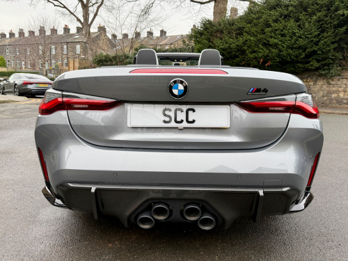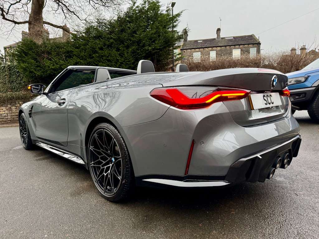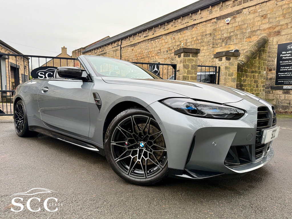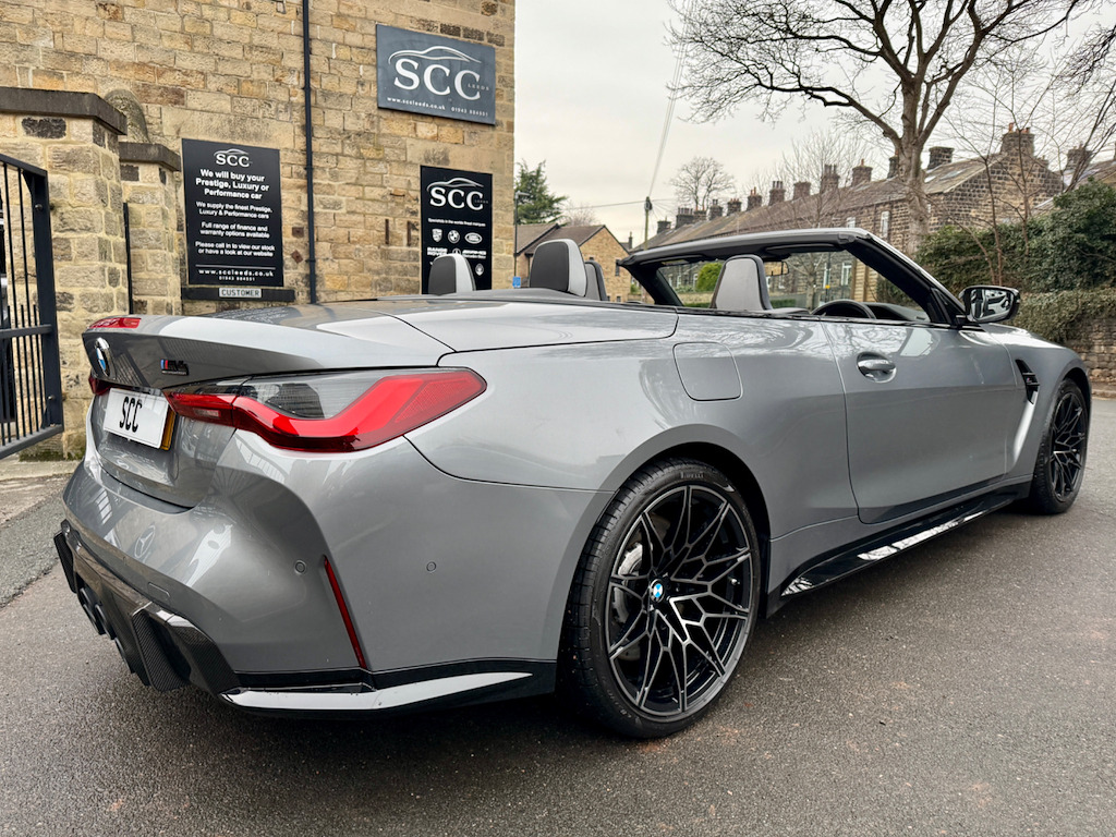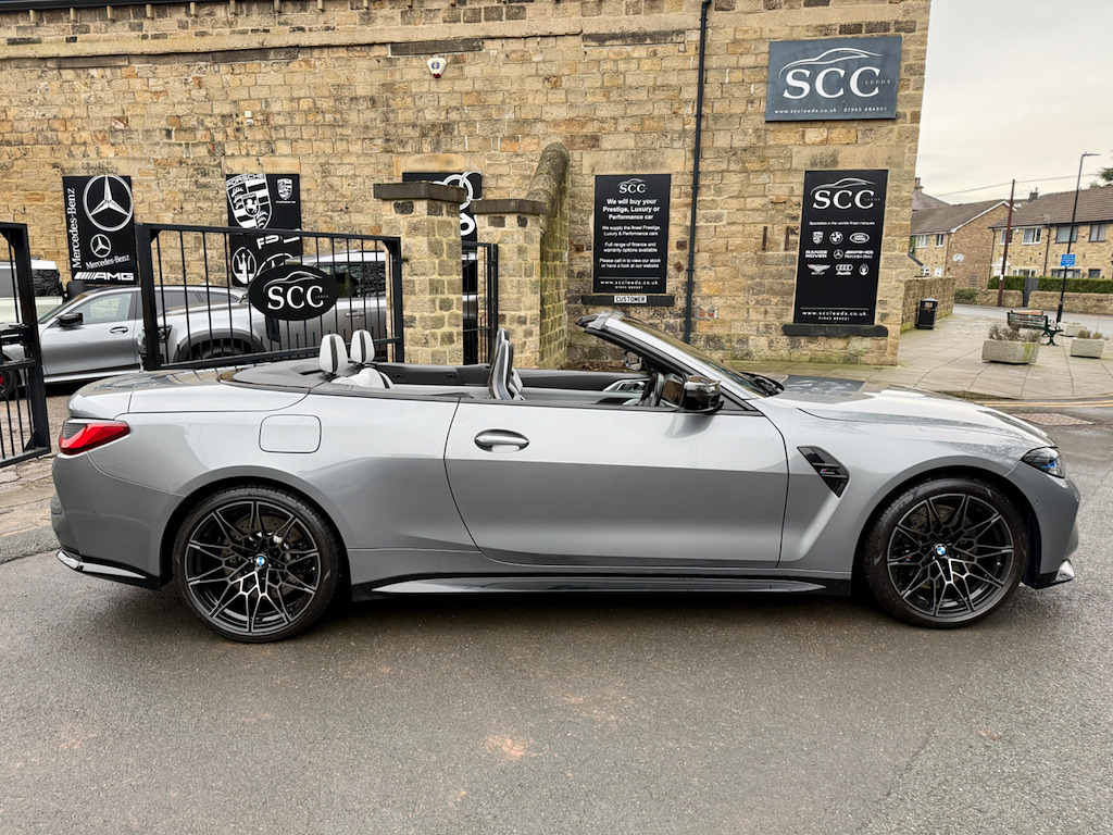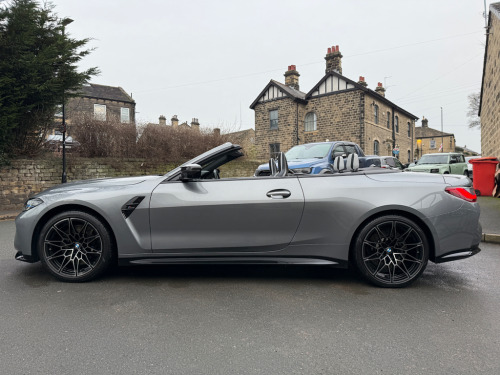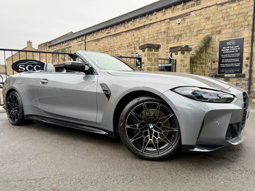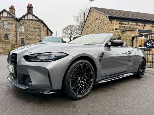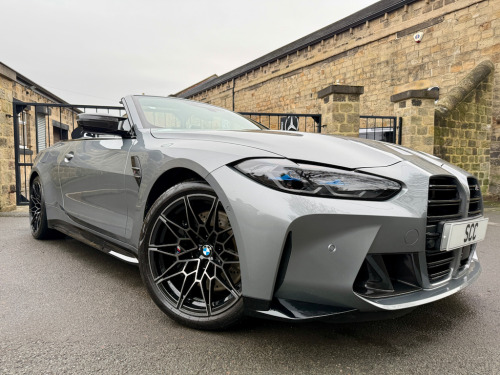 2022 (CP22AKO) BMW M4 Competition Cabriolet xDrive – Ultimate Pack! Sky Scraper Grey, Silverstone & Black Merino Leather £57,695, 11,000 Miles, 2 Owners. **FULL BMW HISTORY INC. RUNNING IN CHECK** An exceptional BMW M4 Competition Cabriolet, finished in the stunning Sky Scraper Grey with a striking Silverstone & Black Merino leather interior. A true driver’s car that blends supercar-level performance with everyday usability and open-top drama. Under the bonnet sits BMW M’s 3.0-litre twin-turbocharged straight-six, producing a ferocious 510bhp, delivered through the lightning-fast 8-speed automatic gearbox and xDrive all-wheel drive system. The result is relentless acceleration, razor-sharp handling and immense confidence in all conditions. As a dealer supplied extra this car has the 4 exit M Performance Exhaust system giving this car a fantastic soundtrack. This example benefits from the Ultimate Pack, adding a host of premium technology, comfort and driver assistance features to complement the M4’s aggressive character. Specification Highlights:- M4 Competition Cabriolet xDrive Ultimate Pack 510bhp Twin-Turbo M Engine 8-Speed M Steptronic Transmission M Performance Exhaust System Adaptive M Suspension M Sport Exhaust Sky Scraper Grey Paintwork Silverstone & Black Merino Leather Interior Heated Steering Wheel Comfort Access (Keyless Entry) Adaptive LED Headlights Parking Assistant Plus with 360° Cameras Digital Cockpit & Navigation Apple CarPlay / Android Auto Electric Heated Seats Electric Folding Soft-Top Interior Carbon Pack (£1200 on this car) Ultimate Pack (UK Specification) The Ultimate Pack on BMW M4 Convertible includes a mix of performance, luxury and tech enhancements:- Core Pack Features Heated multifunction steering wheel Comfort Access (keyless entry) Adaptive LED Headlights (often with high-beam assist) Parking Assistant Plus (360° camera & automated parking) Lane Departure & Lane Change Warning Sun protection glass Extended storage & other comfort extras Interior & Styling Upgrades M Carbon Bucket Seats (often optional within Ultimate Pack - ours has it) Carbon exterior trim and M Carbon styling options BMW Individual Shadowline lighting trim Luxury instrument panel & premium interior finishes The Ultimate Pack often combines multiple option lines and on many cars includes Driving Assistant Professional and M Driver’s Pack. The interior offers a perfect mix of luxury and motorsport influence, while the aggressive exterior styling and wide stance ensure this M4 looks every bit as fast as it drives. Roof down or up, this car delivers an unforgettable driving experience. With just 11,000 miles and only 2 owners, this is a superb, well-kept example (serviced 3 times already by BMW - last serviced March 2025)that represents outstanding value for a high-spec M car. Fresh MOT upon receipt of deposit. Serious performance. Serious presence. Enquire now to arrange a viewing or test drive 01943884551 12V Power Socket in Front Centre Console and Blanking Plug,19in Front - 20in Rear Alloy Wheels - M Double Spoke - 826 - Forged - Jet Black with Mixed Tyres,8 Programmable Favourite Buttons,ABS - Anti Lock Braking System,AUX-In Connection,Adaptive M Suspension,Air Conditioning - Automatic with Three-Zone,Airbags,Alarm,Ambient Lighting,Automatic Windscreen Wiper and Headlights,BMW ConnectedDrive Online Services,BMW Emergency Call,BMW Individual High-Gloss Shadowline with Extended Contents,BMW Live Cockpit Professional,BMW Mobility Kit,BMW Shadow Lights,BMW TeleServices,Bottle Holders Integrated into Door Trim Storage Compartments - Front - Up to 1 litre,Bumper System - Front and Rear,Carbon-Fibre Reinforced Plastic - CFRP - Roof,Child Seat ISOFIX Attachment,Compartment in Front of Cupholder,Condition Based Service,Connected Package Professional,Control Display - 10.25in Colour Display Screen,Crash Sensor,Cruise Control with Brake Function,Cup Holders in Front - Two with Clamping Elements,DAB Digital Radio,DSC - Dynamic Stability Control - Stabilises the Vehicle in Extreme Situations - Controls Traction,Door Sill Finishers with Aluminium Inserts and Model Inscriptions,Driving Assistant,Dynamic Brake Lights,EPS - Electric Power Steering,Electric Windows - Front and Rear with Open-Close Fingertip Control - Anti-Trap Facility and Comfort Closing Function,Electronic Engine Immobiliser,Extended Storage,Exterior Mirrors - Electrically Folding with Anti Dazzle,Exterior Parts in Body Colour,Exterior Trim - High-Gloss Shadowline,Galvanic Embellisher for Controls,Gearshift Lever with Embossed M Badge,Glove Box,High-Beam Assistant,Instrument Cluster with Extended Contents,Interior Lighting,Interior Rear-View Mirror with Automatic Anti-Dazzle Function,Interior Trim - Black High Gloss,Interior Trim - Carbon Fibre,Kidney Grille with Frameless High Gloss and Model Badging,LED Headlights,LED Taillights with New 3D L-Shaped LED Light Design,Language Version English Handbook,Loudspeaker System - Harman Kardon,Lumbar Support - Driver and Front Passenger,M Compound Brake - Red High Gloss,M Designation,M Drive Professional,M Head-Up Display,M Multifunctional Leather Steering Wheel - Three Spoke with Steering Column Adjustments,M Rear Lip Spoiler in High Gloss Black,M Seat Belts,M Servotronic,M Sport Differential,M Sport Seats,Model Badge in Black,Oil Sensor For Level and Grade - Warning by Check Control System,Optimum Shift Indicator,Parking Assistant,Rear Backrest - Lightweight Construction - Foldable and 60:40 Dividable,Rear Fog Light,Reflector,Roof - Retractable Hard Top,Run-Flat Indicator,Seat Adjustment - Front Electric with Driver Memory,Seat Heating for Driver and Front Passenger,Side Impact Protection,Speed Limiter,Steering Column with Manual Reach and Rake Adjustment,Storage Compartment in the Rear Side Trim,Storage Tray and Compartment with Lid in Centre Console,Sun Visors with Illuminated Vanity Mirrors and Insert Tab for Driver and Passenger,Tailpipe Finishers in Black Chrome,Three-Poi