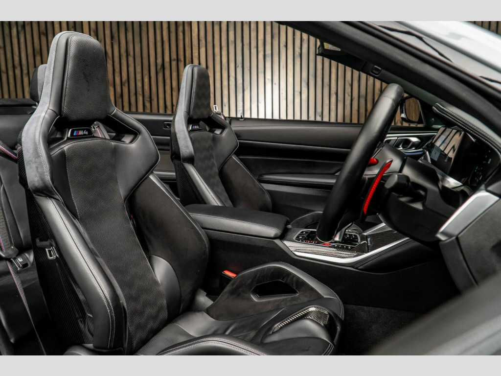 This 2022 BMW M4 BiTurbo Competition is a remarkable example of performance engineering, boasting a powerful 3.0L petrol engine and a sophisticated Four Wheel Drive system. As a Euro 6 compliant vehicle, it meets stringent emission standards. This M4 comes equipped with the desirable Ultimate Package, which includes adaptive cruise control and a 360 degree camera for enhanced parking assistance. Inside, you'll find M Carbon Bucket Seats with memory function, a heated steering wheel for comfort in all conditions, and the M Carbon Exterior Package for a striking visual appeal. The Parking Assistant Plus further aids manoeuvrability with front and rear cameras and sensors.The M4 BiTurbo Competition offers an exhilarating driving experience, achieving an impressive 0 to 62mph in just 3.7 seconds, demonstrating its superior acceleration compared to many other vehicles in its class. This model also benefits from a low insurance group, making it a more accessible choice for performance enthusiasts. Furthermore, it provides generous boot space, a practical advantage that sets it apart from similar performance cars.. 12V Power Socket in Front Centre Console and Blanking Plug, 19in Front - 20in Rear Alloy Wheels - M Double Spoke - 826 - Forged - Jet Black with Mixed Tyres, 8 Programmable Favourite Buttons, ABS - Anti Lock Braking System, AUX-In Connection, Adaptive M Suspension, Air Conditioning - Automatic with Three-Zone, Airbags, Alarm, Ambient Lighting, Automatic Windscreen Wiper and Headlights, BMW ConnectedDrive Online Services, BMW Emergency Call, BMW Individual High-Gloss Shadowline with Extended Contents, BMW Live Cockpit Professional, BMW Mobility Kit, BMW Shadow Lights, BMW TeleServices, Bottle Holders Integrated into Door Trim Storage Compartments - Front - Up to 1 litre, Bumper System - Front and Rear, Carbon-Fibre Reinforced Plastic - CFRP - Roof, Child Seat ISOFIX Attachment, Compartment in Front of Cupholder, Condition Based Service, Connected Package Professional, Control Display - 10.25in Colour Display Screen, Crash Sensor, Cruise Control with Brake Function, Cup Holders in Front - Two with Clamping Elements, DAB Digital Radio, DSC - Dynamic Stability Control - Stabilises the Vehicle in Extreme Situations - Controls Traction, Diffuser in Black High Gloss, Door Sill Finishers with Aluminium Inserts and Model Inscriptions, Driving Assistant, Dynamic Brake Lights, EPS - Electric Power Steering, Electric Windows - Front and Rear with Open-Close Fingertip Control - Anti-Trap Facility and Comfort Closing Function, Electronic Engine Immobiliser, Extended Storage, Exterior Mirrors - Electrically Folding with Anti Dazzle, Exterior Parts in Body Colour, Exterior Trim - High-Gloss Shadowline, Galvanic Embellisher for Controls, Gearshift Lever with Embossed M Badge, Glove Box, Headlining - Anthracite, High-Beam Assistant, Instrument Cluster with Extended Contents, Interior Lighting, Interior Rear-View Mirror with Automatic Anti-Dazzle Function, Interior Trim - Black High Gloss, Interior Trim - Carbon Fibre, Kidney Grille with Frameless High Gloss and Model Badging, LED Headlights, LED Taillights with New 3D L-Shaped LED Light Design, Language Version English Handbook, Loudspeaker System - Harman Kardon, Lumbar Support - Driver and Front Passenger, M Compound Brake - Red High Gloss, M Designation, M Drive Professional, M Head-Up Display, M Multifunctional Leather Steering Wheel - Three Spoke with Steering Column Adjustments, M Rear Lip Spoiler in High Gloss Black, M Seat Belts, M Servotronic, M Sport Differential, M Sport Seats, Model Badge in Black, Oil Sensor For Level and Grade - Warning by Check Control System, Optimum Shift Indicator, Parking Assistant, Rear Backrest - Lightweight Construction - Foldable and 60:40 Dividable, Rear Fog Light, Reflector, Roof - Retractable Hard Top, Run-Flat Indicator, Seat Adjustment - Front Electric with Driver Memory, Seat Heating for Driver and Front Passenger, Side Impact Protection, Speed Limiter, Steering Column with Manual Reach and Rake Adjustment, Storage Compartment in the Rear Side Trim, Storage Tray and Compartment with Lid in Centre Console, Sun Visors with Illuminated Vanity Mirrors and Insert Tab for Driver and Passenger, Tailpipe Finishers in Black Chrome, Three-Point Seat Belts - All Seats, Toolkit Located in Luggage Compartment, Two Tone Horn, Tyre Puncture Warning System - TPWS, Vehicle Key with 4 Buttons including the Integrated Key, Visible VIN, Warm Air Collar, Welcome Light, Windscreen Wipers - with Integrated Washing Jets, Ultimate Package, M Carbon Exterior Package, M Carbon Bucket Seats, Parking Assistant Plus, Wind Deflector, Steering Wheel - Heated, Drive Recorder, Full Merino Leather - Black.