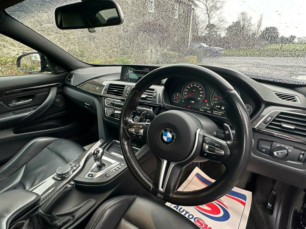 This 2016 BMW M4 BiTurbo is a remarkable example, boasting a powerful 3.0L Petrol Engine and meeting Euro 6 emission standards. Experience the thrill of its impressive acceleration, reaching 0-62mph in just 4.1 seconds. Inside, you'll find a luxurious interior featuring Carbon Fibre trim with Black Chrome highlights, complemented by the exceptional Loudspeaker System from Harman Kardon for an immersive audio experience. Convenience is key with Comfort Access and a Smart Opener, allowing for effortless keyless entry.This M4 also offers practical advantages, including a generous boot space, making it suitable for everyday use. Furthermore, its classification within a low insurance group presents an attractive proposition for potential owners. The Advanced Parking Package, complete with a Reversing Assist Camera and Parking Assistance, ensures manoeuvring in tight spaces is straightforward and stress free. These features collectively highlight how this BMW M4 stands out from other vehicles in its class. udspeaker system - harman kardon, advanced parking package, comfort access with smart opener, interior trim finisher - carbon fibre with black chrome highlight, reversing assist camera, sun protection glazing, 19in alloy wheels - m light double spoke style - 437m - jet black, armrest - front with sliding adjustment, full merino leather - black, 12v power socket - centre console, 12v power socket - passenger footwell, 19in alloy wheels - m light double spoke style - 437m - ferric grey, 20gb hdd memory, abs - anti lock braking system, asc - automatic stability control, active carbon microfilter, active m differential, adaptive m sport suspension, air breather, air conditioning - automatic with two-zone control, airbags - curtain, airbags - driver, airbags - front side, airbags - passenger, airbags - passenger deactivation, alarm system thatcham 1 with remote control, ambient light - centre console storage compartments, ambient light - front, ambient light - rear, armrest - front and rear integrated into door trim, armrest - front with storage compartment, automatic lock when driving away selectable, automatically dimming rear view mirror, auxiliary input, bmw apps interface, bmw connecteddrive online services, bmw emergency call, bmw professional radio - single cd-dvd and mp3, bmw teleservices, battery safety cut off, bluetooth - audio streaming - with compatible devices, bluetooth hands free facility, bottle holders - front door storage compartments, brake assist, brake drying, brake pad wear indicator, bumper system front and rear - replaceable deformation elements for impacts up to 9mph, bumpers - body colour, cbc - cornering brake control, carbon fibre reinforced plastic roof, central locking - remote, check control warning system, child proof locking system - rear doors, child seat isofix attachment - rear, comfort go keyless engine start, crash sensor - activating central locking-hazard warning lights-fuel cut off, cruise control with brake function, cup holders - front, dab digital radio, dbc - dynamic brake control, dsc - dynamic stability control plus, dtc - dynamic traction control, daytime running lights, display - 8.8in colour screen, door handle illumination, door handles - body colour, door mirrors - automatic dipping parking function on passenger side, door mirrors - body coloured, door mirrors - drivers aspheric, door mirrors - folding - automatically dimming, door mirrors - integrated indicator side repeaters, door mirrors - memory via personal profile, door mirrors - passenger side convex, door mirrors - tinted blue, door sill finishers - m designation, dynamic brake lights, electric windows - front open and close fingertip control, engine immobiliser, enhanced bluetooth telephone preparation with usb audio interface and voice control, enhanced route planning, exhaust tailpipes - quad - chrome, exit lighting - front, extended lighting, exterior trim - high-gloss shadowline, first aid kit, floor mats - velour, follow me home headlight function, footwell lights - front, full black panel display, gear knob - leather, glove compartment, grab handles - in roof lining x4, handbrake - leather, handbrake lever and gear lever in leather with m badge, head restraints - front and rear, headlight - beam-throw control - automatic levelling, headlights - automatic activation, headlights - led eyebrow, headlights - washer system, headlining - anthracite, heat protection glazing with green tint, heated windscreen washer jets, high level third brake light, hill start assist, humidity sensor, illuminated led corona rings, illuminated vanity mirrors for driver and passenger, information plus, interior lighting - front and rear centre, interior trim finisher - blue shadow with black high gloss highlight, kidney grille - chrome with double black vertical slats, led tailights, lights-on audio warning, luggage compartment - lashing eyes, luggage compartment - light, luggage compartment light - led, m aerodynamic bodystyling, m drive manager, m instrument cluster, m mobility tyre sealing system, m rear spoiler, mdm - m dynamic mode, media package - bmw professional, model designation, multifunction controls for steering wheel, navigation system - bmw professional multimedia, non smokers package, obc - on-board computer, pdc - park distance control - front and rear, pdc - park distance control - rear, personal profile, rain sensor, reading lights - front - led, real time traffic information, rear interior light - centre with reading lights using led technology, remote services, seat adjustment - front electric with driver memory, seat belt security check for driver, seats - 60-40 split folding rear, seats - backrest width adjustment - front, seats - driver memory, seats - drivers electric height adjustment, seats - front 4-way electric lumbar support, seats - front heated, seats - front m sport, seats - front passengers electric height adjustment, seats - illuminated m logo, servotronic steering, sha