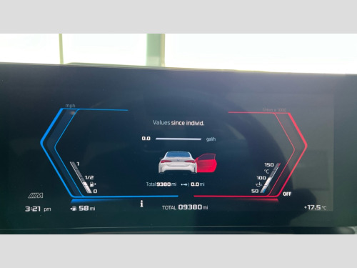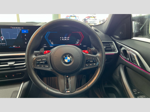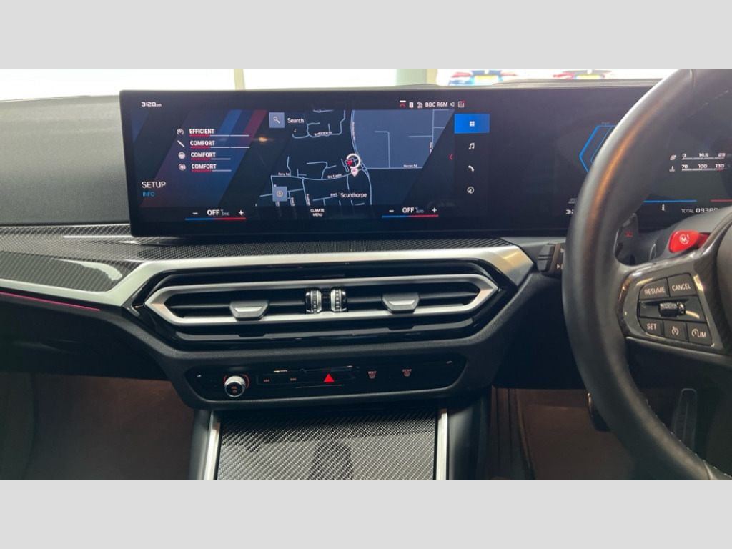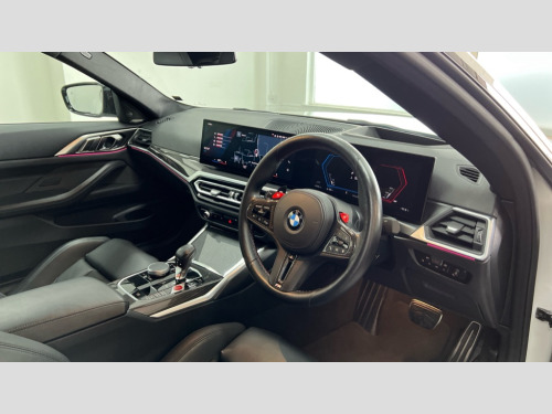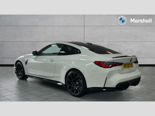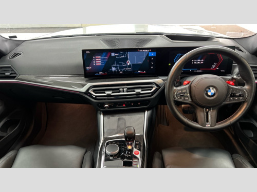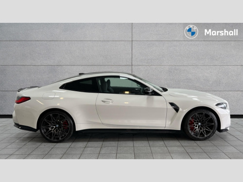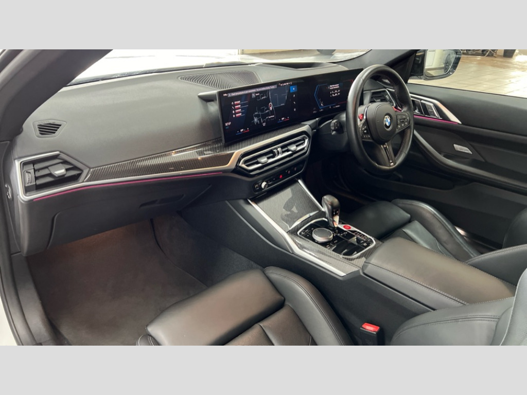 BMW M4 M4 Competition 2dr Step Auto Active guard plus, Automatic start/stop system, BMW ConnectedDrive online services, BMW iDrive controller on centre console, BMW legal emergency call, BMW Live Cockpit Pro with Head up display including 12.3" instrument display and 14.9" high resolution control display with navigation function, BMW Teleservices, Brake pad wear indicator warning light, Condition based service, Door/boot open warning light, Driving experience switch, Electric Power Steering (EPS) with Servotronic, Instrument cluster with extended contents, Language version English, Lights on warning, M drive buttons, Oil sensor for level and grade, warning by check control system, Oil temperature gauge, On board computer, On board diagnostics, Optimum shift indicator, Outside temperature display, Park distance control, Pull away assistant, Run flat indicator, Service interval indicator, Shifting point display, Speed limiter, Start/stop button in blue, Variable sport steering, Adaptive M Sport suspension, Double joint spring strut front axle, M Drive Professional including track mode, laptimer, traction control & Drift analyser, M Sport differential, M steptronic sport transmission with drivelogic, Safety battery terminal clamp, 8 programmable favourite buttons, Auxiliary point for auxiliary devices, BMW professional radio/CD/MP3, DAB Digital radio, Harman/Kardon loudspeaker system, Acoustic laminated side glass, Auto dimming driver's door mirror, Auto dimming rear view mirror, Automatic headlights + automatic windscreen wipers, Black chrome exhaust tailpipes, Black model designation badges, BMW high gloss shadow line with extended contents, BMW Individual shadowline lights, Body colour bumpers, Body colour door handles, Carbon fibre reinforced plastic (CFRP) roof, Day time running light, Door mirror integrated indicators, Door sill finishers with aluminium inserts, Dynamic brake lights, Electric adjustable heated door mirrors, Electric folding door mirrors, Follow me home headlights, Front and rear bumper system, Front electric windows with open and close fingertip control, anti trap facility and comfort closing, Headlight beam throw control, Heat protection, sun protection glazing, Heated washer jets, High beam assistant, High gloss black frameless kidney grille with M badge, LED number plate light, LED tail lights with 3D L-shaped LED light design, M designation, Mirror glass aspheric on driver's side, convex on passenger side, Rain sensor, Rear boot, Rear fog lights, Rear reflectors, Reversing light, Shark fin roof aerial, Third brake light, Visible VIN plate, Welcome lighting, 2 cupholders in front centre console, 2 cupholders in rear armrest, 2 rear head restraints, 2 x 12 V Power sockets (luggage compartment and front centre console), 2 x USB Type C ports for charging and data transmission in front centre console, 40:20:40 split folding rear 2 seat bench with loading system, Ambient lighting, Anthracite headlining, Battery in luggage compartment, Carbon fibre centre console incl. cover for cupholders and storage compartment, Carbon fibre decorative steering wheel finishers, Carbon fibre shift paddles, Carbon fibre strip in instrument panel on front passenger side, Centre console armrest with storage compartment, Compartment in front of cupholder, Driver/passenger sunvisors with ticket holders + illuminated vanity mirrors, Electric front seats + driver memory, English handbook, Floor mats in velour, Footwell lighting, Front and rear door exit lights, Front door storage bins with bottle holder, Front interior light, Front isofix attachment + airbag deactivation, Front reading light, Front seat backrest width adjustment, Front seats lumbar support, Front/rear door armrests, Gearshift lever with embossed M badge, Heated front seats, Height adjustable front headrests, Illumination in armrest storage compartment, Interior mirror lighting, Isofix on 2nd row outer seats, Lockable/illuminated glovebox, Luggage compartment lighting, Multifunction steering wheel, Rake/reach adjustable steering wheel, Single front passenger seat, Storage compartment in rear doors, Storage tray and compartment with cover in centre console, Three zone automatic air conditioning, Toolkit located in luggage compartment, Wireless charging tray, Additional storage compartment pack - M4, Connected package professional - M4, High gloss shadowline exterior trim pack - M4, 4 x 3 point seatbelts, ABS/EBD, Automatic Stability Control (ASC), Brake energy regeneration, Brake fade compensation, Compound structure brake discs, Cornering brake control (CBC), Crash sensor, Curtain airbags, Driver/Front Passenger airbags, Dry braking, Dynamic brake control, Dynamic stability control + (DSC+), Dynamic Traction Control - DTC, Electromechanical parking brake, Electronic differential lock control (EDLC), Front and rear head airbags, Front seat side impact airbags, Front seatbelt pretensioners + load limiters, Hill start assist, M Sport seat belts, Seat occupancy detection for driver and passenger side, Seatbelt warning, Side impact protection, Two tone horn, Tyre pressure sensor, Warning triangle and first aid kit, Centre lock switch, Closing system with central locking, Digital key, Electronic immobiliser, Remote central locking, Thatcham cat 1 remote alarm, Vehicle Key with 4 buttons including the integrated key, Galvanic finish to control surrounds, High gloss black interior trim, Tyre repair kit