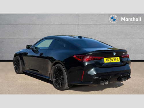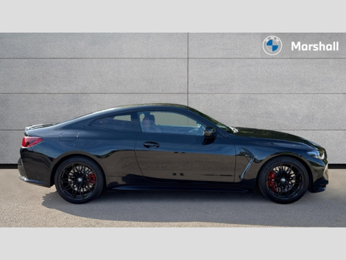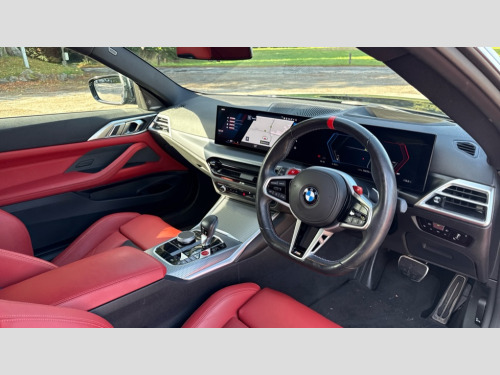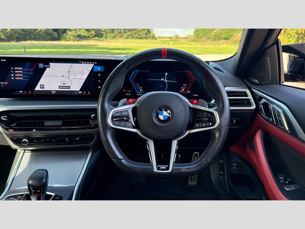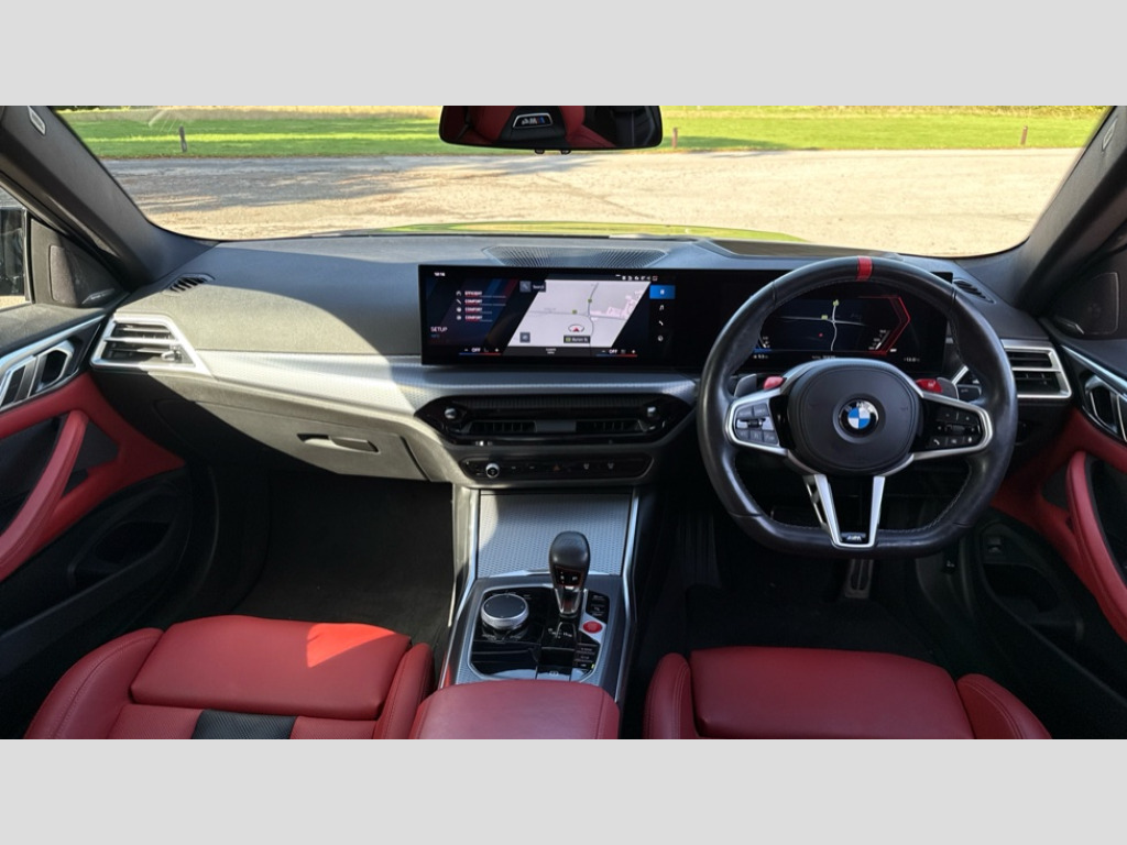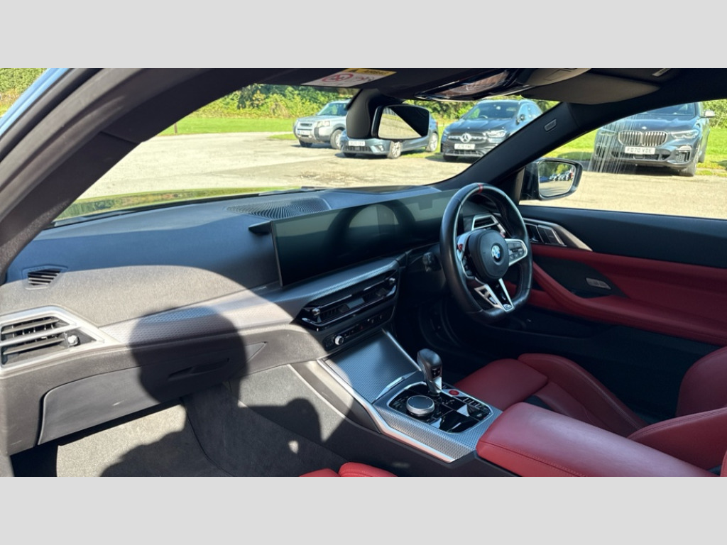 BMW M4 M4 xDrive 530 Competition M 2dr Step Auto Active guard plus, Automatic start/stop system, BMW ConnectedDrive online services, BMW legal emergency call, BMW Live Cockpit Pro with Head up display including 12.3" instrument display and 14.9" high resolution control display with navigation function, BMW Teleservices, Brake pad wear indicator warning light, Condition based service, Cruise control with braking function, Door/boot open warning light, Driving experience switch, Electric Power Steering (EPS) with Servotronic, Language version English, Lights on warning, M drive buttons, Oil sensor for level and grade, warning by check control system, Oil temperature gauge, On board computer, On board diagnostics, Optimum shift indicator, Outside temperature display, Park distance control, Pull away assistant, Run flat indicator, Service interval indicator, Shifting point display, Smartphone integration, Speed limiter, Start/stop button in red, Variable sport steering, Double joint spring strut front axle, M Adaptive suspension, M Drive Professional including track mode, laptimer, traction control & Drift analyser, M Sport differential, Safety battery terminal clamp, Sport automatic transmission with gearshift paddles, Auxiliary point for auxiliary devices, DAB radio with bluetooth music capability, Harman kardon surround sound audio system, Personal eSim, Acoustic laminated side glass, Auto dimming driver's door mirror, Automatic headlights + automatic windscreen wipers, Black chrome exhaust tailpipes, Black model designation badges, BMW high gloss shadow line with extended contents, BMW radiator grille, frameless, with horizontal double blind slats, black high-gloss, with model badge, Body colour bumpers, Bonnet and tailgate badge, Carbon fibre reinforced plastic (CFRP) roof, Day time running light, Door mirror integrated indicators, Dynamic brake lights, Electric adjustable heated door mirrors, Electric folding door mirrors, Entry sills with aluminium inserts and model badge, Extended Stroage, Follow me home headlights, Front and rear bumper system, Front and rear plastic apron in vehicle colour, Front door sill strips in aluminium inlays with M4 inscription, Front electric windows with open and close fingertip control, anti trap facility and comfort closing, Headlight beam throw control, Heat protection, sun protection glazing, Heated washer jets, Interior rear-view mirror with automatic anti-dazzle function, LED tail lights with 3D L-shaped LED light design, M designation, Mirror glass aspheric on driver's side, convex on passenger side, Rain sensor, Rear boot, Rear fog lights, Rear reflectors, Reversing light, Roof fin and roof trim strips in Black high-gloss, Shark fin roof aerial, Strakes in front side panel, black matt/high-gloss black, with model badge, Third brake light, Visible VIN plate, Welcome lighting, 2 cupholders in front centre console, 2 cupholders in rear armrest, 2 rear head restraints, 2 x 12 V Power sockets (luggage compartment and front centre console), 2 x USB Type C ports for charging and data transmission in front centre console, 40:20:40 split folding rear 2 seat bench with loading system, Ambient lighting, Anthracite headlining, Battery in luggage compartment, Centre console armrest with storage compartment, Driver/passenger sunvisors with ticket holders + illuminated vanity mirrors, Driving experience mode switch, Electric front seats + driver memory, English handbook, Floor mats in velour, Footwell lighting, Front and rear door exit lights, Front door storage bins with bottle holder, Front interior light, Front isofix attachment + airbag deactivation, Front reading light, Front seat backrest width adjustment, Front/rear door armrests, Heated front seats, Height adjustable front headrests, Illuminated bow-type door handles in vehicle colour, driver's side with door lock, Interior mirror lighting, Isofix on 2nd row outer seats, Lockable/illuminated glovebox, Luggage compartment lighting, Multifunction steering wheel, Rake/reach adjustable steering wheel, Single front passenger seat, Storage compartment in rear doors, Storage tray and compartment with cover in centre console, Three zone automatic air conditioning, Toolkit located in luggage compartment, Wireless charging tray, Connected package professional - M4, High gloss shadowline exterior trim pack - M4, 4 x 3 point seatbelts, ABS/EBD, Automatic Stability Control (ASC), Brake energy regeneration, Brake fade compensation, Compound structure brake discs, Cornering brake control (CBC), Crash sensor, Curtain airbags, Driver/Front Passenger airbags, Dry braking, Dynamic brake control, Dynamic stability control + (DSC+), Dynamic Traction Control - DTC, Electromechanical parking brake, Electronic differential lock control (EDLC), Front and rear head airbags, Front seat side impact airbags, Front seatbelt pretensioners + load limiters, Hill start assist, M Sport seat belts, Seat occupancy detection for driver and passenger side, Seatbelt warning, Side impact protection, Two tone horn, Tyre pressure sensor, Warning triangle and first aid kit, Centre lock switch, Closing system with central locking, Electronic immobiliser, Locking wheel bolts, Remote central locking, Thatcham cat 1 remote alarm, Vehicle Key with 4 buttons including the integrated key, Galvanic embellisher for controls, Tyre repair kit