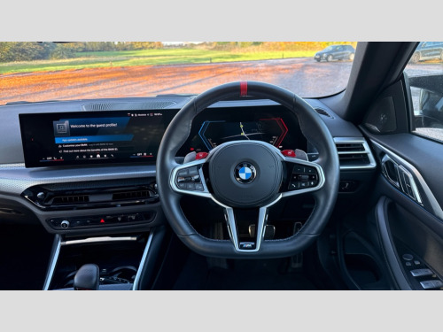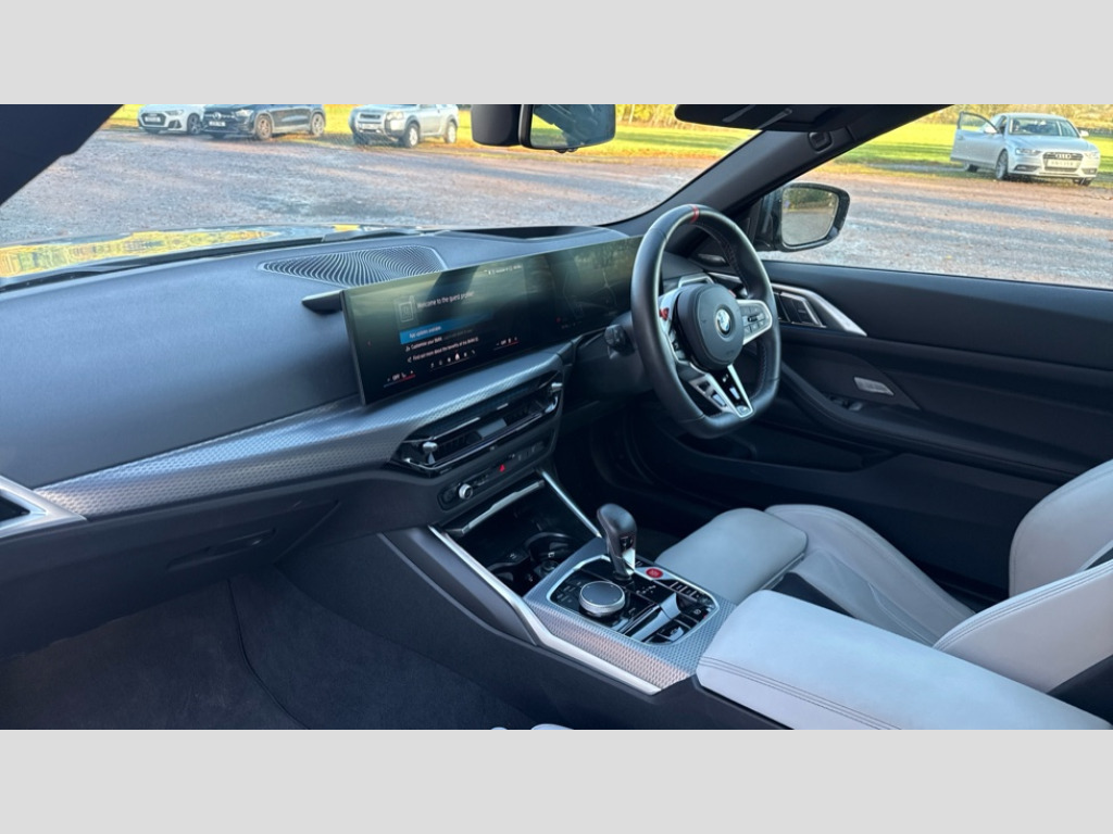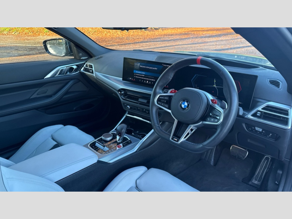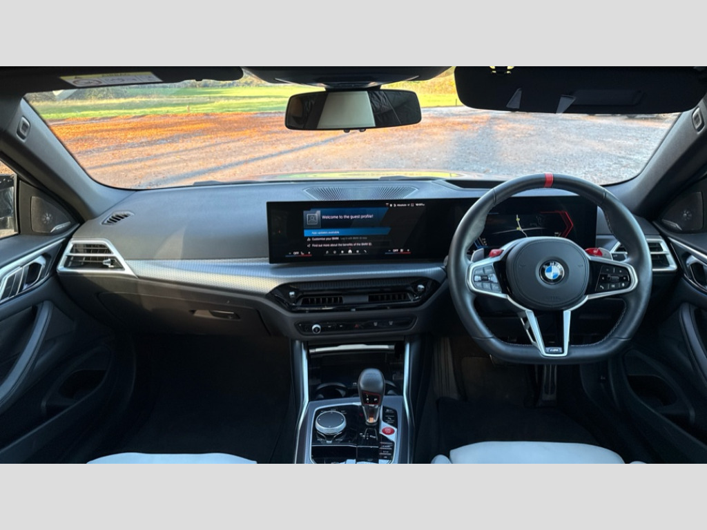 BMW M4 M4 xDrive 530 Competition M 2dr Step Auto Active Guard, Automatic start/stop system, BMW ConnectedDrive online services, BMW legal emergency call, BMW Live Cockpit Pro with Head up display including 12.3" instrument display and 14.9" high resolution control display with navigation function, BMW Teleservices, Brake pad wear indicator warning light, Condition based service, Cruise control with braking function, Door/boot open warning light, Electric Power Steering (EPS) with Servotronic, Language version English, Lights on warning, M drive buttons, Oil sensor for level and grade, warning by check control system, Oil temperature gauge, On board computer, On board diagnostics, Optimum shift indicator, Outside temperature display, Park distance control, Pull away assistant, Run flat indicator, Service interval indicator, Shifting point display, Smartphone integration, Start/stop button in red, Variable sport steering, Double joint spring strut front axle, M Adaptive suspension, M Drive Professional including track mode, laptimer, traction control & Drift analyser, M Sport differential, Safety battery terminal clamp, Sport automatic transmission with gearshift paddles, Auxiliary point for auxiliary devices, DAB radio with bluetooth music capability, Harman kardon surround sound audio system, Personal eSim, Acoustic laminated side glass, Auto dimming driver's door mirror, Automatic headlights + automatic windscreen wipers, Automatic parking function on front passenger's exterior mirror, Black chrome exhaust tailpipes, Black model designation badges, BMW high gloss shadow line with extended contents, BMW radiator grille, frameless, with horizontal double blind slats, black high-gloss, with model badge, Body colour bumpers, Bonnet and tailgate badge, Carbon fibre reinforced plastic (CFRP) roof, Day time running light, Door mirror integrated indicators, Dynamic brake lights, Electric adjustable heated door mirrors, Electric folding door mirrors, Electrochromic exterior driver side mirror, Electrochromic interior rear view mirror with automatic anti-dazzle function, Entry sills with aluminium inserts and model badge, Extended Stroage, Follow me home headlights, Front and rear bumper system, Front and rear plastic apron in vehicle colour, Front door sill strips in aluminium inlays with M4 inscription, Front electric windows with open and close fingertip control, anti trap facility and comfort closing, Headlight beam throw control, Heated washer jets, High gloss black lower bumper edges, side sills and diffuser edge binding, LED tail lights with 3D L-shaped LED light design, M designation, Mirror glass aspheric on driver's side, convex on passenger side, Rain sensor, Rear boot, Rear fog lights, Rear reflectors, Reversing light, Roof fin and roof trim strips in Black high-gloss, Shark fin roof aerial, Strakes in front side panel, black matt/high-gloss black, with model badge, Third brake light, Visible VIN plate, Welcome lighting, 2 cupholders in front centre console, 2 cupholders in rear armrest, 2 rear head restraints, 2 x 12 V Power sockets (luggage compartment and front centre console), 2 x USB Type C ports for charging and data transmission in front centre console, 40:20:40 split folding rear 2 seat bench with loading system, Ambient inside door handle light, Ambient lighting for storage compartment, Ambient lighting front and rear, Anthracite headlining, Battery in luggage compartment, Centre console armrest with storage compartment, Contour lighting for door trim, Driver/passenger sunvisors with ticket holders + illuminated vanity mirrors, Driving experience mode switch, Dual zone automatic air conditioning, Dynamic ambient interior lighting, Electric front seats + driver memory, English handbook, Floor mats in velour, Front and rear door exit lights, Front door storage bins with bottle holder, Front footwell ambient lighting, Front interior light, Front isofix attachment + airbag deactivation, Front reading light, Front seat backrest width adjustment, Front/rear door armrests, Heated front seats, Height adjustable front headrests, Illuminated bow-type door handles in vehicle colour, driver's side with door lock, Interior mirror lighting, Isofix on 2nd row seats, Lockable/illuminated glovebox, Luggage compartment lighting, Multifunction steering wheel, Rake/reach adjustable steering wheel, Single front passenger seat, Storage compartment in rear doors, Storage tray and compartment with cover in centre console, Through loading system, Toolkit located in luggage compartment, Waterfall lighting for central air vent, Wireless charging tray, Connected package professional - M4, Extended storage pack - M3/M4, High gloss shadowline exterior trim pack - M4, 4 x 3 point seatbelts, ABS/EBD, Automatic Stability Control (ASC), Brake energy regeneration, Brake fade compensation, Compound structure brake discs, Cornering brake control (CBC), Crash sensor, Curtain airbags, Driver/Front Passenger airbags, Dry braking, Dynamic brake control, Dynamic stability control + (DSC+), Dynamic Traction Control - DTC, Electromechanical parking brake, Electronic differential lock control (EDLC), Front and rear head airbags, Front seat side impact airbags, Front seatbelt pretensioners + load limiters, Hill start assist, M Sport seat belts, Seat occupancy detection for driver and passenger side, Seatbelt warning, Side impact protection, Two tone horn, Tyre pressure sensor, Warning triangle and first aid kit, Centre lock switch, Closing system with central locking, Electronic immobiliser, Locking wheel bolts, Remote central locking, Thatcham cat 1 remote alarm, Vehicle Key with 4 buttons including the integrated key, Galvanic embellisher for controls, Tyre repair kit