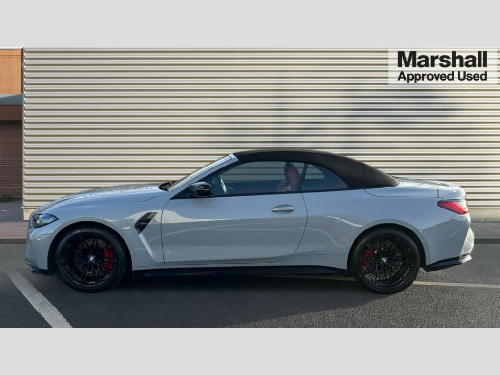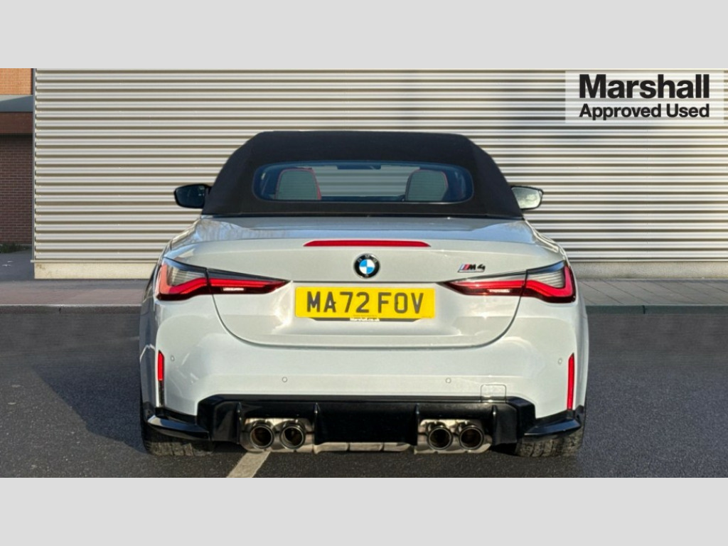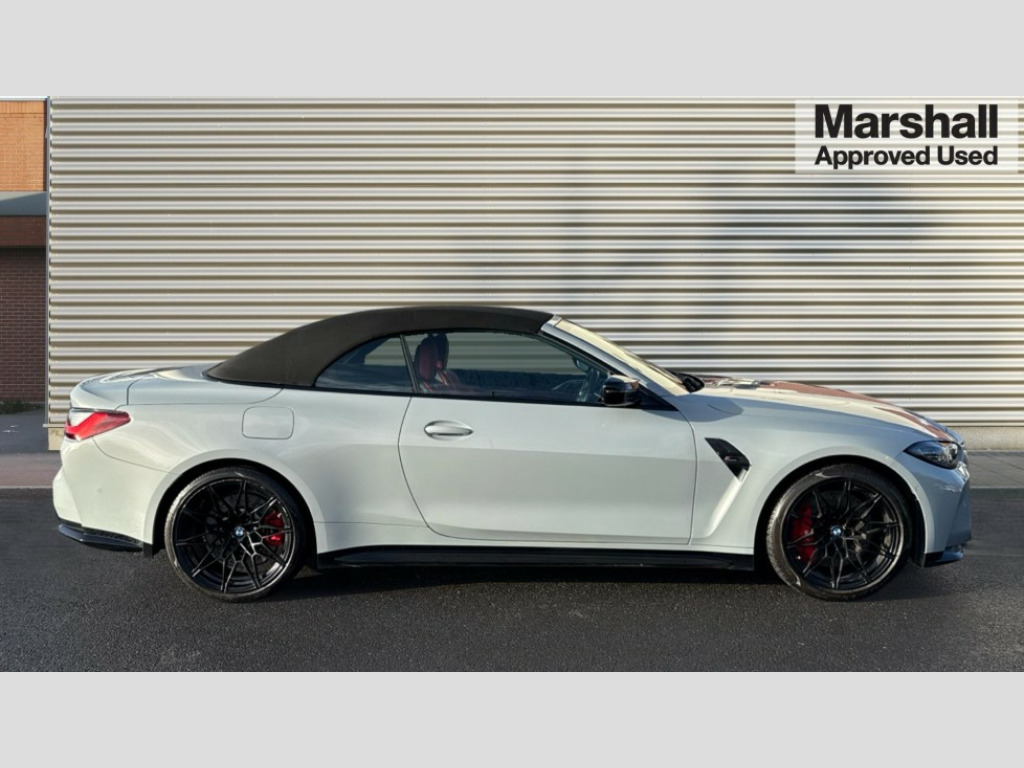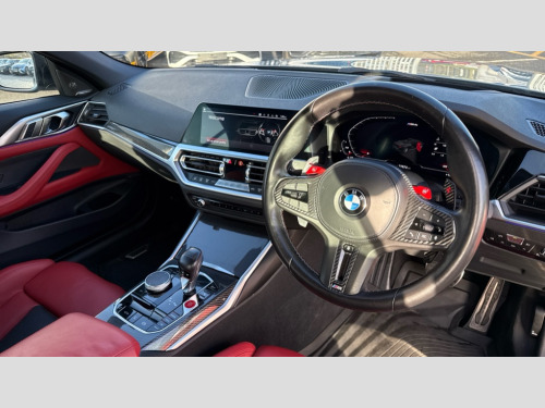 BMW M4 M4 xDrive Competition M 2dr Step Auto Active guard plus, Automatic start/stop system, BMW iDrive controller on centre console, BMW legal emergency call, BMW Live Cockpit Professional sat nav system with 12.3" instrument display and high resolution control display, BMW Online services, BMW Teleservices, Brake pad wear indicator warning light, Condition based service, Connected drive services, Door/boot open warning light, Driving experience switch, Electric Power Steering (EPS) with Servotronic, Enhanced bluetooth with wireless charging, Head up Display, Instrument cluster with extended contents, Lights on warning, M drive buttons, Oil sensor for level and grade, warning by check control system, Oil temperature gauge, On board computer, On board diagnostics, Optimum shift indicator, Outside temperature display, Pull away assistant, Run flat indicator, Service interval indicator, Speed limiter, Adaptive M Sport suspension, Double joint spring strut front axle, M Drive Professional including track mode, laptimer, traction control & Drift analyser, M Sport differential, M steptronic sport transmission with drivelogic, Safety battery terminal clamp, 8 programmable favourite buttons, Auxiliary point for auxiliary devices, BMW professional radio/CD/MP3, DAB Digital radio, Harman/Kardon loudspeaker system, Acoustic laminated side glass, Auto dimming driver's door mirror, Auto dimming rear view mirror, Automatic headlights + automatic windscreen wipers, Black chrome exhaust tailpipes, Black model designation badges, BMW high gloss shadow line with extended contents, BMW Individual shadowline lights, Body colour bumpers, Body colour door handles, Carbon fibre reinforced plastic (CFRP) roof, Day time running light, Door mirror integrated indicators, Door sill finishers with aluminium inserts, Dynamic brake lights, Electric adjustable heated door mirrors, Electric folding door mirrors, Follow me home headlights, Front and rear bumper system, Front electric windows with open and close fingertip control, anti trap facility and comfort closing, Headlight beam throw control, High beam assistant, High gloss black frameless kidney grille with M badge, LED number plate light, LED tail lights with 3D L-shaped LED light design, M designation, Mirror glass aspheric on driver's side, convex on passenger side, Rain sensor, Rear boot, Rear fog lights, Rear reflectors, Reversing light, Shark fin roof aerial, Third brake light, Visible VIN plate, Welcome lighting, Windscreen wipers with integrated washing jets, 2 cupholders in front centre console, 2 rear head restraints, 2 x 12 V Power sockets (luggage compartment and front centre console), 2 x USB Type C ports for charging and data transmission in front centre console, 2 x USB Type C ports for charging in rear centre console, 40:20:40 split folding rear 2 seat bench with loading system, Ambient lighting, Anthracite headlining, Battery in luggage compartment, Carbon fibre centre console incl. cover for cupholders, Carbon fibre decorative steering wheel finishers, Carbon fibre shift paddles, Carbon fibre strip in instrument panel on front passenger side, Centre console armrest with storage compartment, Compartment in front of cupholder, Driver/passenger sunvisors with illuminated vanity mirrors + covers, Electric front seats + driver memory, English handbook, Floor mats in velour, Footwell lighting, Front and rear door exit lights, Front door storage bins with bottle holder, Front interior light, Front isofix attachment + airbag deactivation, Front seat backrest width adjustment, Front seats lumbar support, Front/rear door armrests, Gearshift lever with embossed M badge, Heated front seats, Height adjustable front headrests, Interior mirror lighting, Isofix on 2nd row seats, Lockable/illuminated glovebox, Luggage compartment lighting, Rake/reach adjustable steering wheel, Single front passenger seat, Storage compartment in rear doors, Storage tray and compartment with cover in centre console, Three zone automatic air conditioning, Toolkit located in luggage compartment, Warm air collar, Additional storage compartment pack - M4, Connected package professional - M4, High gloss shadowline exterior trim pack - M4, 4 x 3 point seatbelts, ABS/EBD, Automatic Stability Control (ASC), Brake energy regeneration, Brake fade compensation, Compound structure brake discs, Cornering brake control (CBC), Crash sensor, Driver/Front Passenger airbags, Dry braking, Dynamic brake control, Dynamic Stability Control with M Dynamic mode, Dynamic Traction Control - DTC, Electromechanical parking brake, Electronic differential lock control (EDLC), Front and rear head airbags, Front seat side impact airbags, Front seatbelt pretensioners + load limiters, Hill start assist, M Sport seat belts, Seatbelt warning, Side impact protection, Two tone horn, Tyre pressure sensor, Warning triangle and first aid kit, Digital key, Electronic immobiliser, Remote central locking, Thatcham cat 1 remote alarm, Vehicle Key with 4 buttons including the integrated key, Galvanic finish to control surrounds, High gloss black interior trim, Tyre repair kit