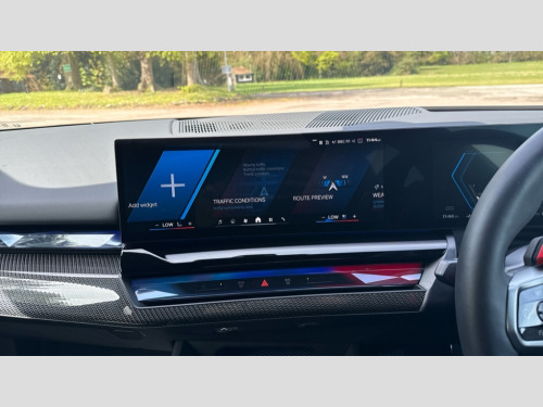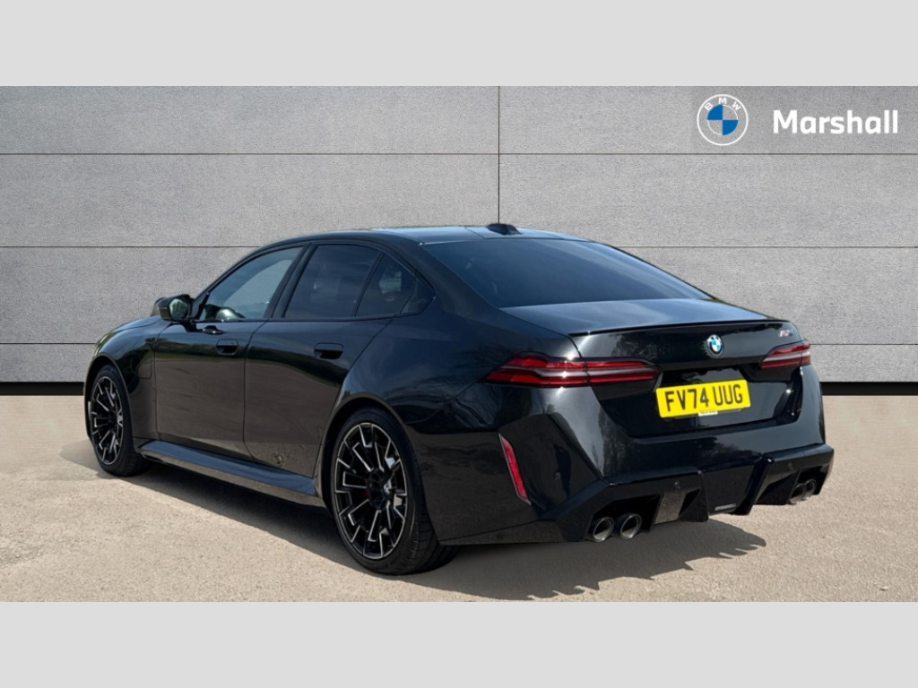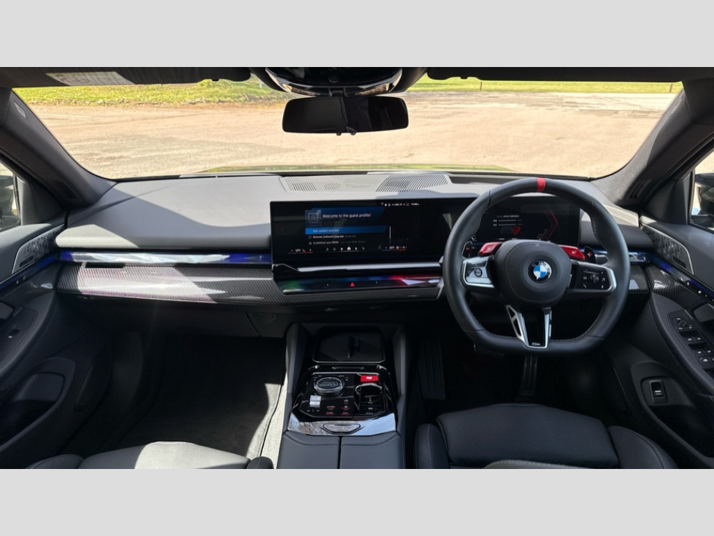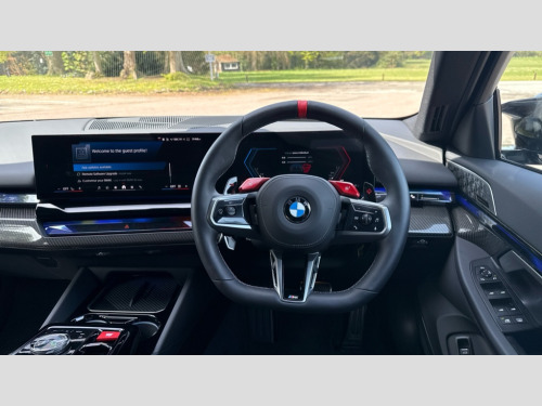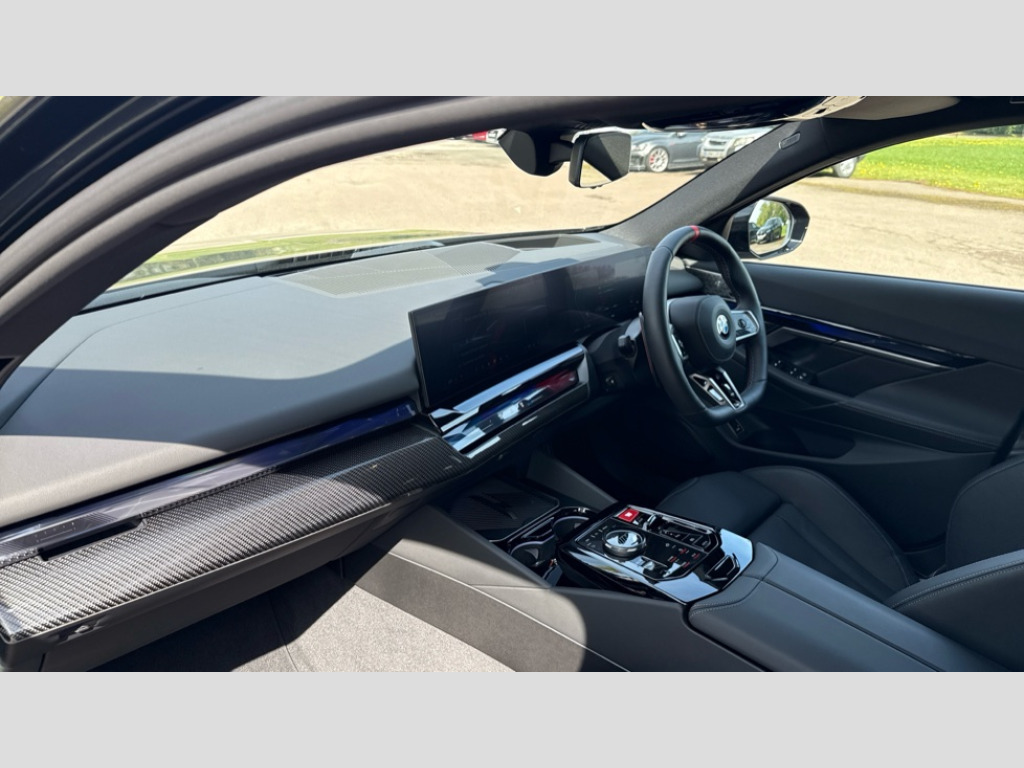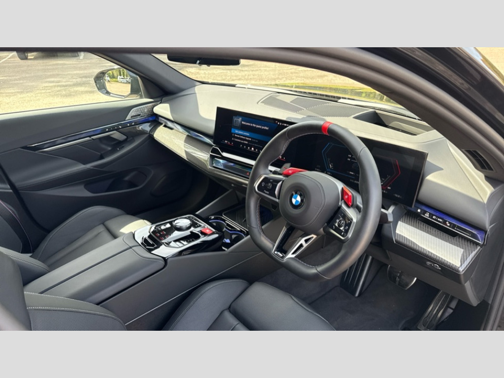 BMW M5 M5 4dr DCT Active Guard, Automatic operation of tailgate with remote opening and closing, Bluetooth Wi-Fi interface, BMW Iconic sounds electric, BMW interaction bar, BMW legal emergency call, BMW Live Cockpit Professional with head up display with driver profile,4G LTE connectivity,augmented view,full colour head-up display, BMW Teleservices, Connected drive services, Driving Assistant Plus Preparation, Flat tyre monitor, M Servotronic steering, Oil sensor for level and grade, On board computer (OBC) includes average speed, fuel consumption and range, journey computer, outside temperature display, personal profile functions, Service interval indicator, AC Fast charging preparation (Maximum charging power 11kW), Adaptive M Suspension with electronically controlled dampers and integral active steering, BMW xDrive system, Charging cable professional (mode 3) for public charging (up to 22 kW), M Drive professional with M track mode,M laptimer,dynamic and dynamic plus,boost control, M Sport differential, Bowers and Wilkins surround sound system, DAB radio, Wireless charging with smartphone storage tray, Adaptive LED Headlights, Auto dimming door mirrors, BMW Iconic glow kidney grille, Body coloured bumpers, Electric front and rear windows with fingertip open/close + anti-trap all round and comfort closing function, Fixed panoramic sunroof with electric sunblind, Heated windscreen washer jets, High beam assistant, High level LED brake light, Interior rear view electrochromatic mirror with automatic anti dazzle function, LED daytime running lights, M lights shadowline, M specific electrically adjustable/foldable/heated exterior mirrors with integrated direction indicators, Rain sensor including auto headlights activation, Rear boot, Rear side hinged doors, Sun protection glass, 12V power sockets 2 x rear, 1 x luggage compartment (additional 1 X double USB adaptor with 2A charging current), 3 seat bench in 2nd row, 4 zone control automatic air conditioning, Ambient lighting in front and rear doors, Armrest - front and rear integrated door trim, centre console includes storage compartment, rear centre includes 2 cupholders, Child seat ISOFIX attachment with rear outer seats includes top tether, Driver and front passenger lumbar support, Electric seat adjustment with memory, Floor mats in velour, Glove Compartment with light, Headrests for all seats, Height and length electric adjustment steering column, M multifunctional seats driver and front passenger with and illuminated M5 logo headrests, M steering wheel with paddle shift, Multifunction controls for leather steering wheel, Single front passenger seat, Steering wheel heating, Through loading system with 40/20/40 split folding rear seat, Connected package professional - M5, Exterior design pack - M5, M high gloss Shadowline exterior trim pack - M5, M high gloss shadowline with extended contents pack - M5, Parking assistant plus pack with anti travel recorder - M5, Acoustic protection for pedestrians, Airbag deployment is controlled with respect to the intensity and scope, Anti lock braking system (ABS) with cornering brake control, Automatic door lock when driving away, Brake assist function, Child locks, Crash sensor for activation of hazard warning lights, Driver and front passenger airbags, Driver central airbag, DSC - Dynamic Stability Control, Electromechanical parking brake with automatic drive away release and auto hold function, Emergency brake assist, Head airbags, M Sport seatbelts, PC iBrake PostCrash approah collision warning with braking function, Side airbags for driver and front passenger, Side impact protection, Three inertia reel rear seatbelts, Trailer stability control, Tyre pressure monitoring system, Warning triangle and first aid kit, Alarm system for monitoring doors, engine compartment,interior movement sensor,tilt sensor and siren with emergency power supply, Automatic door locking, Comfort access system with BMW digital key plus,digital key card,smartphone as vehicle key,smart opening/closing,gesturing tailgate,light staging, Interior camera, Locking wheel bolts, Tyre repair kit