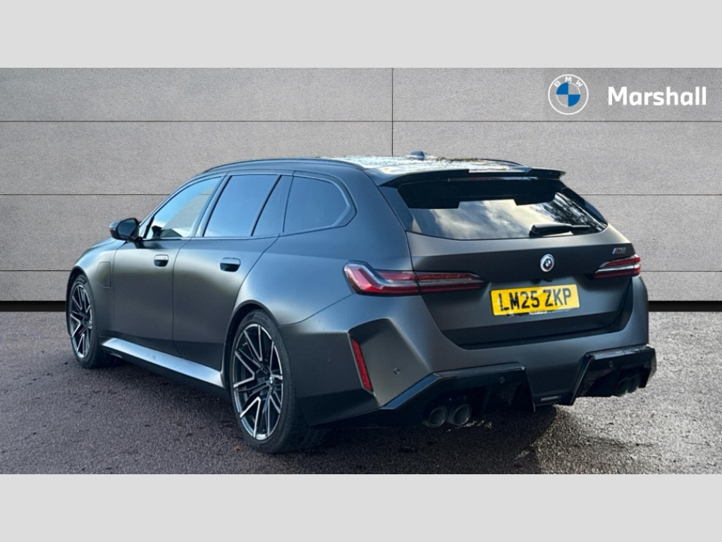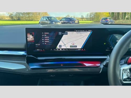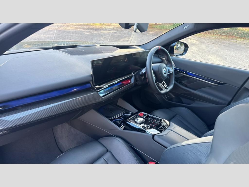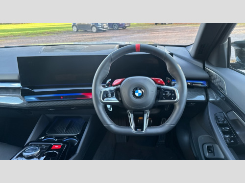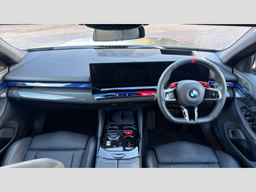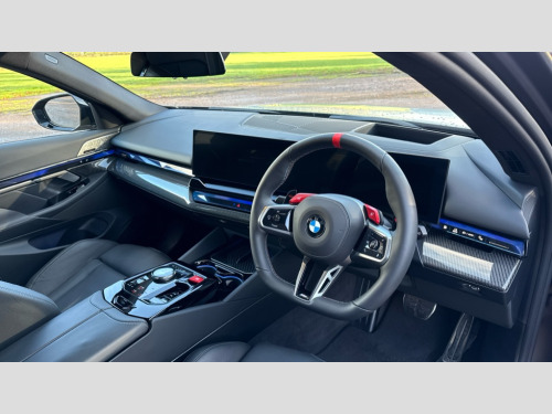 BMW M5 M5 5dr DCT Active Guard, Automatic operation of tailgate with remote opening and closing, Bluetooth Wi-Fi interface, BMW Iconic sounds electric, BMW interaction bar, BMW legal emergency call, BMW Live Cockpit Professional with head up display with driver profile,4G LTE connectivity,augmented view,full colour head-up display, BMW Teleservices, Connected drive services, Driving Assistant Plus Preparation, Flat tyre monitor, M Servotronic steering, Oil sensor for level and grade, On board computer (OBC) includes average speed, fuel consumption and range, journey computer, outside temperature display, personal profile functions, Personal e-SIM, Service interval indicator, AC Fast charging preparation (Maximum charging power 11kW), Adaptive M Suspension with electronically controlled dampers and integral active steering, BMW xDrive system, Charging cable professional (mode 3) for public charging (up to 22 kW), M Drive professional with M track mode,M laptimer,dynamic and dynamic plus,boost control, M Sport differential, Bowers and Wilkins surround sound system, DAB radio, Wireless charging with smartphone storage tray, Adaptive LED Headlights, Auto dimming door mirrors, Black contrast roof, BMW Iconic glow kidney grille, Body coloured bumpers, Electric front and rear windows with fingertip open/close + anti-trap all round and comfort closing function, Heated windscreen washer jets, High beam assistant, High level LED brake light, Interior rear view electrochromatic mirror with automatic anti dazzle function, LED daytime running lights, M lights shadowline, M specific electrically adjustable/foldable/heated exterior mirrors with integrated direction indicators, Rain sensor including auto headlights activation, Rear side hinged doors, Rear wiper, Sun protection glass, 12V power sockets 2 x rear, 1 x luggage compartment (additional 1 X double USB adaptor with 2A charging current), 3 seat bench in 2nd row, 4 zone control automatic air conditioning, Ambient lighting in front and rear doors, Armrest - front and rear integrated door trim, centre console includes storage compartment, rear centre includes 2 cupholders, Child seat ISOFIX attachment with rear outer seats includes top tether, Driver and front passenger lumbar support, Electric seat adjustment with memory, Floor mats in velour, Glove Compartment with light, Headrests for all seats, Height and length electric adjustment steering column, High-gloss black door switch cluster, power window switch and tailgate button on first and second row seat, M multifunctional seats driver and front passenger with and illuminated M5 logo headrests, M steering wheel with paddle shift, Multifunction controls for leather steering wheel, Single front passenger seat, Steering wheel heating, Through loading system with 40/20/40 split folding rear seat, Connected package professional - M5, Exterior design pack - M5, M high gloss Shadowline exterior trim pack - M5, M high gloss shadowline with extended contents pack - M5, Parking assistant plus pack with anti travel recorder - M5, Acoustic protection for pedestrians, Airbag deployment is controlled with respect to the intensity and scope, Anti lock braking system (ABS) with cornering brake control, Automatic door lock when driving away, Brake assist function, Child locks, Crash sensor for activation of hazard warning lights, Driver and front passenger airbags, Driver central airbag, DSC - Dynamic Stability Control, Electromechanical parking brake with automatic drive away release and auto hold function, Emergency brake assist, Head airbags, M Sport seatbelts, PC iBrake PostCrash approah collision warning with braking function, Side airbags for driver and front passenger, Side impact protection, Three inertia reel rear seatbelts, Trailer stability control, Tyre pressure monitoring system, Warning triangle and first aid kit, Alarm system for monitoring doors, engine compartment,interior movement sensor,tilt sensor and siren with emergency power supply, Automatic door locking, Comfort access system with BMW digital key plus,digital key card,smartphone as vehicle key,smart opening/closing,gesturing tailgate,light staging, Interior camera, Locking wheel bolts, Tyre repair kit