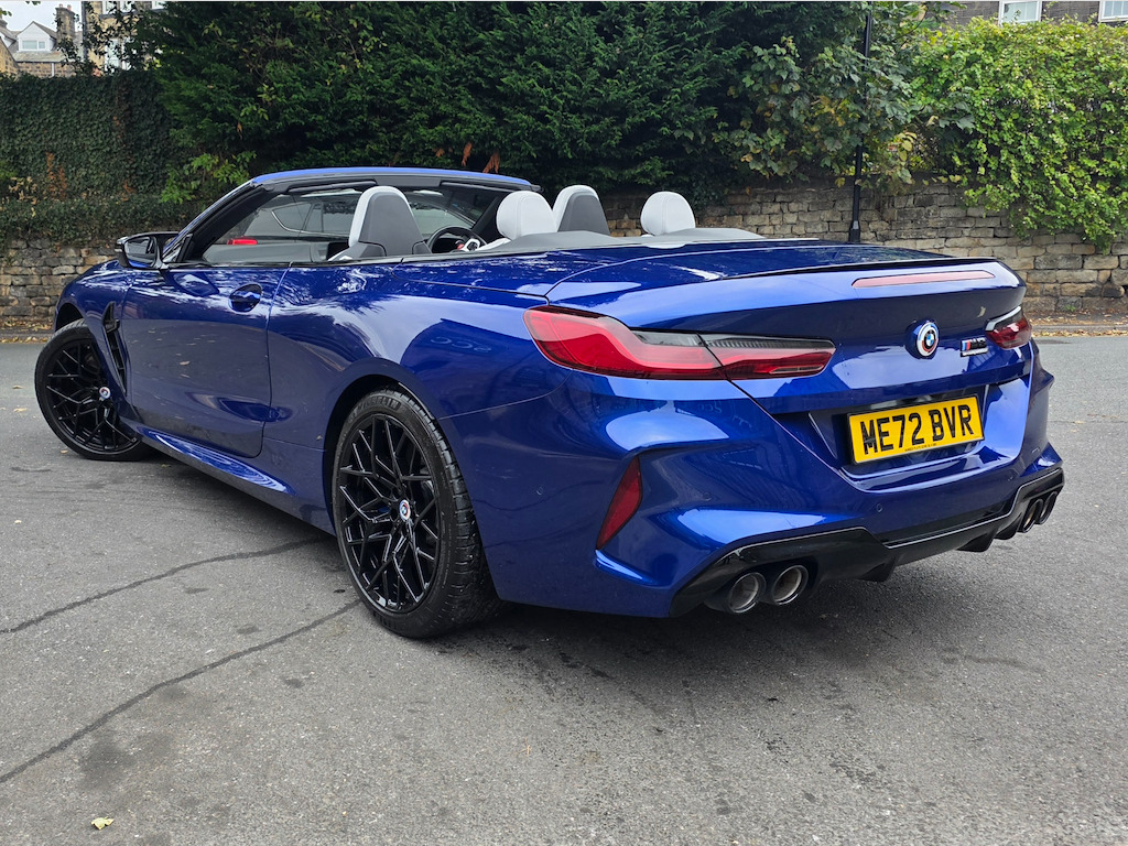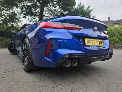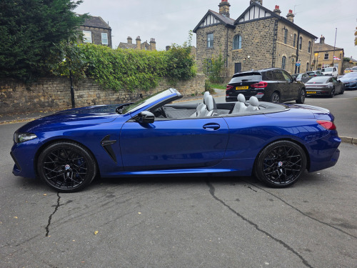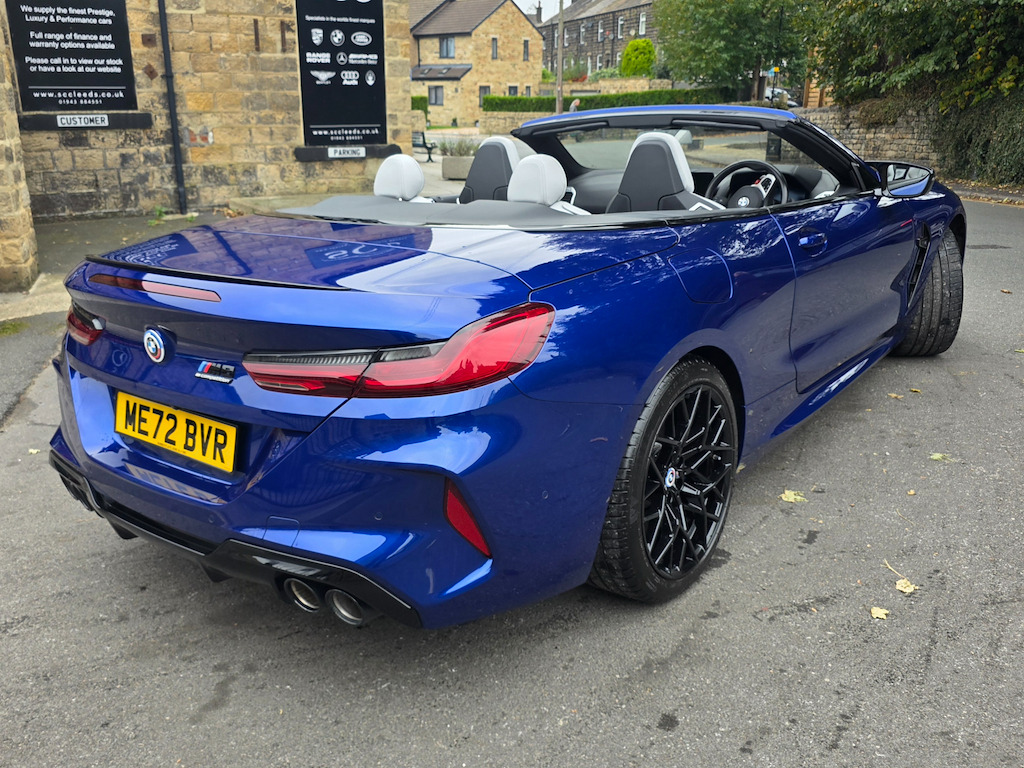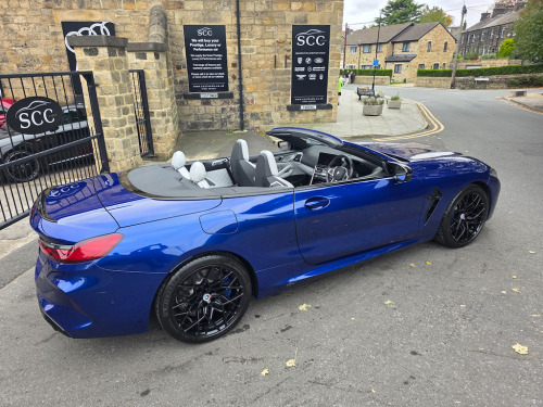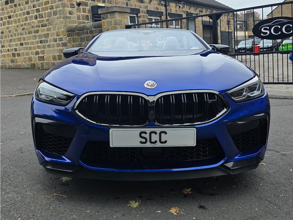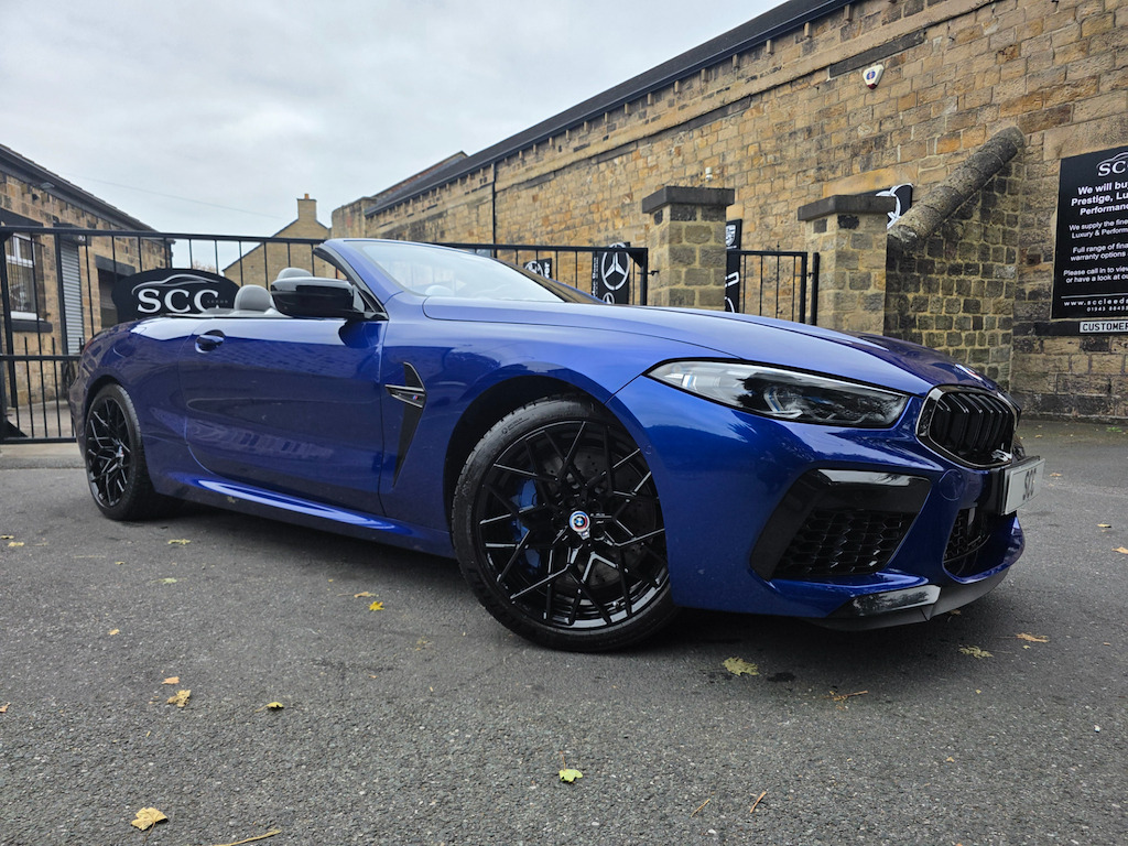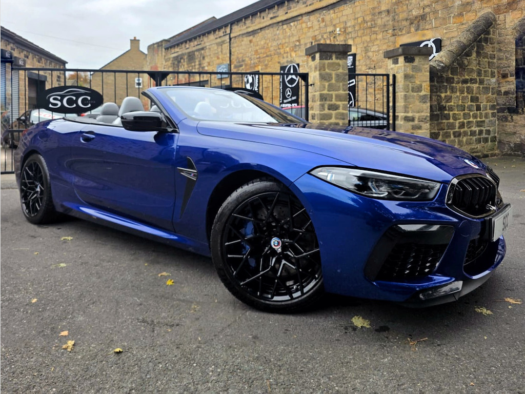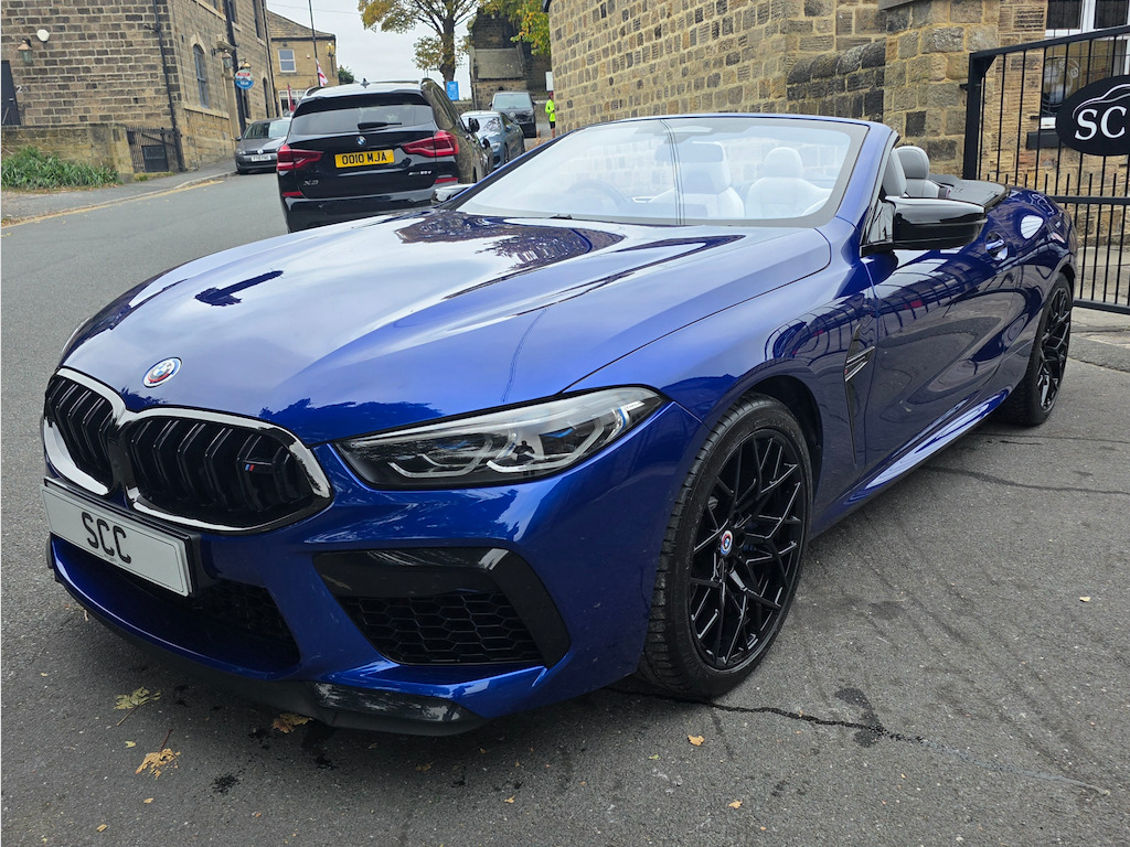 BMW M8 Convertible – 1 Owner | 4.4L V8 | 616 BHP | £69,995 Introducing the stunning, one-owner BMW M8 Convertible – the perfect blend of breathtaking performance and refined luxury. Priced at £69,995, this exceptional machine is powered by a 4.4L twin-turbo V8 producing an exhilarating 616 BHP, paired with a smooth 8-speed automatic transmission. With just 16,895 miles and one previous owner, this M8 is presented in outstanding condition and is ready to deliver an unforgettable driving experience. Key Features: BMW M 50 Year Badges – celebrating half a century of BMW M heritage. Full Merino Leather Upholstery in Silverstone with Black interior – combining ultimate comfort with exquisite craftsmanship. Comfort Plus Package – designed to make every journey effortless and luxurious. Technology Plus Pack – advanced driver assistance, connectivity, and safety systems at your fingertips. Adaptive M Suspension – delivers superb handling, balance, and control on any road. Exterior & Performance Highlights: 20" M Light Star-Spoke 813M Bicolour Alloy Wheels with mixed tyres. Marina Bay Blue Metallic Paint – a truly eye-catching finish that enhances its muscular lines. M Compound Brakes with high-gloss blue calipers – offering superior braking performance and visual impact. Why Choose This BMW M8: A rare opportunity to own a meticulously maintained, high-performance convertible that embodies BMW’s motorsport DNA. Combining raw power, intelligent technology, and elegant design, this M8 is as thrilling to drive as it is to behold. Contact SCC Leeds on 01943 884551 today to arrange your viewing or test drive – and experience the exhilaration of the BMW M8 Convertible for yourself. 12V Power Sockets,20in Alloy Wheels - M Light Star-Spoke Style 813 M Bicolour with Mixed Tyres,ABS - Anti Lock Braking System,Active Protection,Adaptive M Suspension,Air Conditioning Automatic with Two-Zone Control,Airbags - Driver and Front Passenger,Airbags - Passenger Deactivation - Via Key,Airbags - Side - Driver and Passenger,Alarm System,Ambient Light,Armrest - Front,Automatic Operation of Tailgate,BMW Connected Package Professional,BMW ConnectedDrive Services,BMW Emergency Call,BMW Live Cockpit Professional,BMW TeleServices,Brake Assist,Brake Pad Wear Indicator,Brake System,Bumper System,Carbon Core,Central Locking Switch,Check Control,Climate Comfort Windscreen,Closing System with Central Locking,Comfort Access System,Condition Based Service,Crash Sensor,Cruise Control with Brake Function,Cup Holders - Front x2,DAB Tuner,Door Sill Strips,Double-Wishbone Front Axle,Driving Assistant,Dynamic Brake Lights,Electric Windows - Front,Electro-Mechanical Parking Brake with Auto-Hold Function,Electronic Vehicle Immobiliser,Enhanced Bluetooth with Wireless Charging,Entry Lights - Front Doors,Exhaust Tailpipes with Finishers - Left and Right,Exterior Items,Exterior Mirrors - Folding - Heated - Electrically Adjustable,Exterior Trim - Extended High-Gloss Shadowline,Favourite Buttons,Floor Mats - Velour,Follow Me Home Headlight Function,Front Ornamental Grille with Kidney Grille Bars,Glove Compartment - Lockable with Light,Handle-Area Lighting,Hands-Free Facility with USB Interface,Harman-Kardon Surround Sound Audio System,Head Airbags - For First and Second Row Seats,Headlights - Adaptive LED,Headrests - Active Front,Heat Protection - Sun Protection Glazing,High-Beam Assistant,Instrument Panel and Door Upper Trim Panels,Integrated Owners Handbook,Interior Lighting,Interior Mirror - Frameless,Interior Trim - Carbon Fibre,Keyless Start,Knee Airbag - For Driver and Front Passenger,Lashing Eyelets in Luggage Compartment,Lights-On Warning,Locking Wheel Bolts,Luggage Compartment - Light,Lumbar Support - Driver and Front Passenger,M Compound Brakes with Red High Gloss,M High-Gloss Shadowline,M Rear Spoiler,M Seat Belts,M Servotronic,M Sport Differential,M Sport Exhaust System,M Sport Leather Multifunction Steering Wheel with Gearshift Paddles,Microfilter and Active Carbon Filter,Model Logo,Oil Sensor For Level and Grade,Parking Assistant Plus,Personal Profile,Rain Sensor and Automatic Driving Lights Control,Rear Lights - LED,Rear Window - Glass - Heated,Seat Heating for Driver and Front Passenger,Seats - 50-50 Split Folding Rear,Side Impact Protection,Soft Close Doors,Soft-Top - Fully Automatic and Lined - Black,Speed Limiter,Standard Seats - Driver and Front Passenger - Sport,Start-Stop Button - Red,Steering Column Adjustment - Infinitely Variable in Height and Length,Storage Options,Sun Visors with Illuminated Vanity Mirrors and Ticket Holder,TPMS - Tyre Pressure Monitoring System,Tailgate,Third Brake Light,Three-Point Seat Belts,Two Tone Horn,Tyre Repair Kit,Vehicle Key,Warm Air Collar,Warning Triangle,Welcome Light,WiFi Hotspot,Wind Deflector,Windscreen Washer Jets - Heated,iDrive Controller,BMW M 50 Year Badges,Comfort Plus Package,Full Merino Leather - Silverstone with Black Interior,M Compound Brake - Blue Calipers in High Gloss,Marina Bay Blue,Technology Plus Pack,Visibility Pack