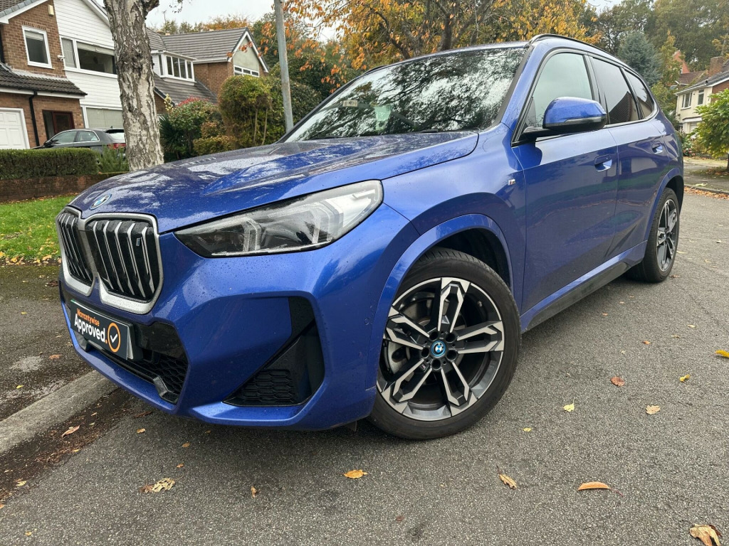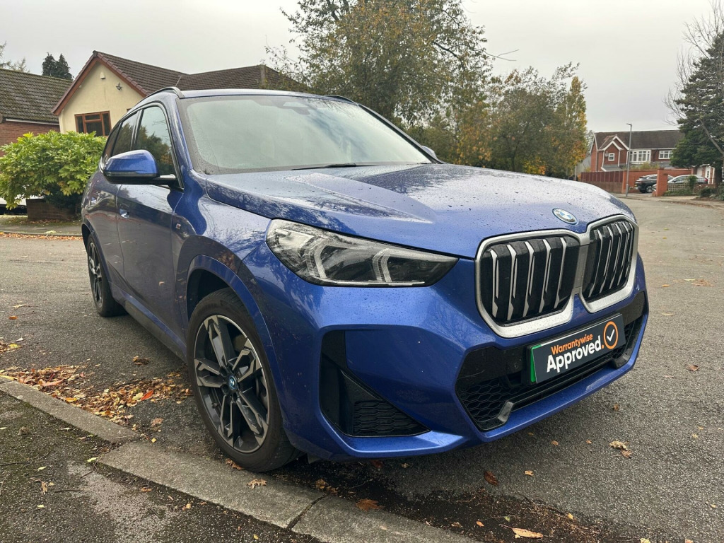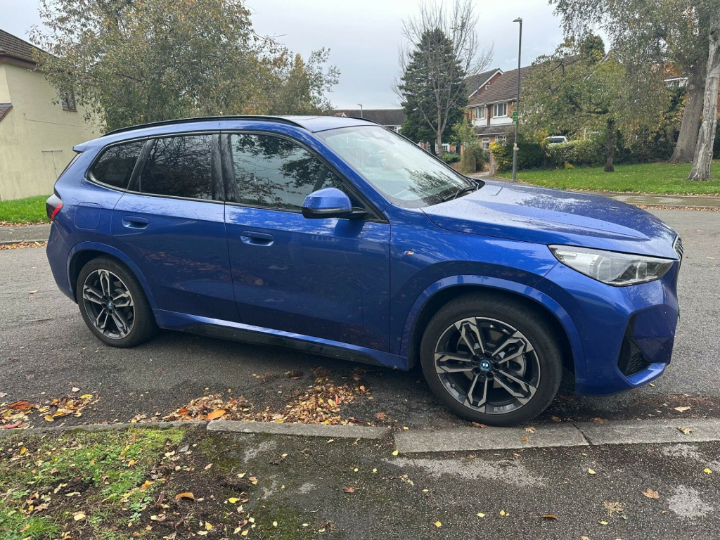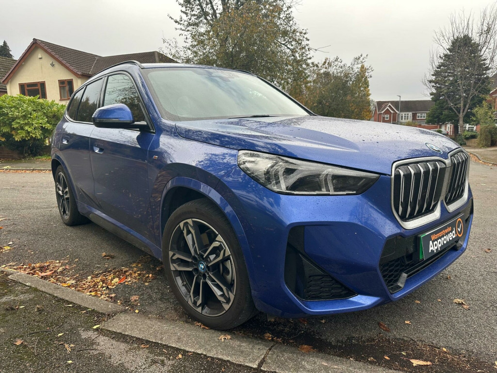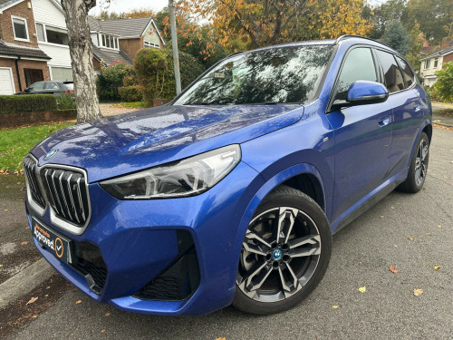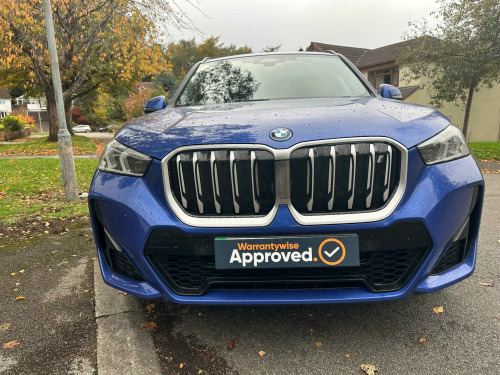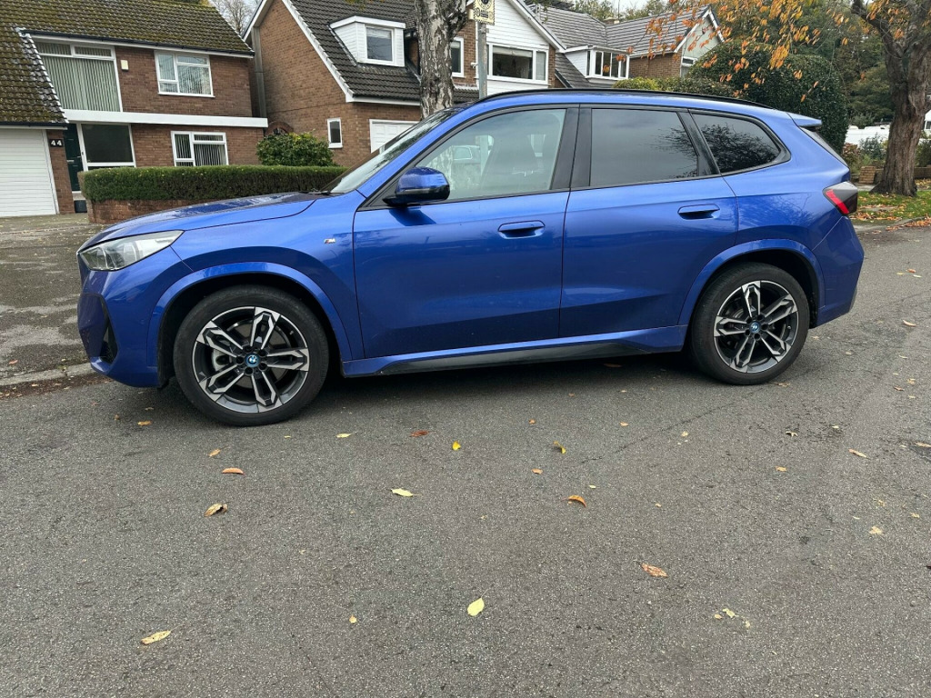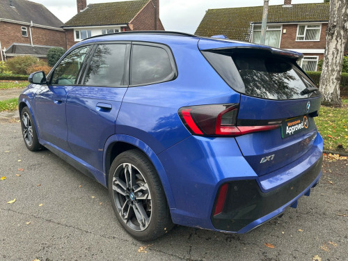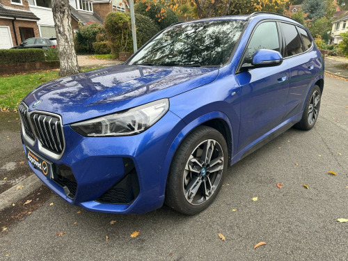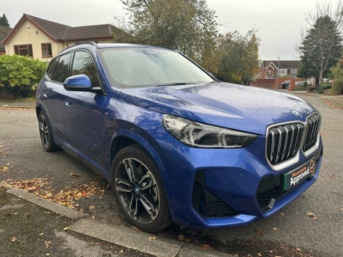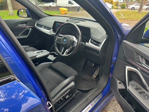 This 2023 BMW iX1 30 M Sport is a superb example, having had only one owner since new. This electric, four wheel drive SUV offers a compelling blend of performance and practicality. It boasts a 67 kWh battery providing a maximum range of 272 miles, with a full charge at home taking approximately 9 hours and 10 minutes using a 7kW charger. For quicker top ups, it can reach 80% charge in just 32 minutes at a public charging station. The M Sport trim enhances its appeal with a Panoramic Glass Sunroof, Active Seat Driver functionality, and the BMW Live Cockpit Plus with Bluetooth connectivity. Further enhancing the driving experience are the Technology Package, which includes automatic LED headlights, keyless entry, and wireless phone charging, alongside a rain sensor for automatic headlight activation.The BMW iX1 30 M Sport stands out with its impressive acceleration, reaching 0-62mph in a swift 5.6 seconds, demonstrating its dynamic capabilities. This performance, combined with its electric drivetrain, positions it favourably against comparable vehicles. The generous boot space ensures ample room for luggage or shopping, making it a practical choice for families and everyday use. The inclusion of features like the opening panoramic sunroof and the advanced BMW Live Cockpit Plus further elevate its desirability, offering a refined and connected driving environment. noramic glass sunroof, sun protection glass, active seat driver, alcantara-sensatec - black with blue contrast stitching, 19in alloy wheels - m double-spoke - bicolour - 871, 3 upper retaining strap clips, abs - anti lock braking system including cbc - cornering brake control, active guard, air conditioning automatic with two-zone control, airbags, alarm system, attentiveness assistant, automatic tailgate, bmw emergency call, bmw iconic sounds - electric, bmw live cockpit plus, bmw online services, bmw teleservices, bmw idrive, brake system, child seat i-size attachment for front passenger, closing system with central locking, condition based service, connected package professional, connecteddrive services, dab digital radio, dsc - dynamic stability control - stabilises the vehicle in extreme situations - controls traction, door exit lights, door mirrors - electrically adjustable and heated, dynamic brake lights, electric windows, exterior items, exterior trim - high-gloss shadowline, fast charging cable - professional - mode 3 for public charging, flat air vents on instrument panel in black high-gloss - adjustable slats with elements in pearl chrome, flexible charger - mode 2, floor mats - velour, footrest and pedals in black plastic, front armrest with integrated control panel, front centre console trim in black high-gloss, gear selector switch with toggle operation, grab handles x4, headlining - m anthracite, home lights, interior lighting, interior trim finishers - dark aluminium hexacube, led number plate light, locking wheel bolts, luggage compartment, luxury instrument panel, m adaptive suspension, m sport leather steering wheel, m sport package, my modes, parking assistant, performance control, power sockets, rain sensor with automatic headlight activation, rear armrest integrated in door trim panel, rear backrest with 40-20-40 folding, rear seat headrests - three, rear window heating, recovery system, roof rails - high-gloss shadowline m, seat heating for driver and front passenger, servotronic steering, speaker system, speed limiter, sport seats - front, storage options, sun visors with illuminated vanity mirror, tpms - tyre pressure monitoring system, technology package, third brake light, three-point seat belts - all seats, tyre repair kit, warning triangle, welcome lighting, widescreen display, windscreen wiper - front with heated washer nozzles and rear, windshield washer nozzle for rear view camera, edrive exterior sound, i-size isofix attachment points on both outer rear seats with covers in black, idrive controller