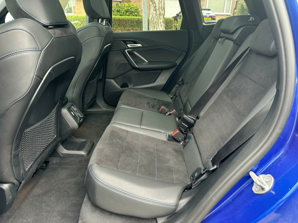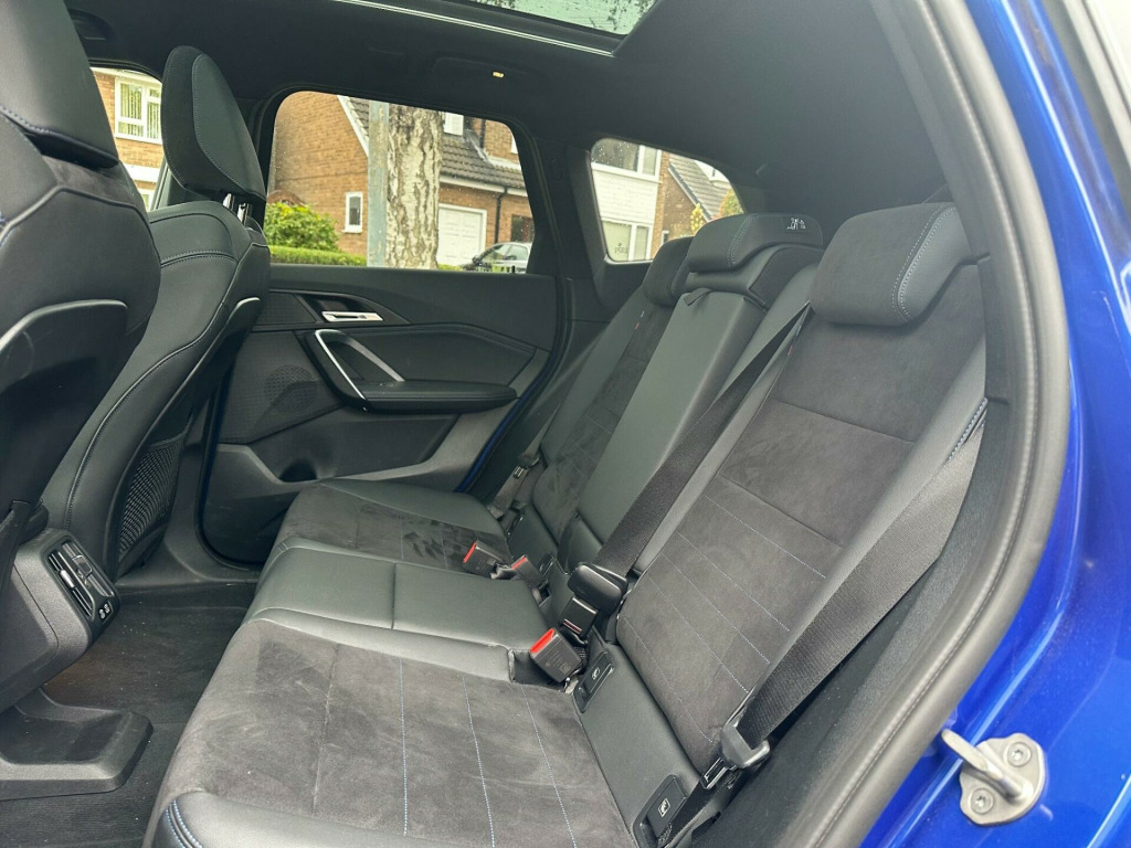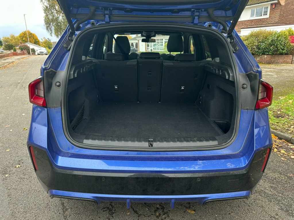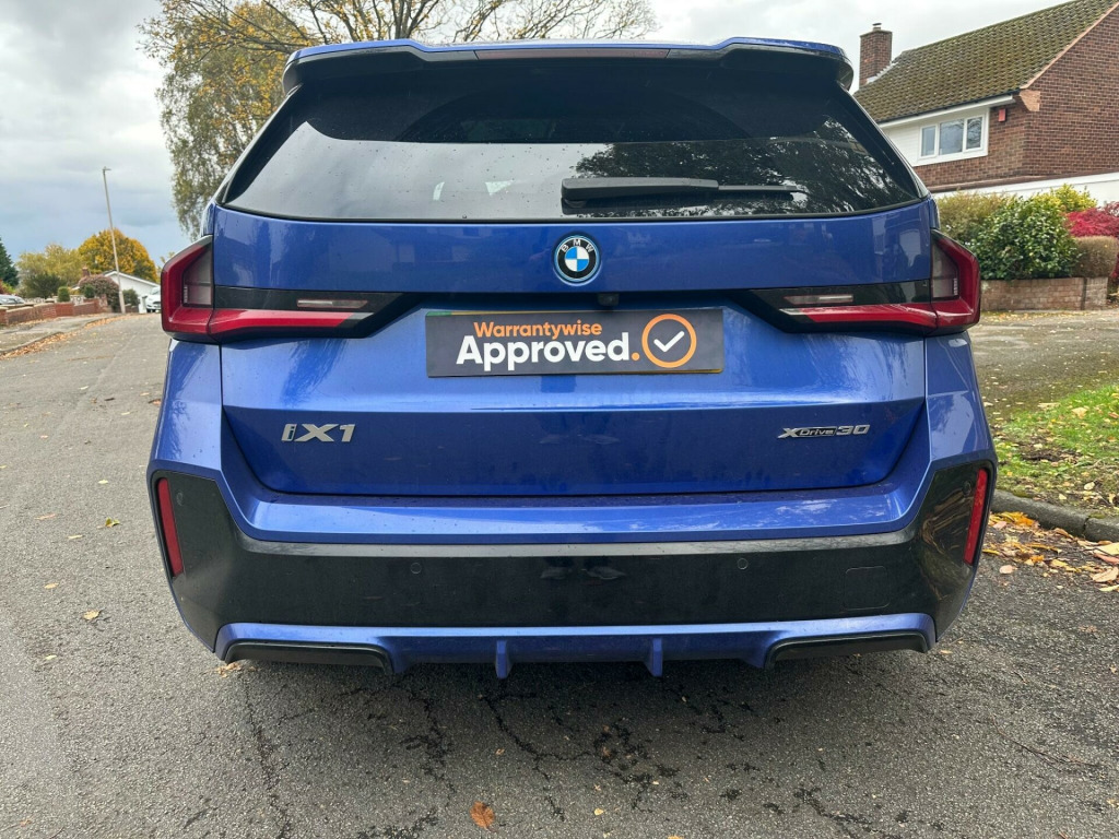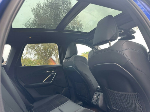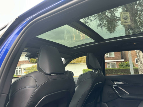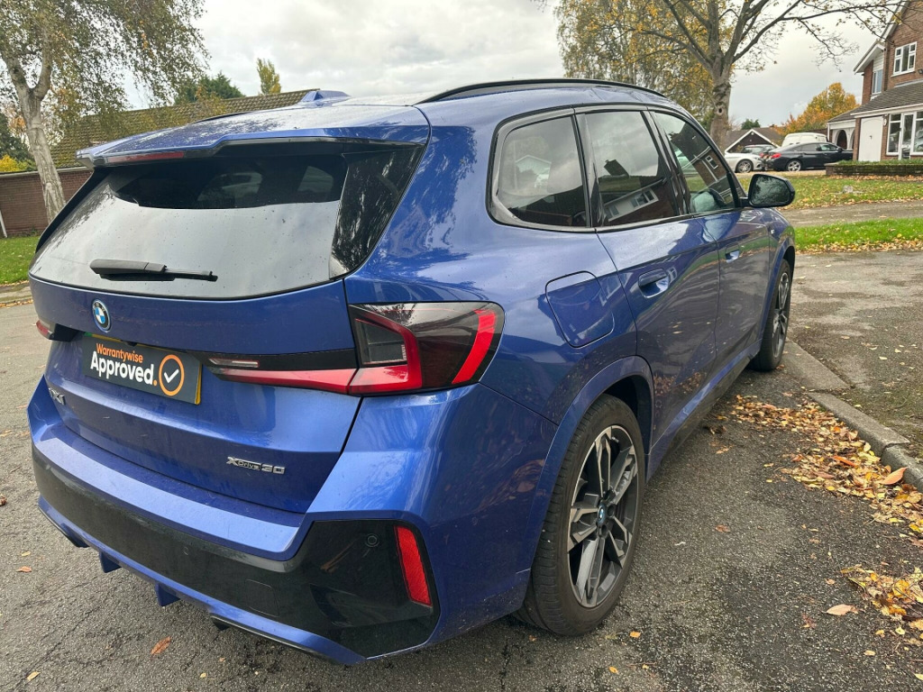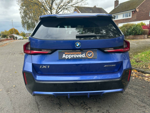 This 2023 BMW iX1 30 M Sport is a superb example, having had only one owner since new. This electric, four wheel drive SUV offers a compelling blend of performance and practicality. It boasts a 67 kWh battery providing a maximum range of 272 miles, with a full charge at home taking approximately 9 hours and 10 minutes using a 7kW charger. For quicker top ups, it can reach 80% charge in just 32 minutes at a public charging station. The M Sport trim enhances its appeal with a Panoramic Glass Sunroof, Active Seat Driver functionality, and the BMW Live Cockpit Plus with Bluetooth connectivity. Further enhancing the driving experience are the Technology Package, which includes automatic LED headlights, keyless entry, and wireless phone charging, alongside a rain sensor for automatic headlight activation.The BMW iX1 30 M Sport stands out with its impressive acceleration, reaching 0-62mph in a swift 5.6 seconds, demonstrating its dynamic capabilities. This performance, combined with its electric drivetrain, positions it favourably against comparable vehicles. The generous boot space ensures ample room for luggage or shopping, making it a practical choice for families and everyday use. The inclusion of features like the opening panoramic sunroof and the advanced BMW Live Cockpit Plus further elevate its desirability, offering a refined and connected driving environment. noramic glass sunroof, sun protection glass, active seat driver, alcantara-sensatec - black with blue contrast stitching, 19in alloy wheels - m double-spoke - bicolour - 871, 3 upper retaining strap clips, abs - anti lock braking system including cbc - cornering brake control, active guard, air conditioning automatic with two-zone control, airbags, alarm system, attentiveness assistant, automatic tailgate, bmw emergency call, bmw iconic sounds - electric, bmw live cockpit plus, bmw online services, bmw teleservices, bmw idrive, brake system, child seat i-size attachment for front passenger, closing system with central locking, condition based service, connected package professional, connecteddrive services, dab digital radio, dsc - dynamic stability control - stabilises the vehicle in extreme situations - controls traction, door exit lights, door mirrors - electrically adjustable and heated, dynamic brake lights, electric windows, exterior items, exterior trim - high-gloss shadowline, fast charging cable - professional - mode 3 for public charging, flat air vents on instrument panel in black high-gloss - adjustable slats with elements in pearl chrome, flexible charger - mode 2, floor mats - velour, footrest and pedals in black plastic, front armrest with integrated control panel, front centre console trim in black high-gloss, gear selector switch with toggle operation, grab handles x4, headlining - m anthracite, home lights, interior lighting, interior trim finishers - dark aluminium hexacube, led number plate light, locking wheel bolts, luggage compartment, luxury instrument panel, m adaptive suspension, m sport leather steering wheel, m sport package, my modes, parking assistant, performance control, power sockets, rain sensor with automatic headlight activation, rear armrest integrated in door trim panel, rear backrest with 40-20-40 folding, rear seat headrests - three, rear window heating, recovery system, roof rails - high-gloss shadowline m, seat heating for driver and front passenger, servotronic steering, speaker system, speed limiter, sport seats - front, storage options, sun visors with illuminated vanity mirror, tpms - tyre pressure monitoring system, technology package, third brake light, three-point seat belts - all seats, tyre repair kit, warning triangle, welcome lighting, widescreen display, windscreen wiper - front with heated washer nozzles and rear, windshield washer nozzle for rear view camera, edrive exterior sound, i-size isofix attachment points on both outer rear seats with covers in black, idrive controller