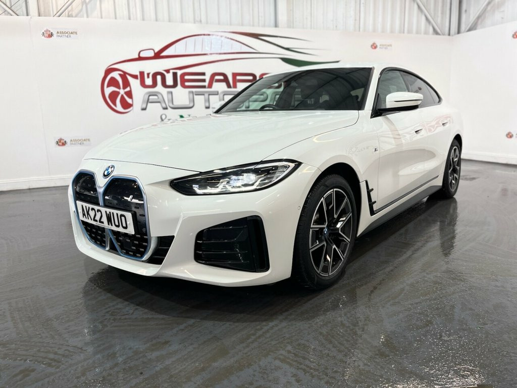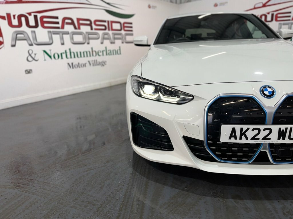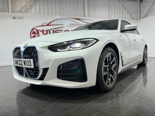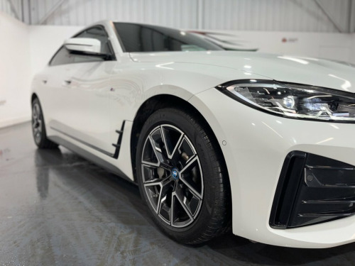 BMW i4 40 83.9kWh M Sport Gran Coupé 5dr Electric Auto eDrive (340ps). One-owner car supplied with two keys and a BMW iDrive service history recorded at 16,000 miles. This car also has 5 years remaining BMW warranty on the battery. This impressive i4 M Sport combines dynamic performance and premium comfort with all-electric efficiency, delivering 340ps through BMW's eDrive system. The high specification includes 18" alloy wheels, digital dashboard, cruise control, front and rear parking sensors, automatic headlights and wipers, privacy glass, electric power tailgate, Apple CarPlay, Android Auto, satellite navigation, climate control, front and rear heated seats, heated steering wheel, USB connection and Bluetooth connectivity. A superb one-owner example offering luxury, technology and powerful all-electric performance in an elegant Gran Coupé body. 12V Power Socket - Front, 12V Power Socket - Luggage Compartment, 18in Alloy Wheels - M Aerodynamic 858 M , 2x USB Type C in Front Centre Console, 2x USB Type C in Rear Centre Console, ABS - Anti Lock Braking System, Active Guard Plus, Active Protection, Air Conditioning - Automatic, Airbags - Driver - Front Passenger - Fro, Airbags - Head - Front and Rear, Alarm System, Ambient Lighting, Armrest in the Centre Console with Stora, Attentiveness Assistant, Automatic Operation of Tailgate, Automatic Start-Stop Button, Automatically Dimming Rear View Mirror, BMW Badge on Bonnet and Tailgate with Bl, BMW Connected Package Professional, BMW ConnectedDrive Online Services, BMW Emergency Call, BMW I