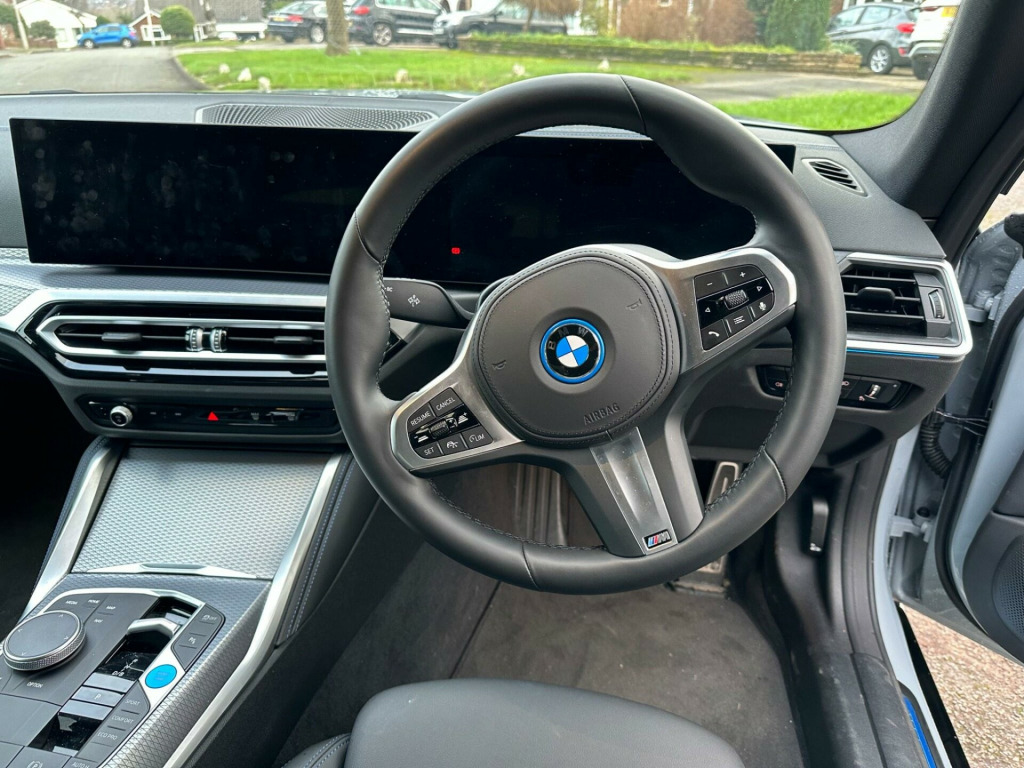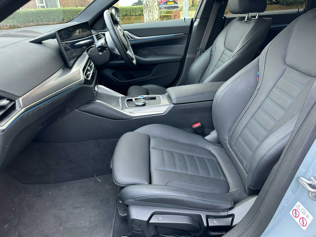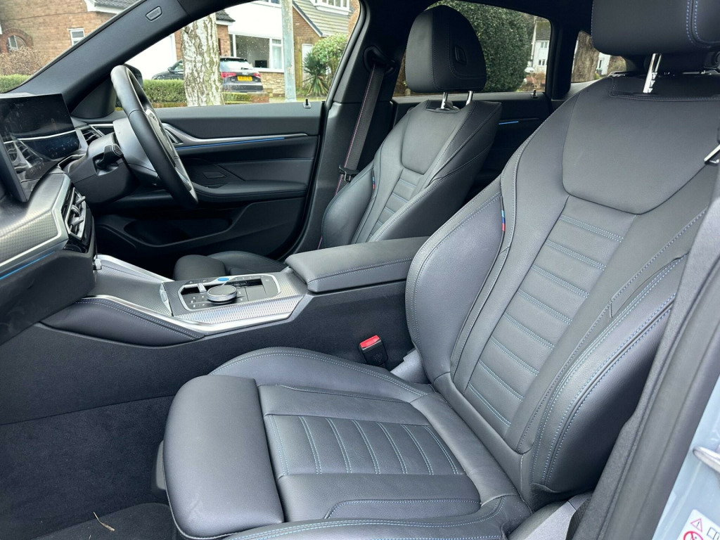 This 2023 BMW i4 40 M Sport is a remarkable example, having covered just 6000 miles and boasting a single owner from new. As a fully electric vehicle, it offers an impressive battery total capacity of 84 kWh, providing a maximum range of 352 miles when new. The M Sport trim enhances its appeal, and this particular model is equipped with luxurious Vernasca Leather in Black with Blue Contrast Stitching, heated front seats for added comfort, and convenient storage for wireless phone charging. Navigating tight spaces is made easier with the reversing assist camera, and all-around visibility is improved thanks to the bright LED headlights.The performance of this BMW i4 is truly noteworthy, with an acceleration of 0 to 62 miles per hour achieved in a swift 5.7 seconds, indicating a more dynamic driving experience compared to many other electric vehicles. Its charging capabilities are also a significant advantage, offering a full charge at home via a 7kW charger in approximately 12 hours and 30 minutes, or a rapid charge from empty to 80% in just 34 minutes at a public charging station. Furthermore, the generous boot space provides ample practicality for everyday use and longer journeys, making this i4 a compelling choice for those seeking a blend of performance, efficiency, and comfort. sport pro package, sun protection glass, storage for wireless charging, 19in alloy wheels - m light y-spoke style 859 m bicolour, m sport brakes with red calipers, model specific design elements, vernasca leather - black with blue contrast stitching, 12v power socket - front, 12v power socket - luggage compartment, 18in alloy wheels - m aerodynamic 858 m bicolour, 2x usb type c in front centre console, 2x usb type c in rear centre console, active guard plus, active protection, air conditioning - automatic, airbags, alarm system, ambient lighting, armrest in the centre console with storage compartment, attentiveness assistant, automatic operation of tailgate, automatic start-stop button, automatically dimming rear view mirror, bmw badge on bonnet and tailgate with blue ring around the badge, bmw connected package professional, bmw connecteddrive online services, bmw emergency call, bmw id, bmw iconic sounds - electric, bmw live cockpit plus, bmw radiator grille with mesh grille - nuggets in quartz silver matt, bmw teleservices, bmw i badge with blue highlight on front grille, bumper system, centre console rear storage compartment, centre lock switch, charging cable - mode 3, charging socket flap - rear right in body colour, closing system with central locking, condition based service, crash sensor, cruise control with brake function, cup holders in centre console - front - 2 cupholder inserts with clamping elements - inlay matt black, dab tuner, door pockets - front and rear, door sill strips - m sport entry sills, driving experience switch, electric windows - front and rear, electro mechanical parking brake, electronic vehicle immobiliser, exterior trim - high-gloss shadowline, flexible charger, floor mats - velour, folding side mirrors with auto-dimming, follow me home headlight function, front apron - plastic in body colour, glove compartment - illuminated, headlights - beam throw control, headlining - m anthracite, heated windscreen washer jets, integrated outside door handles - flush design - handle recess indirectly illuminated, interior lighting, interior trim - aluminium rhombicle anthracite interior trim, led headlights, led rear lights, lashing eyes in luggage compartment, luggage compartment lights, m aerodynamics package, m sport exterior styling, m sport leather steering wheel, m sport spoiler - gurney in body colour, model logo, one-piece front bumper cover including towing eye cover in body colour, parking assistant, preparation for high-beam assistant, preparation for active cruise control with stop and go function, radiator grille frame in chrome, rain sensor, rear bumper with blue accent, rear centre armrest including two cupholders, reversing assist camera, reversing light, roof fin in body colour, run-flat indicator, safety battery - terminal clamp, safety systems, seat backrest width adjustment - driver, seats - front heated, sensatec dashboard, servotronic, side armrests - front and rear integrated into door trim, side frame decorative moulding - black matt, smartphone integration, speed limiter, split folding rear seat, standard seat for driver and passenger with manual adjustment, standard suspension, steering column - adjustment, stereo speaker system, storage compartment in front of cupholder, storage tray and compartment with lid in centre console, sun visors with illuminated vanity mirrors and ticket holder, tpws - tyre pressure warning system, toolkit, tyre repair kit, warning triangle, welcome light, window recess finisher - black matt, edrive exterior sound, idrive controller