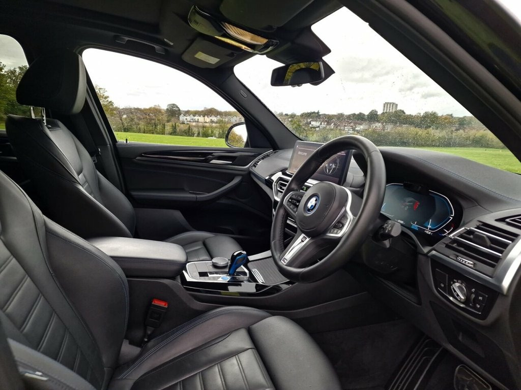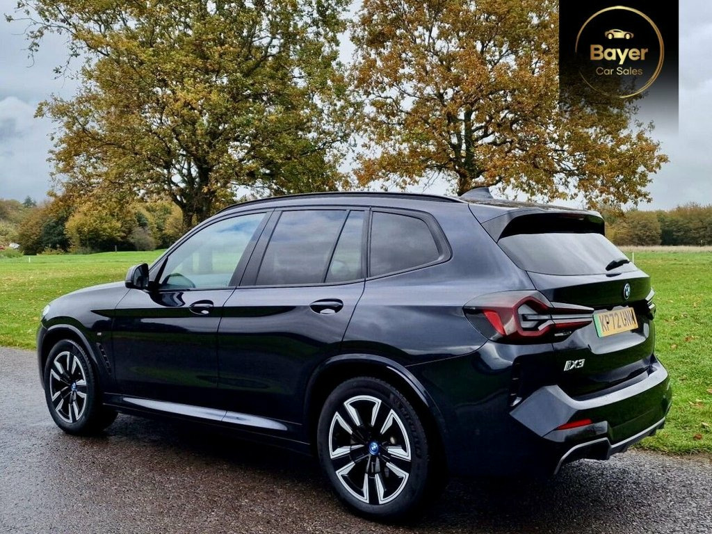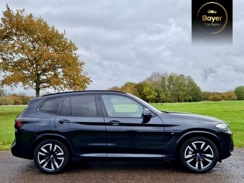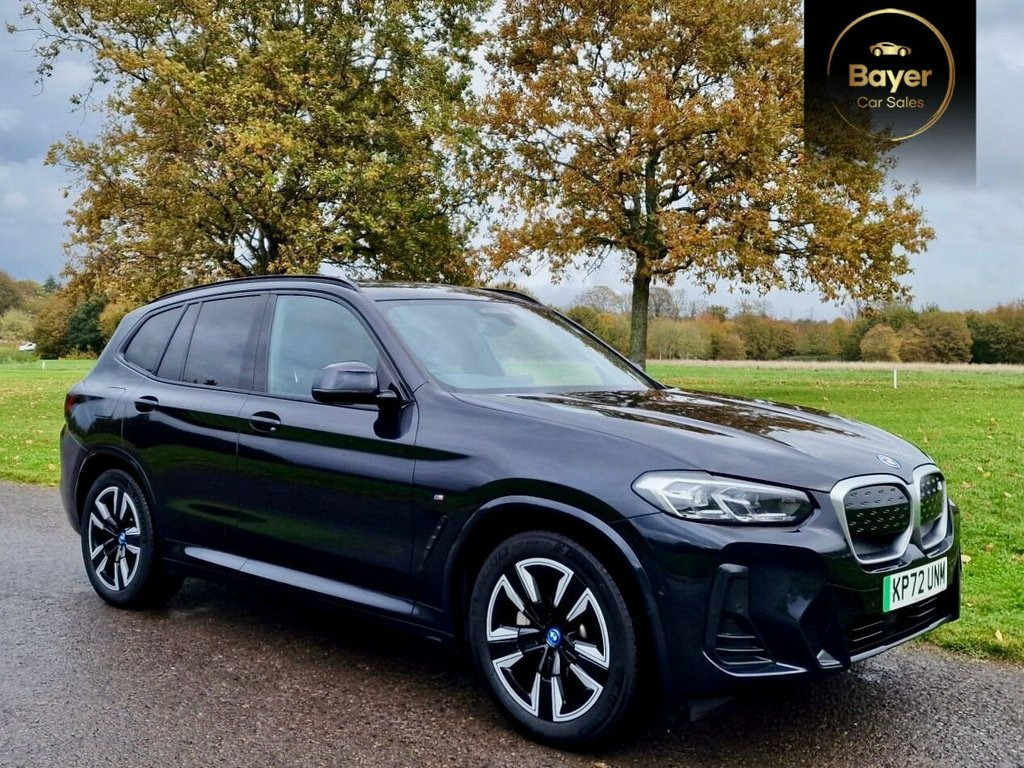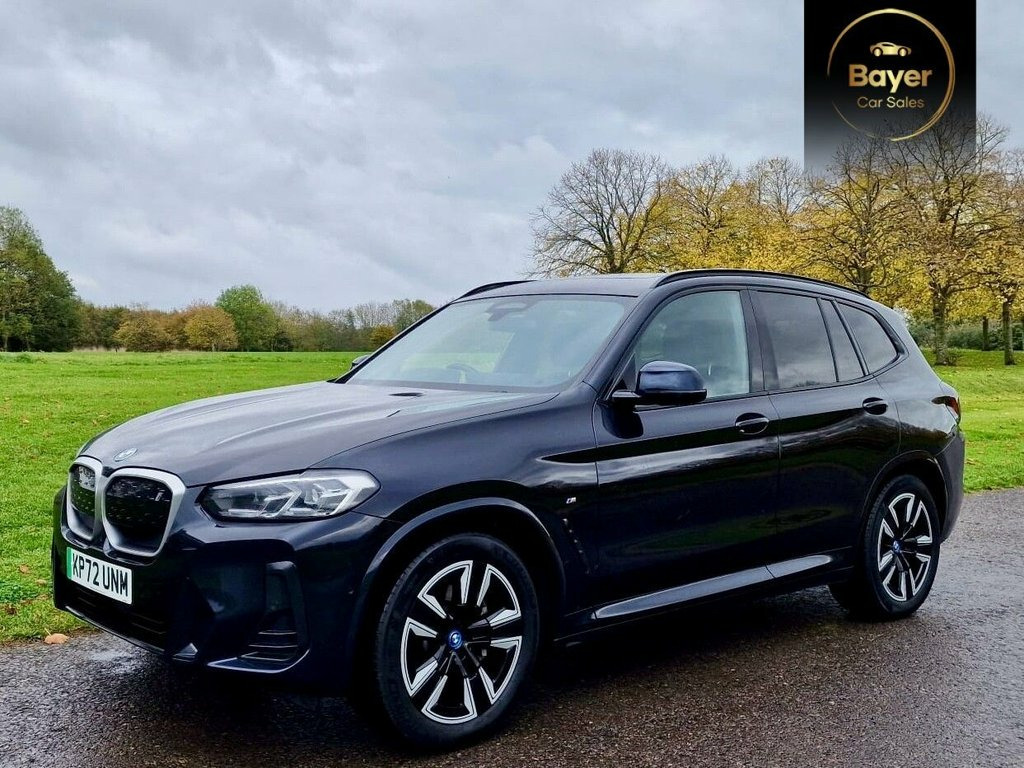 PANORAMIC ROOF, GREAT SPEC. VAT QUALIFYING This 2022 BMW iX3 M Sport is a superb example, having had only one owner since new. As an all electric vehicle, it offers a substantial battery total capacity of 80 kWh, providing a maximum range of 285 miles when new. This impressive electric SUV comes equipped with a suite of desirable features, including heated seats for both the driver and front passenger, front and rear parking sensors, and a reversing assist camera to aid manoeuvrability. The Rain Sensor with Automatic Headlight Activation ensures visibility is always optimised, while the BMW Live Cockpit Professional, complete with Bluetooth connectivity, keeps you informed and entertained. The electric powertrain of this iX3 M Sport is designed for both efficiency and convenience. A full charge at home using a 7kW charger takes approximately 11 hours and 20 minutes, perfect for overnight top ups. For faster charging on the go, it can reach 80% capacity from empty in just 32 minutes at a public charging station. These charging times, combined with its 285 mile maximum range, demonstrate how this BMW iX3 M Sport offers a compelling and practical electric driving experience, setting it apart from many other vehicles in its class. 19in Alloy Wheels - Aerodynamic - Jet Bl, ABS - Anti Lock Braking System, Active Guard Plus, Active Protection, Adaptive LED Headlights, Adaptive Suspension, Air Breather with BMW M logo, Air Conditioning - Automatic, Airbags - Driver and Front Passenger, Airbags - Front Side for Driver and Pass, Airbags - Head - Front and Rear, Alarm System, Ambient Lighting, Armrests, Attentiveness Assistant, Automatic Operation of Tailgate, Automatic Start-Stop Button, Backrest Width Adjustment for Driver, Blue Ring Around BMW Logos, BMW Connected Package Professional, BMW ConnectedDrive Online Services, BMW iDrive, BMW Legal Emergency Call, BMW Live Cockpit Professional, BMW TeleServices, Brake Pad Wear