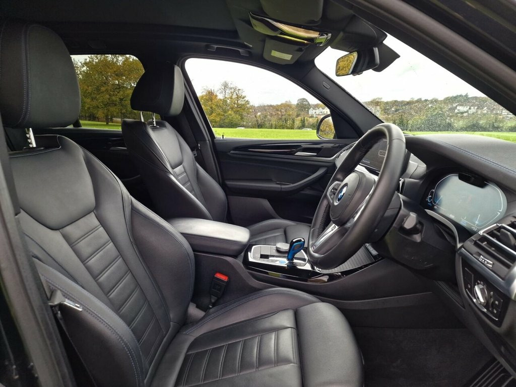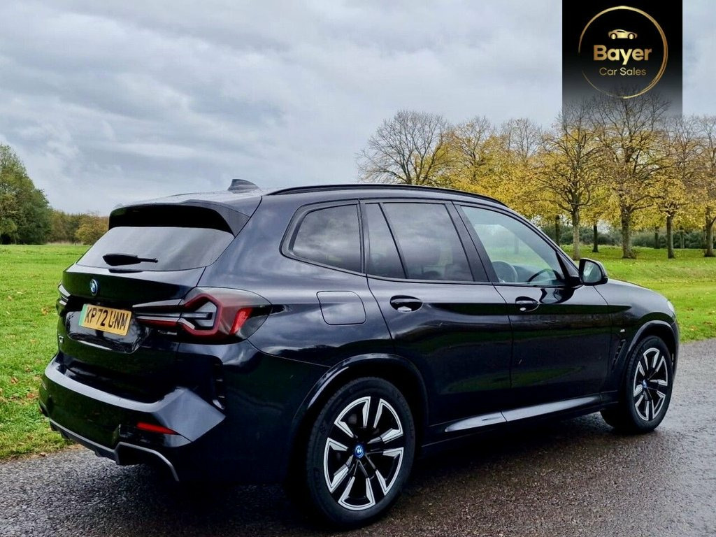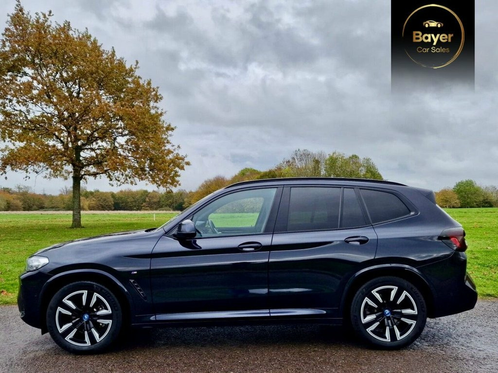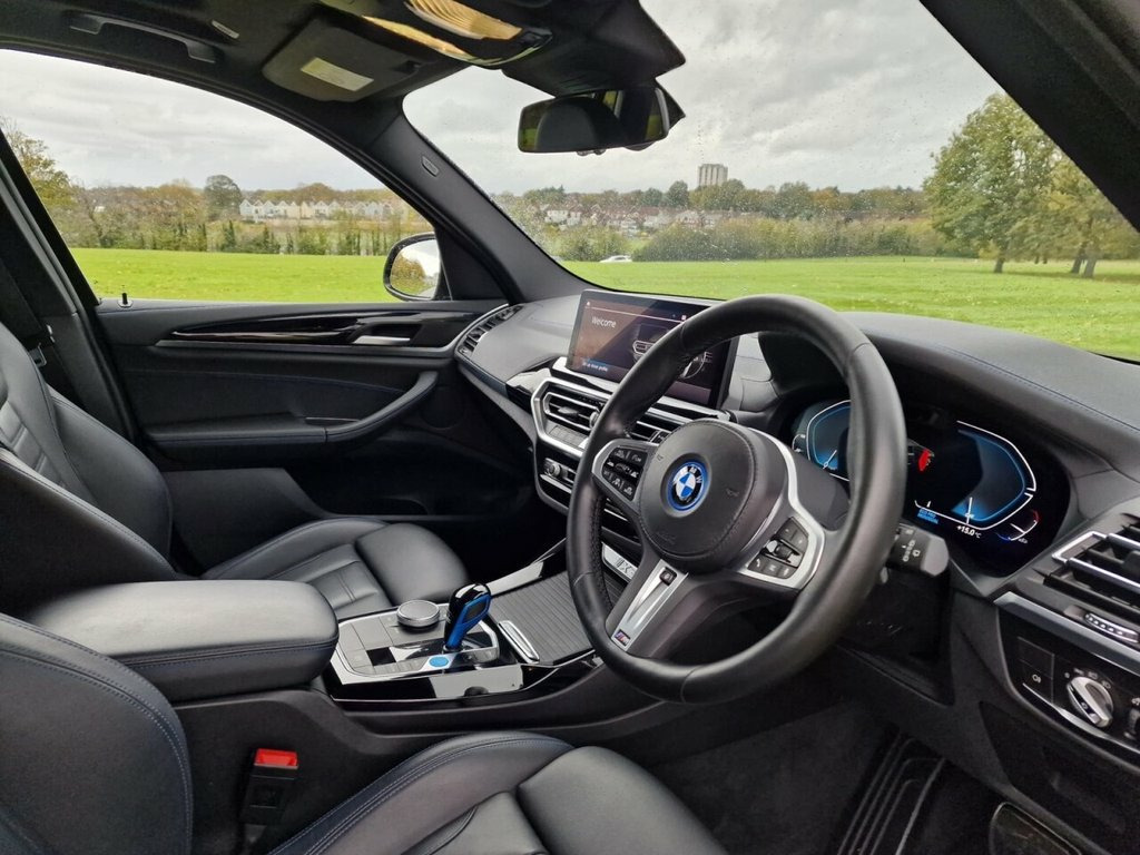 PANORAMIC ROOF, GREAT SPEC. VAT QUALIFYING This 2022 BMW iX3 M Sport is a superb example, having had only one owner since new. As an all electric vehicle, it offers a substantial battery total capacity of 80 kWh, providing a maximum range of 285 miles when new. This impressive electric SUV comes equipped with a suite of desirable features, including heated seats for both the driver and front passenger, front and rear parking sensors, and a reversing assist camera to aid manoeuvrability. The Rain Sensor with Automatic Headlight Activation ensures visibility is always optimised, while the BMW Live Cockpit Professional, complete with Bluetooth connectivity, keeps you informed and entertained. The electric powertrain of this iX3 M Sport is designed for both efficiency and convenience. A full charge at home using a 7kW charger takes approximately 11 hours and 20 minutes, perfect for overnight top ups. For faster charging on the go, it can reach 80% capacity from empty in just 32 minutes at a public charging station. These charging times, combined with its 285 mile maximum range, demonstrate how this BMW iX3 M Sport offers a compelling and practical electric driving experience, setting it apart from many other vehicles in its class. 19in Alloy Wheels - Aerodynamic - Jet Bl, ABS - Anti Lock Braking System, Active Guard Plus, Active Protection, Adaptive LED Headlights, Adaptive Suspension, Air Breather with BMW M logo, Air Conditioning - Automatic, Airbags - Driver and Front Passenger, Airbags - Front Side for Driver and Pass, Airbags - Head - Front and Rear, Alarm System, Ambient Lighting, Armrests, Attentiveness Assistant, Automatic Operation of Tailgate, Automatic Start-Stop Button, Backrest Width Adjustment for Driver, Blue Ring Around BMW Logos, BMW Connected Package Professional, BMW ConnectedDrive Online Services, BMW iDrive, BMW Legal Emergency Call, BMW Live Cockpit Professional, BMW TeleServices, Brake Pad Wear