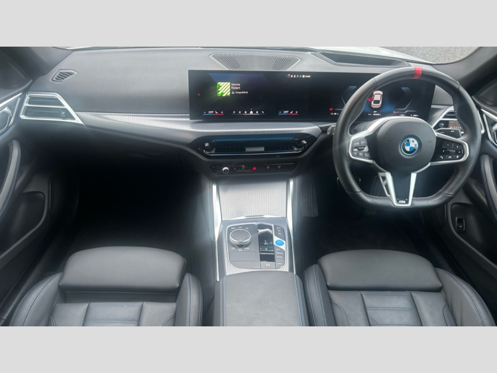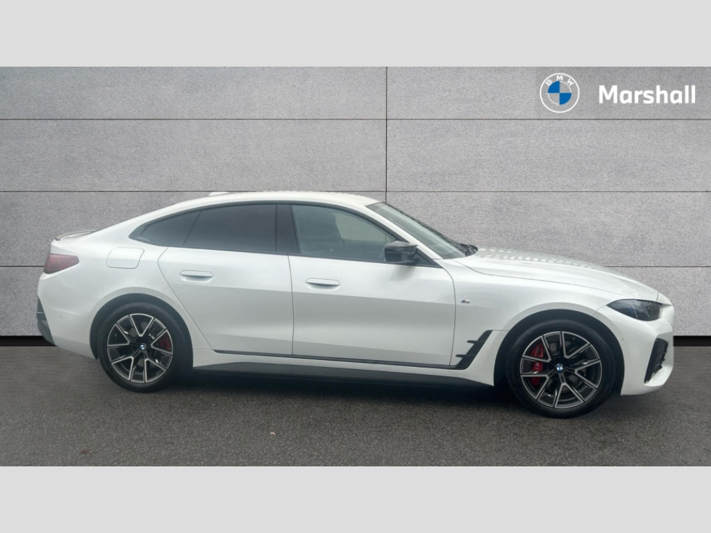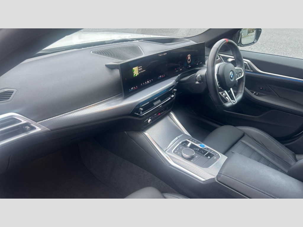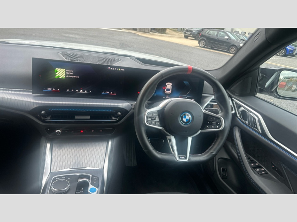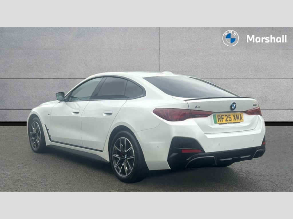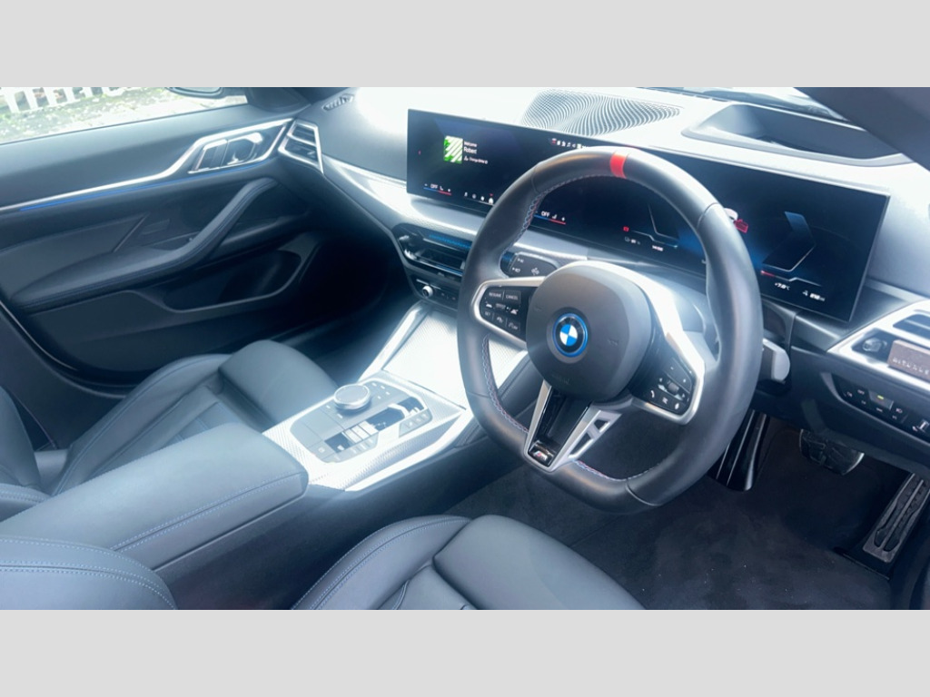 BMW I4 400kW M50 83.9kWh 5dr Auto [18 Alloy] 4G LTE connectivity, Active guard plus, Attentiveness assist, Automatic tailgate operation, Bluetooth Wi-Fi interface, BMW ConnectedDrive online services, BMW legal emergency call, BMW Maps, BMW remote services, BMW Teleservices, Drive off assistant, Driver profile, Driving experience switch, Electric boot lid, Engine start/stop button, iDrive touch controller, Integrated owners handbook, Language version English, Personal Profile - automatic lock when driving away selectable, Service interval indicator, Variable sports power steering, Widescreen display, AC charging up to 11kW, Adaptive M suspension, DC charging up to 150kW, eDrive exterior sound, Electric drive unit, Electronic differential lock, High voltage battery, Plug and charge, Public charging cable Mode 3, Safety battery terminal clamp, 1x USB type A with data transfer and 1.5 Amp charging function in the centre console, 1x USB type C with 3 Amp charging function in the front centre armrest, BMW iconic sound electric, DAB tuner, Personal eSim, BMW badge on bonnet and tailgate with blue ring around the badge, BMW radiator grille with mesh grille/end face of the nuggets in quartz silver matt, Body colour door handles, Diffuser panel highlights in frozen grey, Electric adjustable exterior mirrors, Electric windows with trap release and convenient opening/closing feature, Extended high gloss shadow line exterior trim, Exterior air inlets in front bumper in high gloss black, Exterior mirror heated, Fading support, Follow me home headlights, Front and rear bumper system, Front apron plastic in body colour, Fuel filler flap - right rear in body colour, Headlight beam throw control, Heat protection glazing on front windows and windscreen, Heated washer jets, High gloss black radiator grille frame, High gloss shadow line exterior trim, I badge with blue highlight on front ornamental grille, I4 charging socket flap, right, rear in body colour, Integrated outside door handles, flush design, flush integrated, handle recess indirectly illuminated, Lateral blue accent including air breather, LED 3rd brake light, LED daytime running lights, LED direction indicator lenses, LED eyebrow light, LED front fog lights, LED rear fog light, LED rear lights, M entry sills, M logo on radiator grille and front side panel, Mirror glass aspheric on driver's side, convex on passenger side, Model badge and M badge in pearl chrome, Model logo - Rear and right model designation, Rear left i4 inscription, Number plate panel integrated into front bumper and tailgate, One piece front bumper cover including towing eye cover in body colour, Rain sensor including auto headlights activation, Rear bumper with blue accent, Rear side wing doors, Rear wiper, Reversing light, Roof fin in body colour, Side frame trim strip in high gloss black, Side LED indicators, Sun protection glass, Trailer stabilisation logic, Turn indicators in side mirrors, Visible VIN plate, Welcome lighting, Window recess finisher strip in high gloss black, 12V power socket in front centre console with blanking plug, 2 front cupholder in centre console with clamping elements and matt black inlay, 3 seat bench in 2nd row, 3 spoke flat bottom M sport leather steering wheel, 40:20:40 split folding rear seat and rear centre armrest with two cupholders, Adjustable steering column, Aluminium door sill strips front with BMW i inscription, Ambient inside door handle light, Ambient light design projected onto the left and right entering and exiting area, Ambient lighting front and rear with 9 selectable colours, Ambient storage compartment lighting in the centre console, Anthracite headlining, Automatic air conditioning with 3 zone control, Battery in luggage compartment, BMW ID, Contour lighting in instrument panel and door trim panel, Dynamic function of contour lighting - welcome, goodbye, open doors, phone call, Electric memory seats and electrically adjustable seat height, backrest tilt, seat position, seat base tilt, memory for driver seat, exterior mirror, Front ambient footwell lighting, Front and rear armrest with integrated door trim, Front and rear door exit lights, Front and rear door pockets, Glovebox light, Headrests for all seats, Illuminated armrest storage compartment, Interior light and reading light, Lashing eyelets in boot, Light projection of an ambient lighting graphic, Luggage compartment light, Multifunction steering wheel, Rear storage compartment, Single front passenger seat, Storage tray and compartment with cover in centre console, Sunvisors with illuminated vanity mirrors and ticket pocket, Through loading system, Toolkit in luggage compartment, Velour floor mats, Connected package professional - I4, Interior and exterior mirror pack - I4, M Sport exterior styling pack - I4, 3 point seatbelts on all seats, Acoustic protection for pedestrians, Active protection, Anti lock braking system (ABS) with brake assist, Automatic Stability Control (ASC), Battery safety cut-off, Brake drying, Brake energy regeneration, Brake pretensioning, Child lock button on rear side window, Cornering brake control (CBC), Crash sensor, Driver and front passenger airbags, Driver and passenger side airbags, Driver/passenger seat occupancy sensor, DSC - Dynamic Stability Control, Dynamic brake control, Dynamic Traction Control - DTC, Electromechanical parking brake, Front and rear ventilated brake disc, Front passenger airbag deactivation, Head airbags for all 4 outer seats, Hill start assistant, ISOFIX child seat mounting on rear outer seats, Recuperation system, Side impact protection, Twin horns, Tyre pressure sensor, Warning triangle and first aid kit, Alarm system, Central locking including 2 vehicle keys with integrated emergency key, Central locking switch, Electronic vehicle immobiliser, Locking wheel bolts, Sensatec dashboard, Tyre repair kit plus