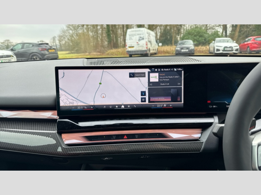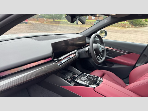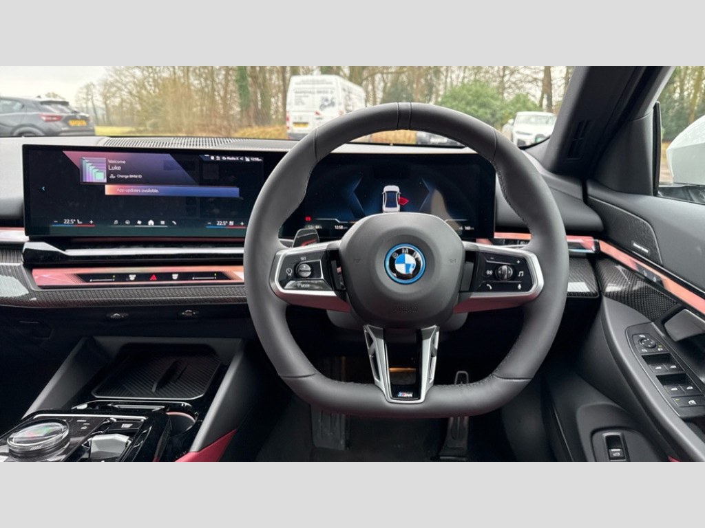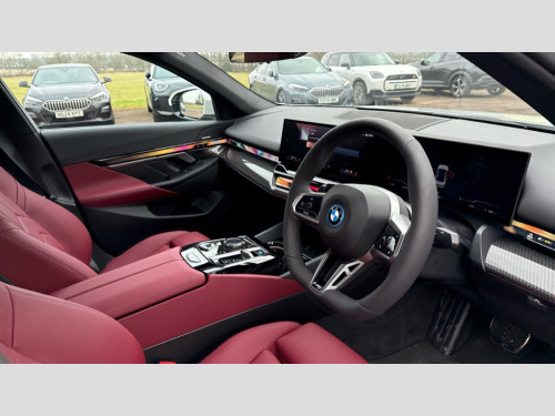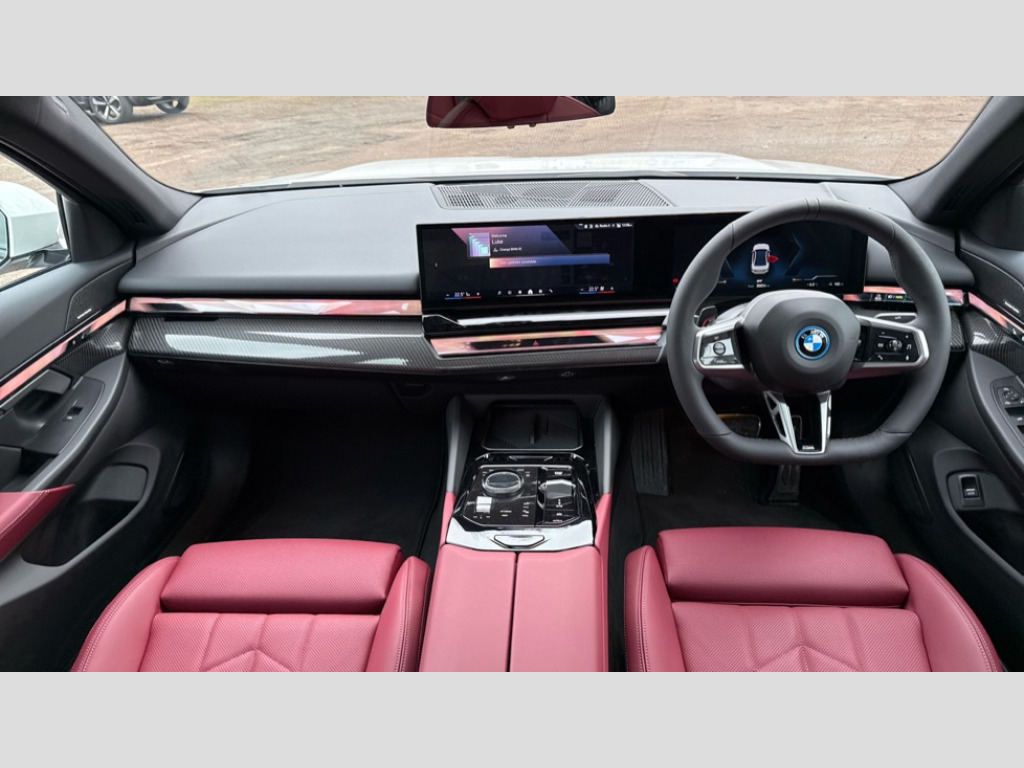 BMW I5 250kW eDrive40 M Sport 84kWh 4dr Auto BMW ConnectedDrive online services, BMW Iconic sounds electric, BMW legal emergency call, BMW Teleservices, Brake pad wear indicator, Cruise control with brake assist, Driving Assistant Plus Preparation, Front collision warning with brake intervention, Lane departure warning with active return, Left turn warning with brake function, Multifunctional instrument panel, Oil sensor for level and grade, On board computer inc. average speed, fuel consumption, liquid crystal Info display, journey computer, outside temperature display, personal profile, On-board diagnosis - OBD, PAS, Personal e-SIM, Powered by Operating System 7.0, Run flat indicator, Service interval indicator, Speed limit Info with manual speed limit assist, AC charging cable professional (mode 3) for public charging, AC charging up to 11kW, DAB tuner, Acoustic glazing, Adaptive LED Headlights, Automatic cornering lights, Automatic windscreen wipers and automatic headlight, BMW selective beam, Body colour door handles, Body coloured bumpers, Dynamic brake lights with LED technology, Electric front and rear windows with fingertip open/close + anti-trap facility and comfort closing function, Follow me home headlight function, Headlight elements in blue, Heated windscreen washer jets, LED daytime running lights, LED third brake light, Light colour close to that of ordinary daylight, Optimum, homogeneous illumination of the road, Rear boot, Rear side wing doors, 2 zone automatic air conditioning, 3 seat bench in 2nd row, 3 spoke leather M steering wheel in BMW M specific design with M badge, Armrest - front and rear integrated door trim, centre console includes storage compartment, rear centre includes 2 cupholders, Electric adjustable front sports seats, Electrically adjustable lumbar support for driver and front passenger, Heated driver and front passenger seats, High-gloss black door switch cluster, power window switch and tailgate button on first and second row seat, M Anthracite headlining, M Sport pedal covers in stainless steel, Rear headrests, Single front passenger seat, Through loading system with 40/20/40 rear seat backrest split, Velour floormats, Wireless charging tray, Ambient lighting pack - 5 Series/I5, Connected package professional - 5 Series/I5, Driving assistance pack - 5 Series/I5, Expanded exterior mirror package - 5 series/I5, M high gloss shadow line pack - 5 Series/ I5, M Sport exterior styling pack - 5 Series/I5, 3 rear three point seatbelts, Acoustic protection for pedestrians, Active protection, Airbag deployment is controlled with respect to the intensity and scope, Anti-lock braking system (ABS), Brake assist, Brake energy regeneration, Cornering brake control (CBC), Crash sensor activating central locking release, hazard warning lights, fuel cut off and interior lighting, Driver and front passenger airbags, Driver central airbag, Driver/front passenger side airbags, DSC - Dynamic Stability Control, Dynamic brake control, Dynamic Traction Control - DTC, Electromechanical parking brake with automatic drive away release and auto hold function, Electronic brake force distribution, Engine drag torque control, Front and rear brake discs with interior ventilation, Front and rear curtain airbags, Front head restraints with anti-whiplash, Head airbags for first and second row seats, Hill start assist, Locking of doors after driving off, M Sport brakes in dark blue metallic painted brake callipers with M designation, Mechanical child proof lock on rear doors, PC iBrake PostCrash approach control warning with light braking function, Side impact protection, Trailer stability control, Two tone horn, Tyre pressure monitoring system, Warning triangle and first aid kit, Alarm system, Locking wheel bolts including wheel bolt adapter, Tyre repair kit plus