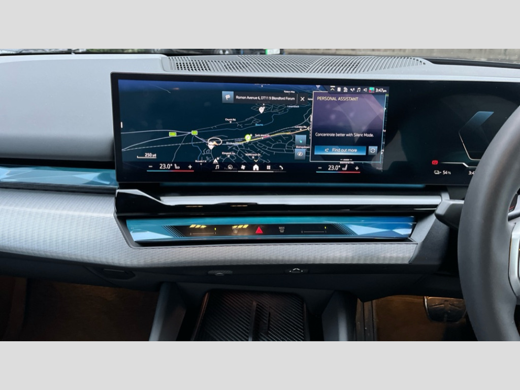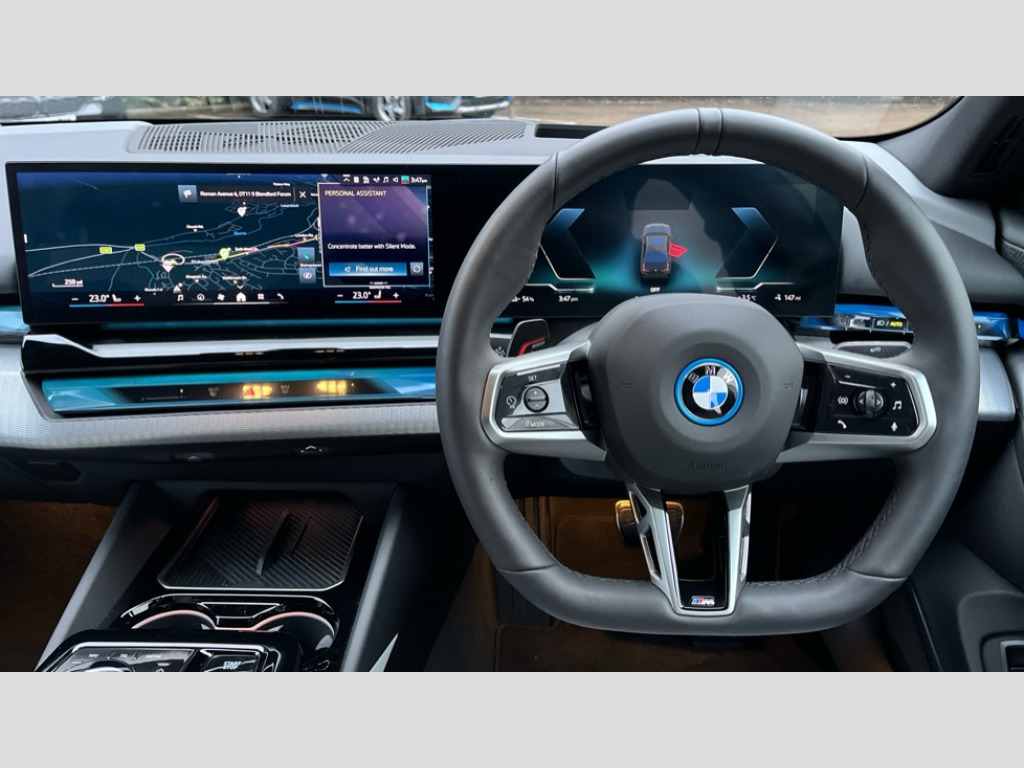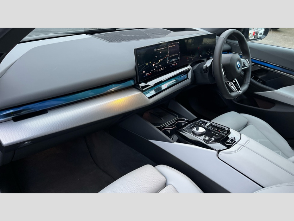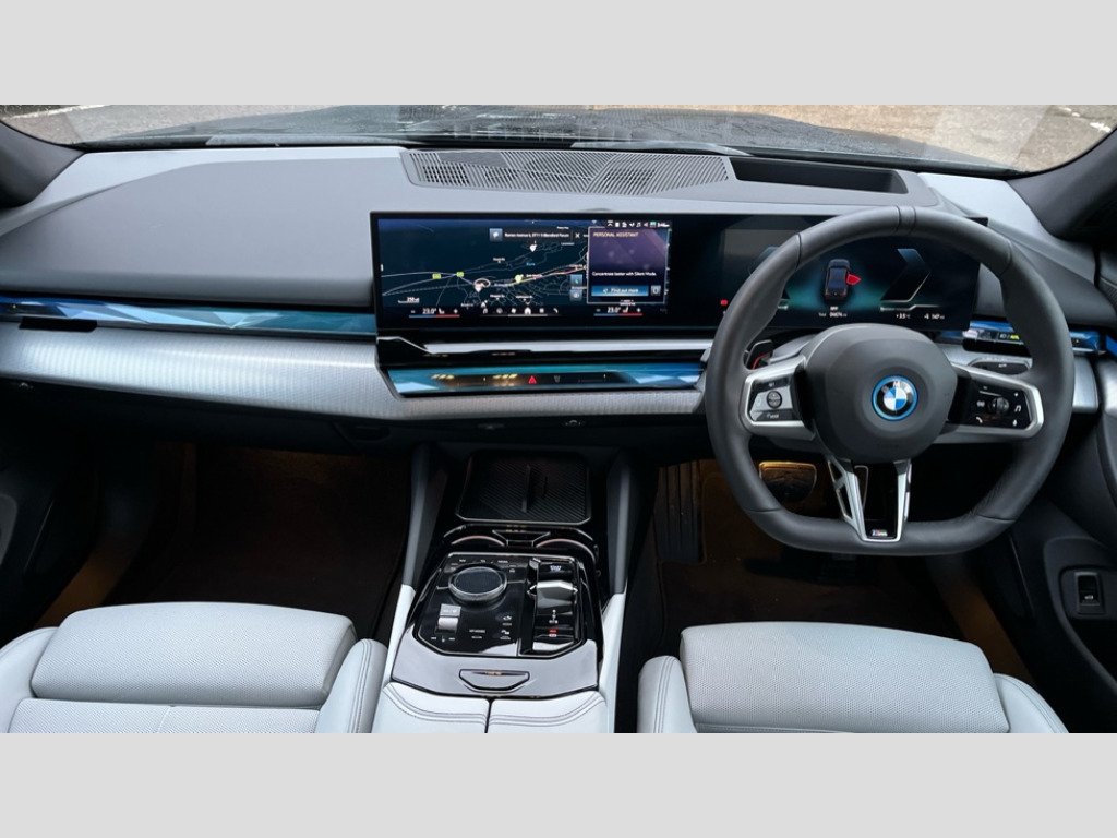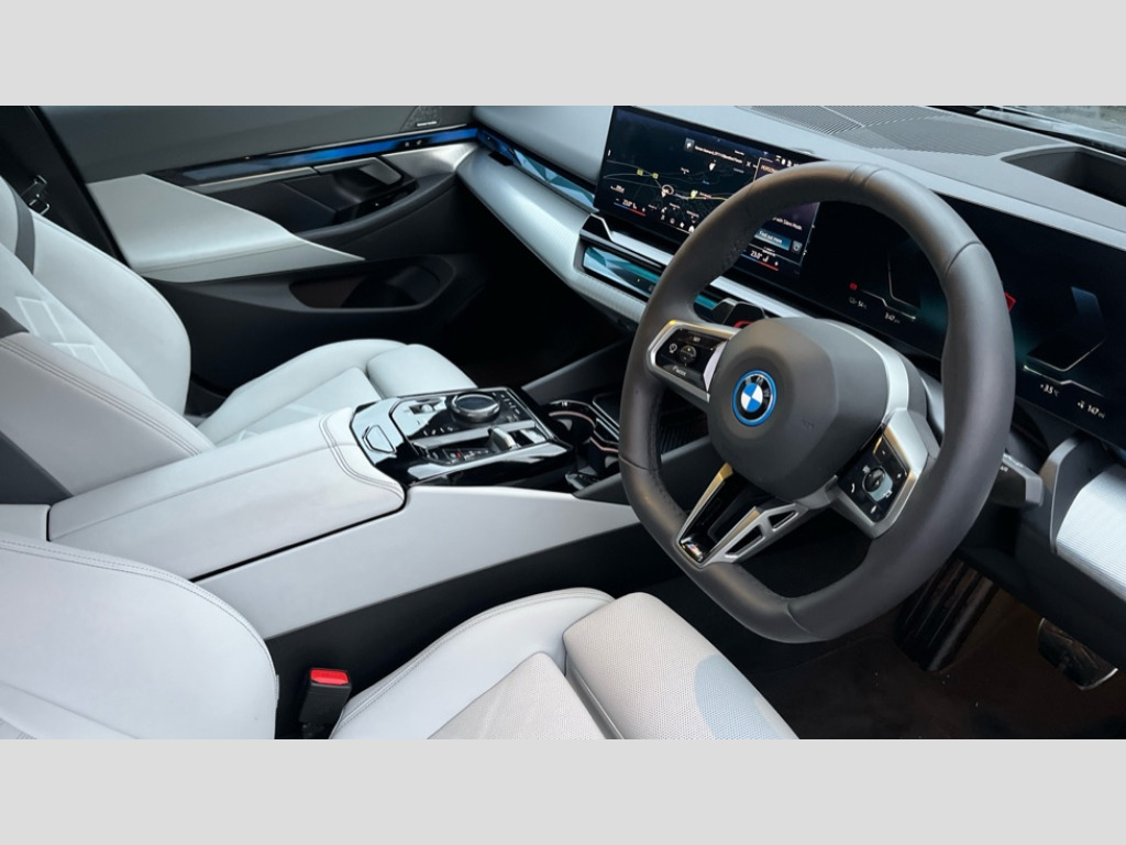 BMW I5 250kW eDrive40 M Sport 84kWh 4dr Auto BMW ConnectedDrive online services, BMW Iconic sounds electric, BMW legal emergency call, BMW Teleservices, Brake pad wear indicator, Cruise control with brake assist, Driving Assistant Plus Preparation, Front collision warning with brake intervention, Lane departure warning with active return, Left turn warning with brake function, Multifunctional instrument panel, Oil sensor for level and grade, On board computer inc. average speed, fuel consumption, liquid crystal Info display, journey computer, outside temperature display, personal profile, On-board diagnosis - OBD, PAS, Personal e-SIM, Powered by Operating System 7.0, Run flat indicator, Service interval indicator, Speed limit Info with manual speed limit assist, AC charging cable professional (mode 3) for public charging, AC charging up to 11kW, DAB tuner, Acoustic glazing, Adaptive LED Headlights, Automatic cornering lights, Automatic windscreen wipers and automatic headlight, BMW selective beam, Body colour door handles, Body coloured bumpers, Dynamic brake lights with LED technology, Electric front and rear windows with fingertip open/close + anti-trap facility and comfort closing function, Follow me home headlight function, Headlight elements in blue, Heated windscreen washer jets, LED daytime running lights, LED third brake light, Light colour close to that of ordinary daylight, Optimum, homogeneous illumination of the road, Rear boot, Rear side wing doors, 2 zone automatic air conditioning, 3 seat bench in 2nd row, 3 spoke leather M steering wheel in BMW M specific design with M badge, Armrest - front and rear integrated door trim, centre console includes storage compartment, rear centre includes 2 cupholders, Coat hook on upper B-pillar panel, Electrically adjustable lumbar support for driver and front passenger, Heated driver and front passenger seats, High-gloss black door switch cluster, power window switch and tailgate button on first and second row seat, M Anthracite headlining, M Sport pedal covers in stainless steel, Rear headrests, Single front passenger seat, Through loading system with 40/20/40 rear seat backrest split, Velour floormats, Wireless charging tray, Ambient lighting pack - 5 Series/I5, Connected package professional - 5 Series/I5, Driving assistance pack - 5 Series/I5, Expanded exterior mirror package - 5 series/I5, M high gloss shadow line pack - 5 Series/ I5, M Sport exterior styling pack - 5 Series/I5, 3 rear three point seatbelts, Acoustic protection for pedestrians, Active protection, Airbag deployment is controlled with respect to the intensity and scope, Anti-lock braking system (ABS), Brake assist, Brake energy regeneration, Cornering brake control (CBC), Crash sensor activating central locking release, hazard warning lights, fuel cut off and interior lighting, Driver and front passenger airbags, Driver central airbag, Driver/front passenger side airbags, DSC - Dynamic Stability Control, Dynamic brake control, Dynamic Traction Control - DTC, Electromechanical parking brake with automatic drive away release and auto hold function, Electronic brake force distribution, Engine drag torque control, Front and rear brake discs with interior ventilation, Front and rear curtain airbags, Front head restraints with anti-whiplash, Head airbags for first and second row seats, Hill start assist, Locking of doors after driving off, M Sport brake in blue high gloss painted brake callipers with monochrome logo on front calliper, Mechanical child proof lock on rear doors, PC iBrake PostCrash approach control warning with light braking function, Side impact protection, Trailer stability control, Two tone horn, Tyre pressure monitoring system, Warning triangle and first aid kit, Alarm system, Locking wheel bolts including wheel bolt adapter, Tyre repair kit plus
