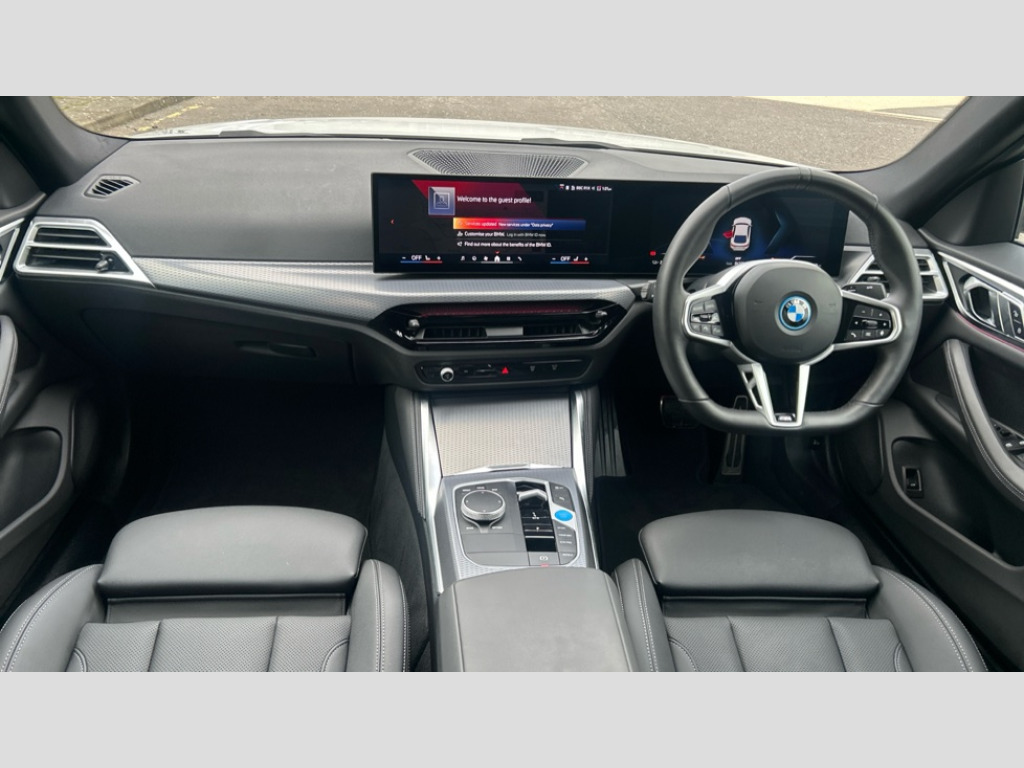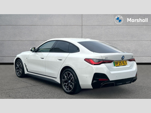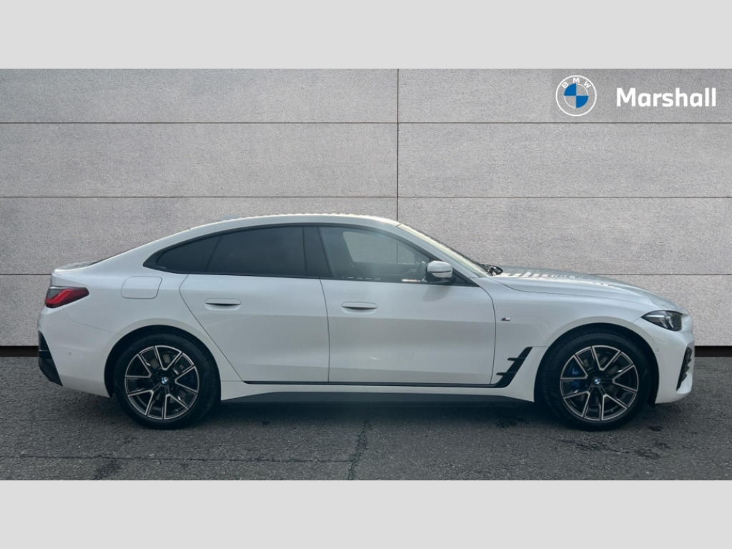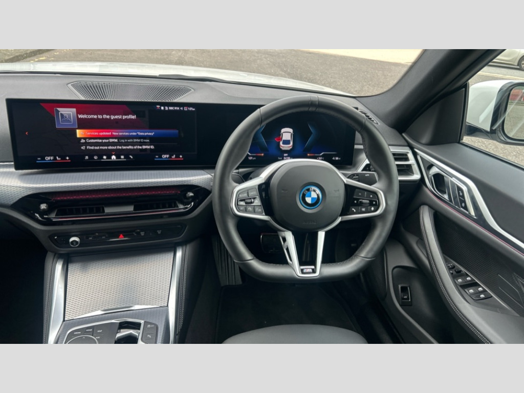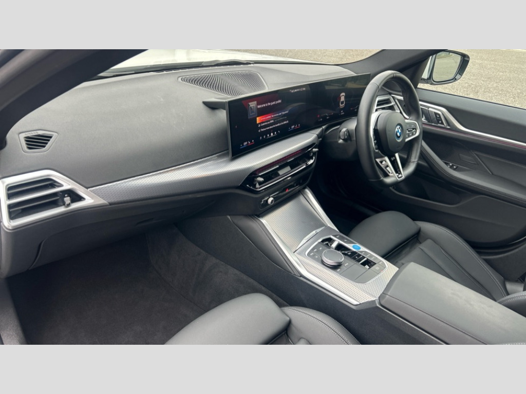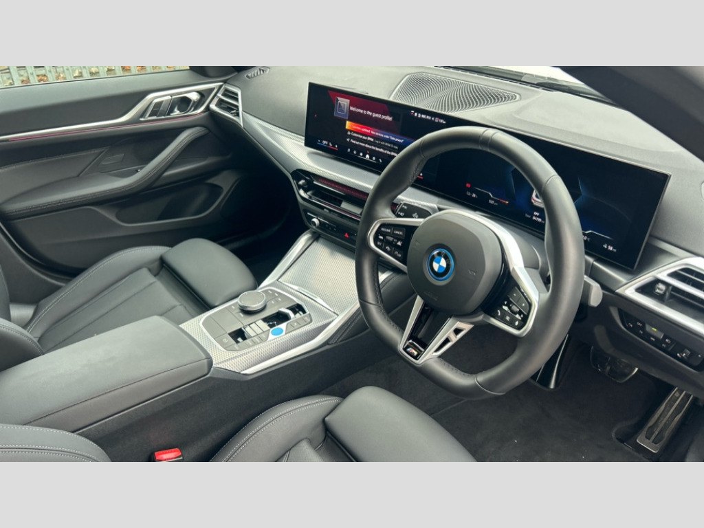 BMW I4 210kW eDrive35 M Sport 70kWh 5dr Auto 4G LTE connectivity, Active guard plus, Attentiveness assist, Automatic tailgate operation, Bluetooth Wi-Fi interface, BMW ConnectedDrive online services, BMW legal emergency call, BMW Maps, BMW remote services, BMW Teleservices, Drive off assistant, Driver profile, Driving experience switch, Electric boot lid, Engine start/stop button, iDrive touch controller, Integrated owners handbook, Language version English, Live cockpit plus with nav function 12.3" instrument cluster and 14.9" centre display, Personal Profile - automatic lock when driving away selectable, Service interval indicator, Widescreen display, AC charging up to 11kW, DC charging up to 150kW, eDrive exterior sound, Electric drive unit, Electronic differential lock, High voltage battery, Plug and charge, Public charging cable Mode 3, Safety battery terminal clamp, Silicon carbide inverter, 1x USB type A with data transfer and 1.5 Amp charging function in the centre console, 1x USB type C with 3 Amp charging function in the front centre armrest, DAB tuner, Personal eSim, BMW badge on bonnet and tailgate with blue ring around the badge, BMW radiator grille with mesh grille/end face of the nuggets in quartz silver matt, Body colour door handles, Body colour mirror caps with bottom segment in matt black, Electric adjustable exterior mirrors, Electric windows with trap release and convenient opening/closing feature, Electrochromic rear view mirror, Exterior mirror heated, Fading support, Follow me home headlights, Front and rear bumper system, Front apron plastic in body colour, Fuel filler flap - right rear in body colour, Headlight beam throw control, Heat protection glazing on front windows and windscreen, Heated washer jets, High gloss black mirror triangles, High gloss shadow line exterior trim, I badge with blue highlight on front ornamental grille, I4 charging socket flap, right, rear in body colour, Integrated outside door handles, flush design, flush integrated, handle recess indirectly illuminated, Lateral blue accent including air breather, LED 3rd brake light, LED daytime running lights, LED direction indicator lenses, LED eyebrow light, LED front fog lights, LED rear fog light, LED rear lights, M entry sills, Mirror glass aspheric on driver's side, convex on passenger side, Model logo - Rear and right model designation, Rear left i4 inscription, Number plate panel integrated into front bumper and tailgate, One piece front bumper cover including towing eye cover in body colour, Radiator grille frame in chrome matt, Rain sensor including auto headlights activation, Rear bumper with blue accent, Rear side wing doors, Rear wiper, Reversing light, Roof fin in body colour, Side frame trim strip in black matt, Side LED indicators, Side sills in high-gloss black with airbreathers in black, Trailer stabilisation logic, Turn indicators in side mirrors, Visible VIN plate, Welcome lighting, Window recess finisher strip in matt black, 12V power socket in front centre console with blanking plug, 2 front cupholder in centre console with clamping elements and matt black inlay, 3 seat bench in 2nd row, 3 spoke flat bottom M sport leather steering wheel, 40:20:40 split folding rear seat and rear centre armrest with two cupholders, Adjustable steering column, Aluminium door sill strips front with BMW i inscription, Ambient inside door handle light, Ambient light design projected onto the left and right entering and exiting area, Ambient lighting front and rear with 9 selectable colours, Ambient storage compartment lighting in the centre console, Anthracite headlining, Automatic air conditioning with 3 zone control, Battery in luggage compartment, BMW ID, Contour lighting in instrument panel and door trim panel, Dynamic function of contour lighting - welcome, goodbye, open doors, phone call, Front ambient footwell lighting, Front and rear armrest with integrated door trim, Front and rear door exit lights, Front and rear door pockets, Glovebox light, Headrests for all seats, Illuminated armrest storage compartment, Interior light and reading light, Lashing eyelets in boot, Light projection of an ambient lighting graphic, Luggage compartment light, Multifunction steering wheel, Rear storage compartment, Single front passenger seat, Storage tray and compartment with cover in centre console, Sunvisors with illuminated vanity mirrors and ticket pocket, Through loading system, Toolkit in luggage compartment, Velour floor mats, Connected package professional - I4, Interior and exterior mirror pack - I4, M Sport exterior styling pack - I4, Parking assistant pack - I4, 3 point seatbelts on all seats, Acoustic protection for pedestrians, Active protection, Anti lock braking system (ABS) with brake assist, Automatic Stability Control (ASC), Battery safety cut-off, Brake drying, Brake energy regeneration, Brake pretensioning, Child lock button on rear side window, Cornering brake control (CBC), Crash sensor, Driver and front passenger airbags, Driver and passenger side airbags, Driver/passenger seat occupancy sensor, DSC - Dynamic Stability Control, Dynamic brake control, Dynamic Traction Control - DTC, Electromechanical parking brake, Front and rear ventilated brake disc, Front passenger airbag deactivation, Head airbags for all 4 outer seats, Hill start assistant, ISOFIX child seat mounting on rear outer seats, M sport blue brake calipers, Recuperation system, Side impact protection, Sport brake calipers, Twin horns, Tyre pressure sensor, Warning triangle and first aid kit, Alarm system, Central locking including 2 vehicle keys with integrated emergency key, Central locking switch, Electronic vehicle immobiliser, Locking wheel bolts, Sensatec dashboard, Tyre repair kit plus